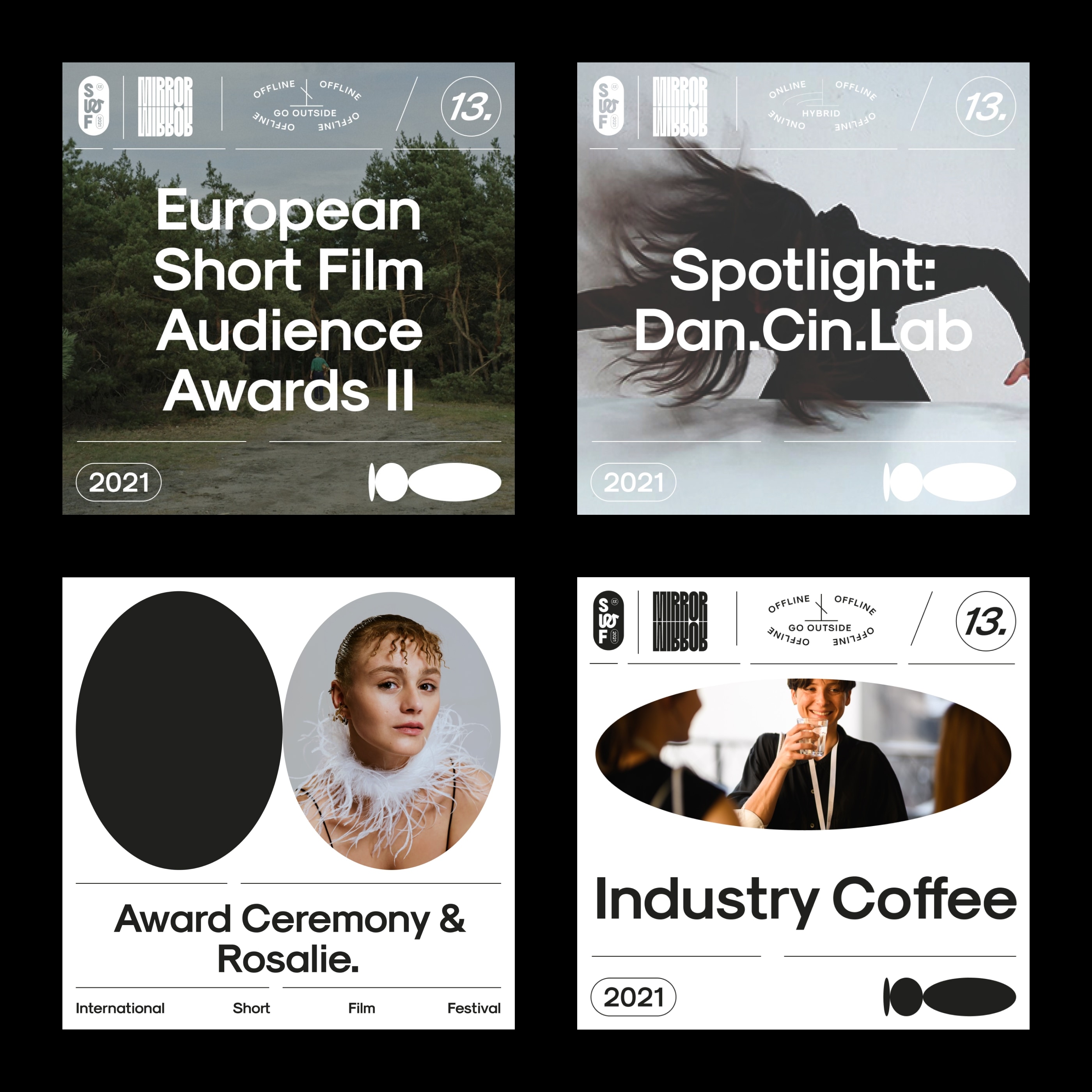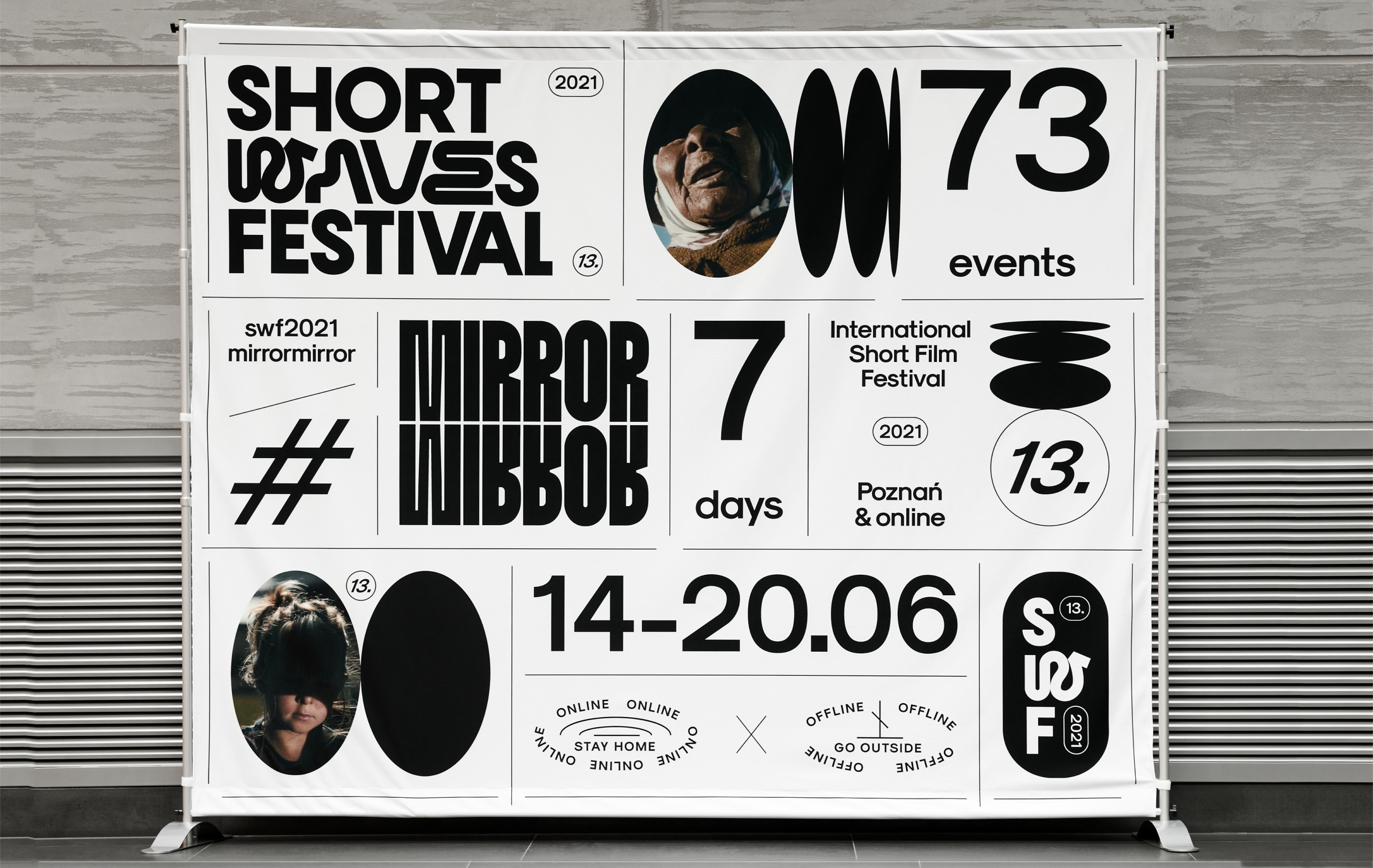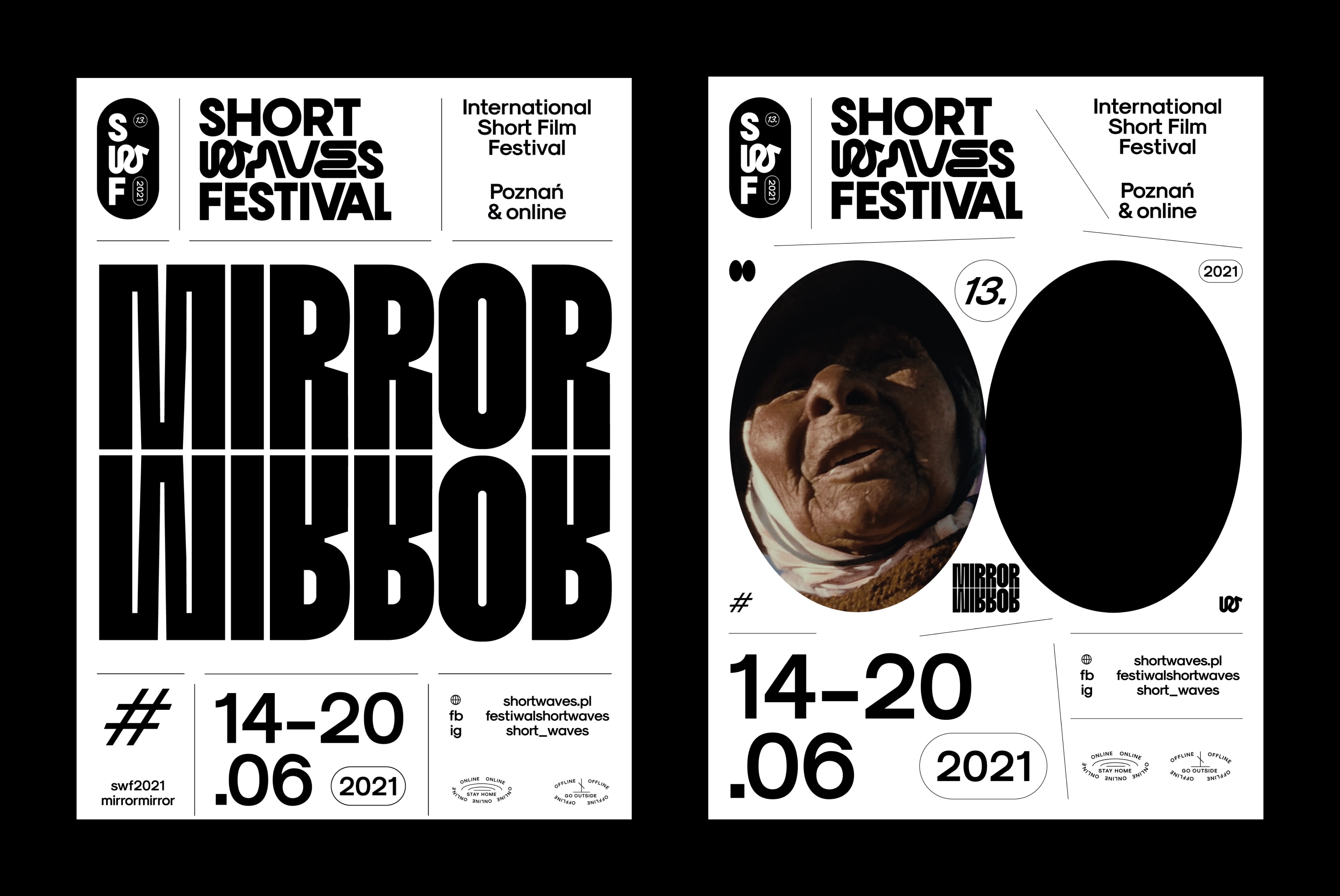 Short Waves Festival is an international short film festival which launched in 2009. In 2021 we redesigned the whole brand and created a visual identity of this year’s edition. Its main theme was “Mirror Mirror”. Why? There are multiple answers. It is first and foremost our new normal, our experiences, changes, and different reality that make us examine ourselves more intently. The pandemic has significantly intensified the Internet immersion and the dual functioning in online/offline mode.