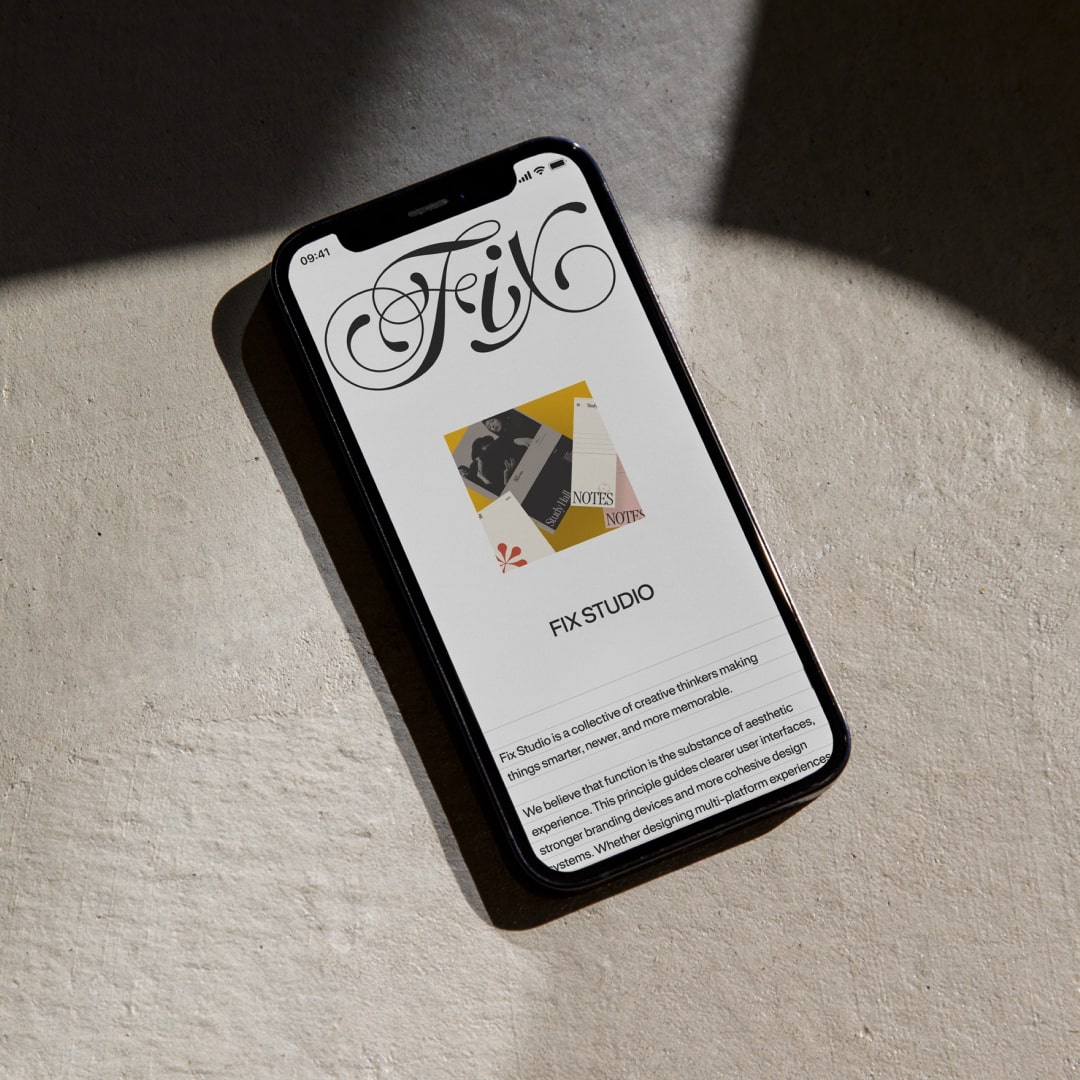 Moreover, the uniqueness of the typographic file also allows to group a set of possibilities, especially when some variants are thought. In the case of the logotype for Fix Studio, the curves of the capital F can be composed in a simple version with three drops or more ornate with four drops. The final x also exists in a more ornate capital variant. From these different optical sizes, it is a global system that can be deployed according to the needs, and without the need to go and find other files than the one of the dedicated typography.