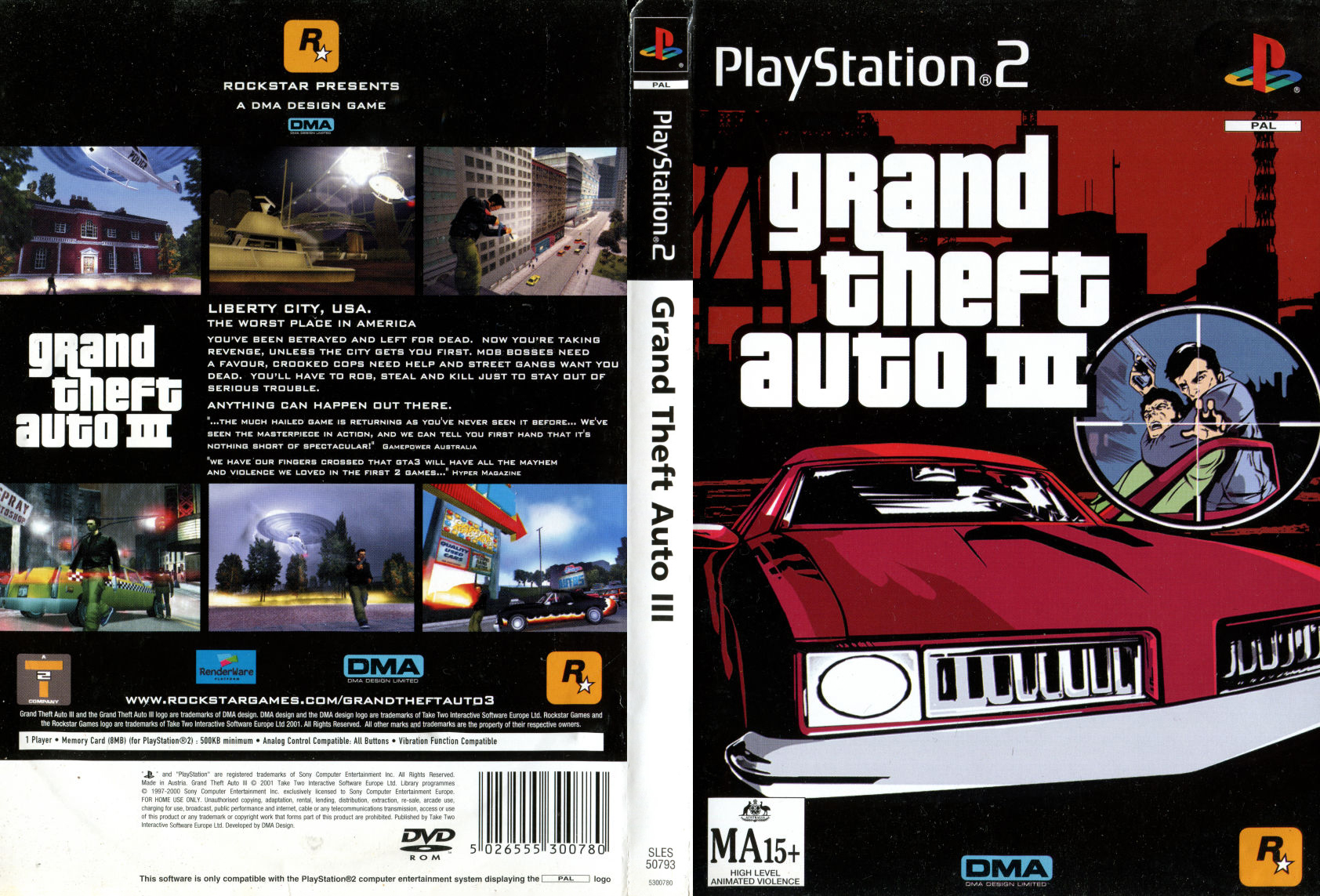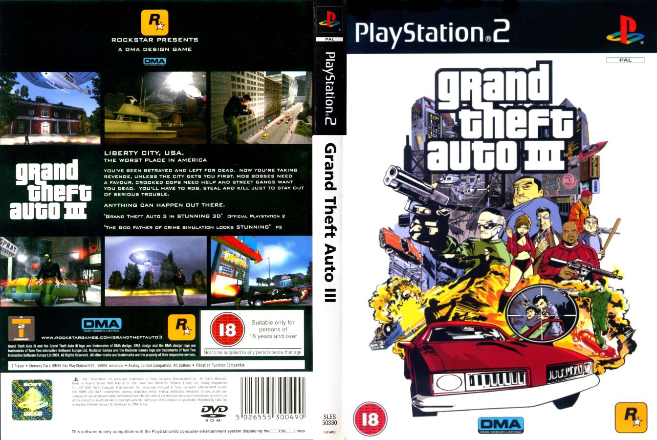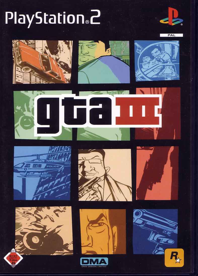 Alternate cover designs are used for the PS2 releases in North America, the United Kingdom and Australia. For the European release, the game’s title is abbreviated to GTA III and accompanied with the same cover illustration as the UK release, except for the German edition which uses an alternate design.