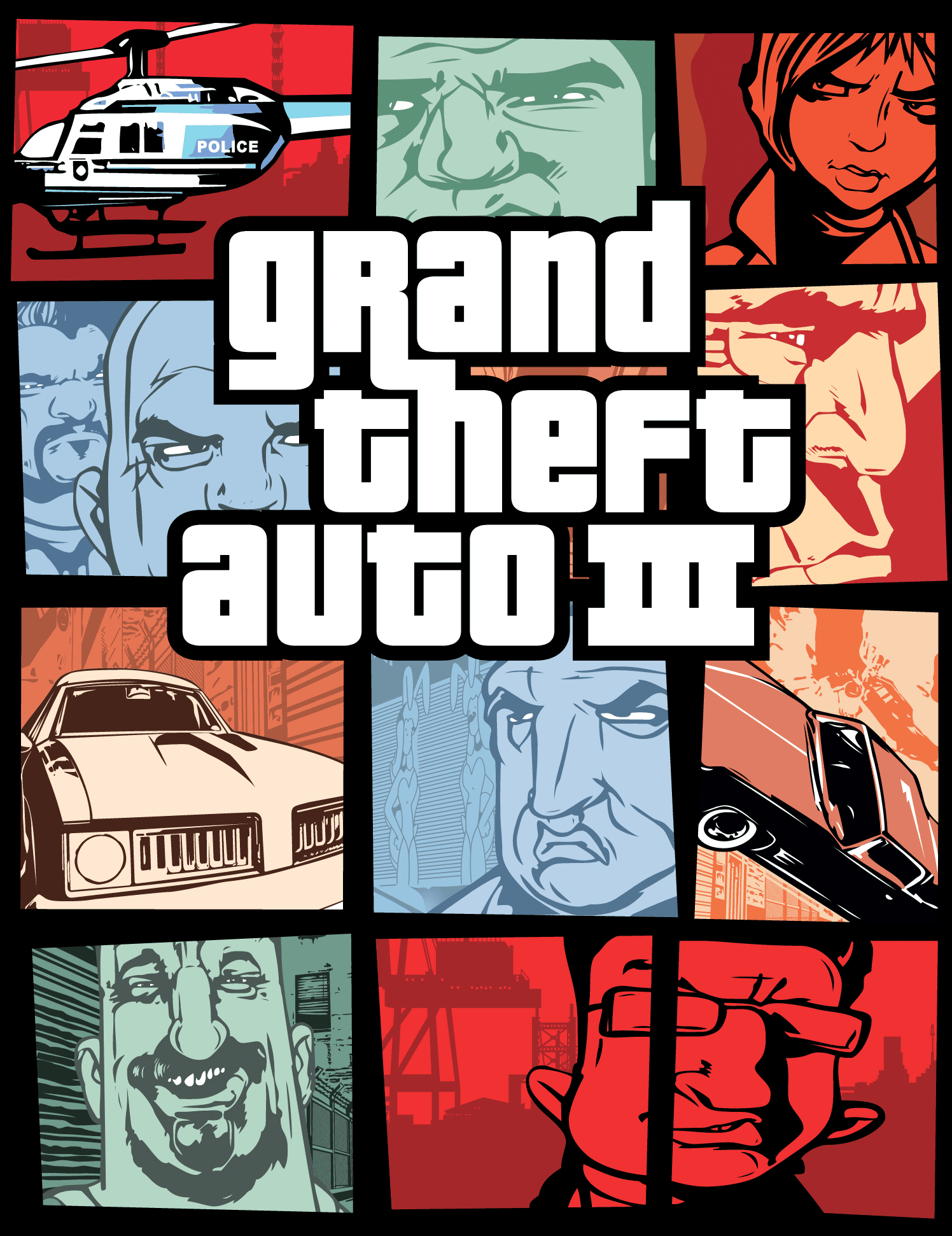 Cover design with illustration by Stephen Bliss for the 2001 action-adventure video game Grand Theft Auto III developed by DMA Design and published by Rockstar Games for the Sony PlayStation 2.