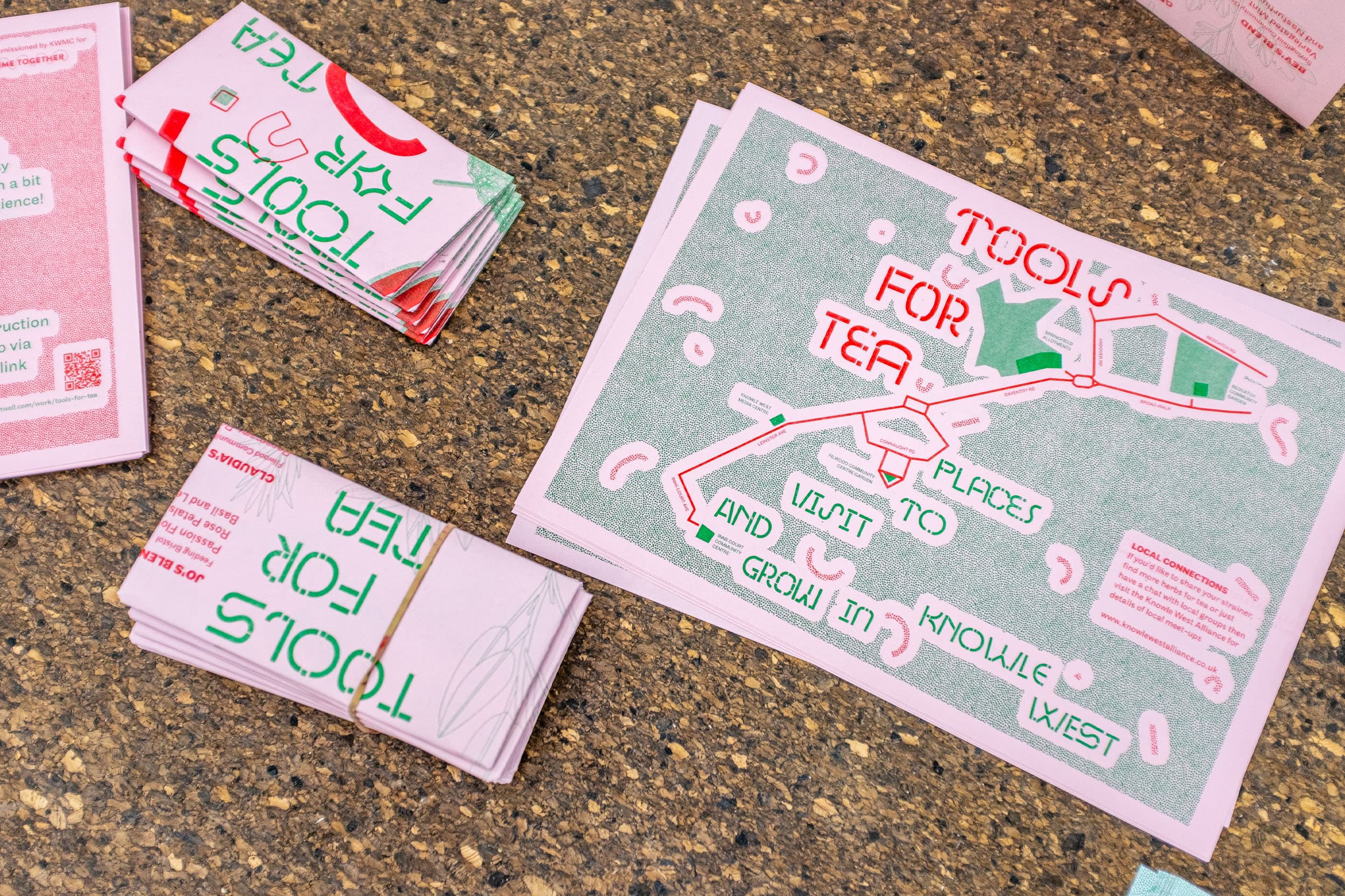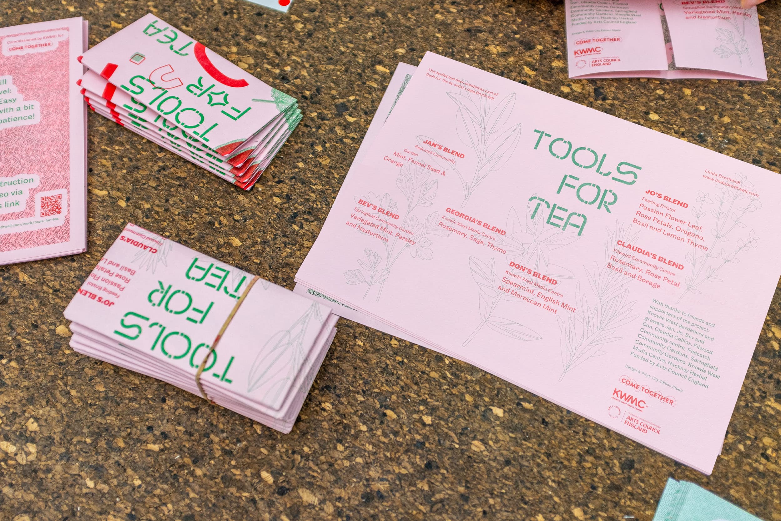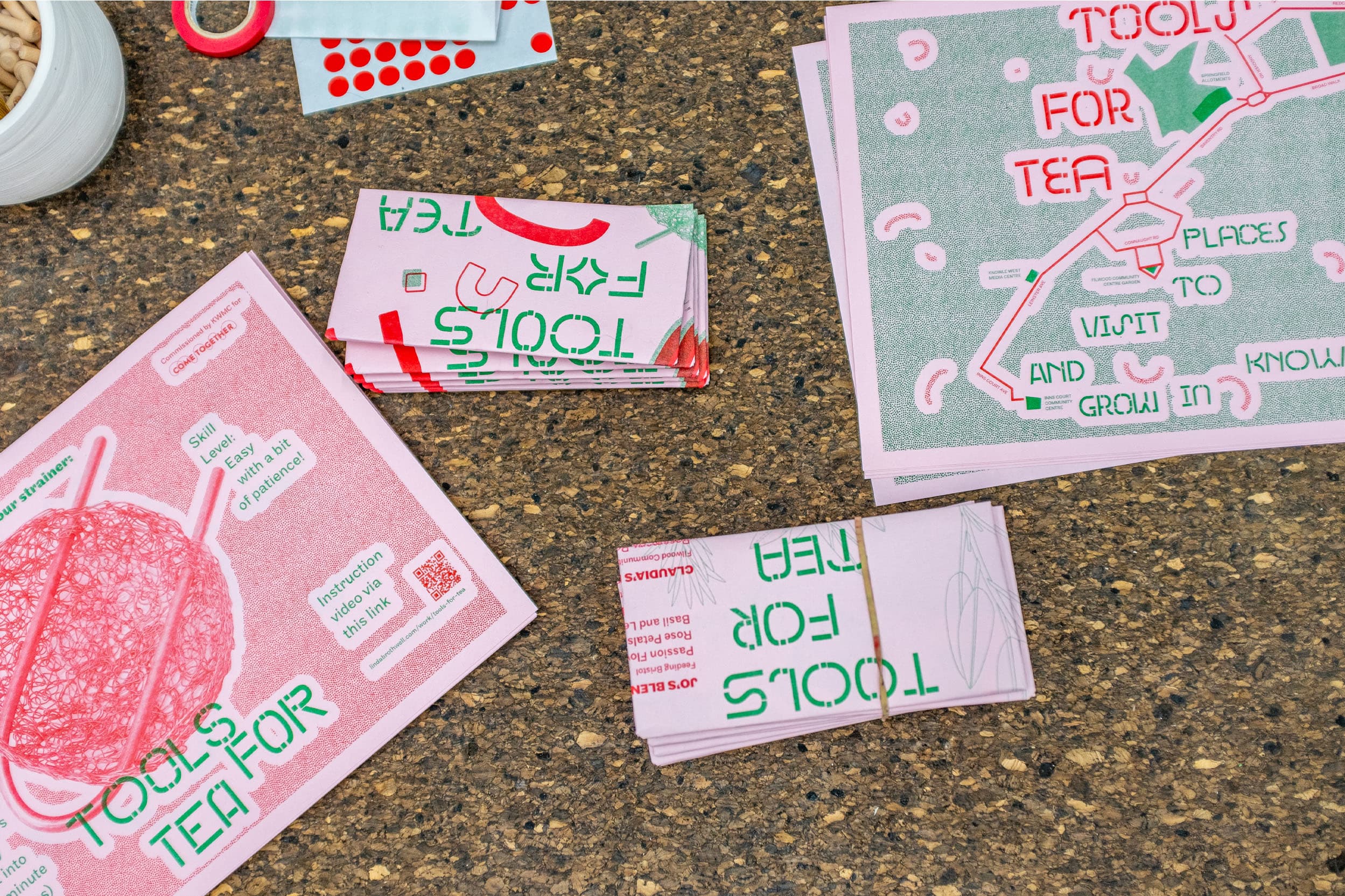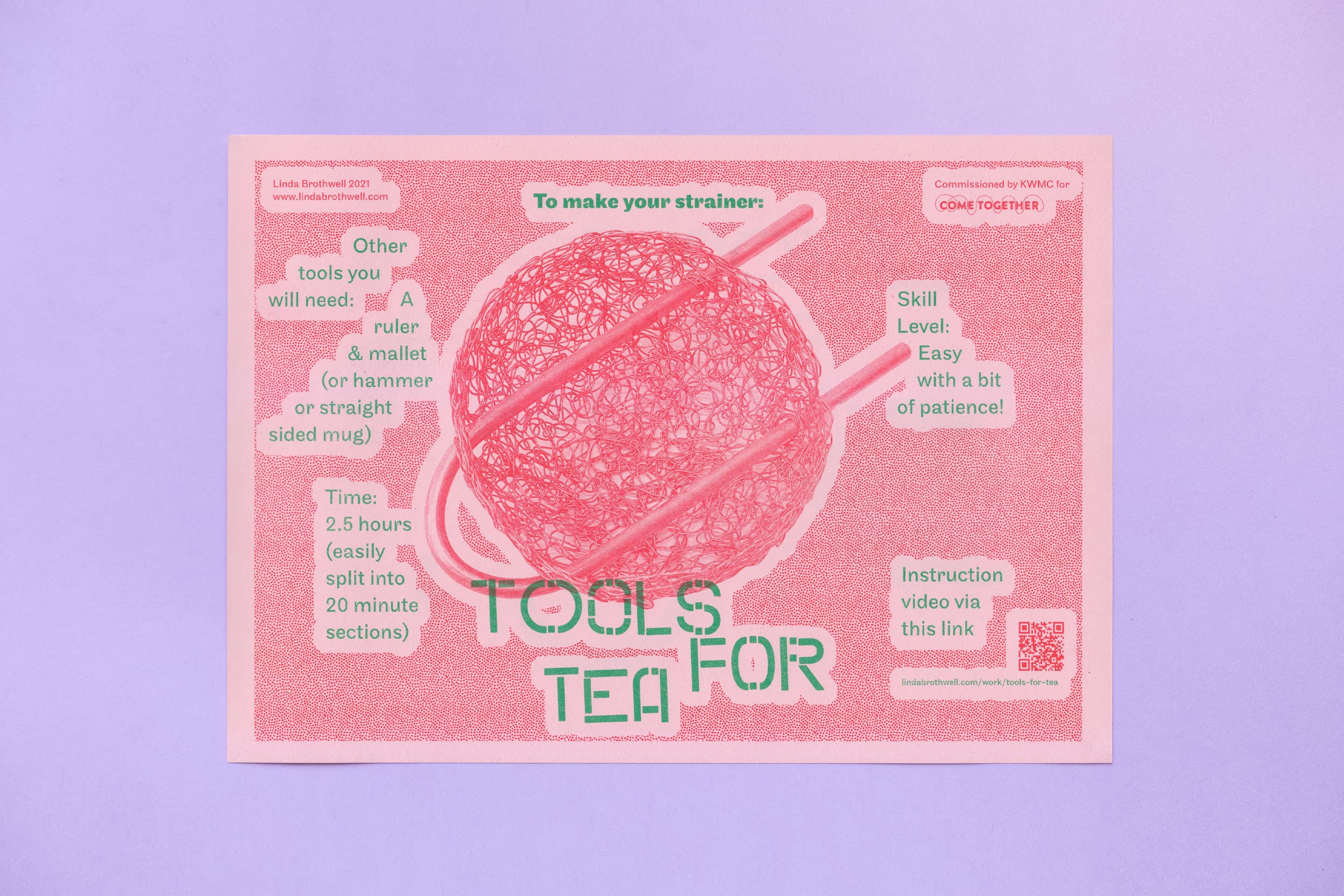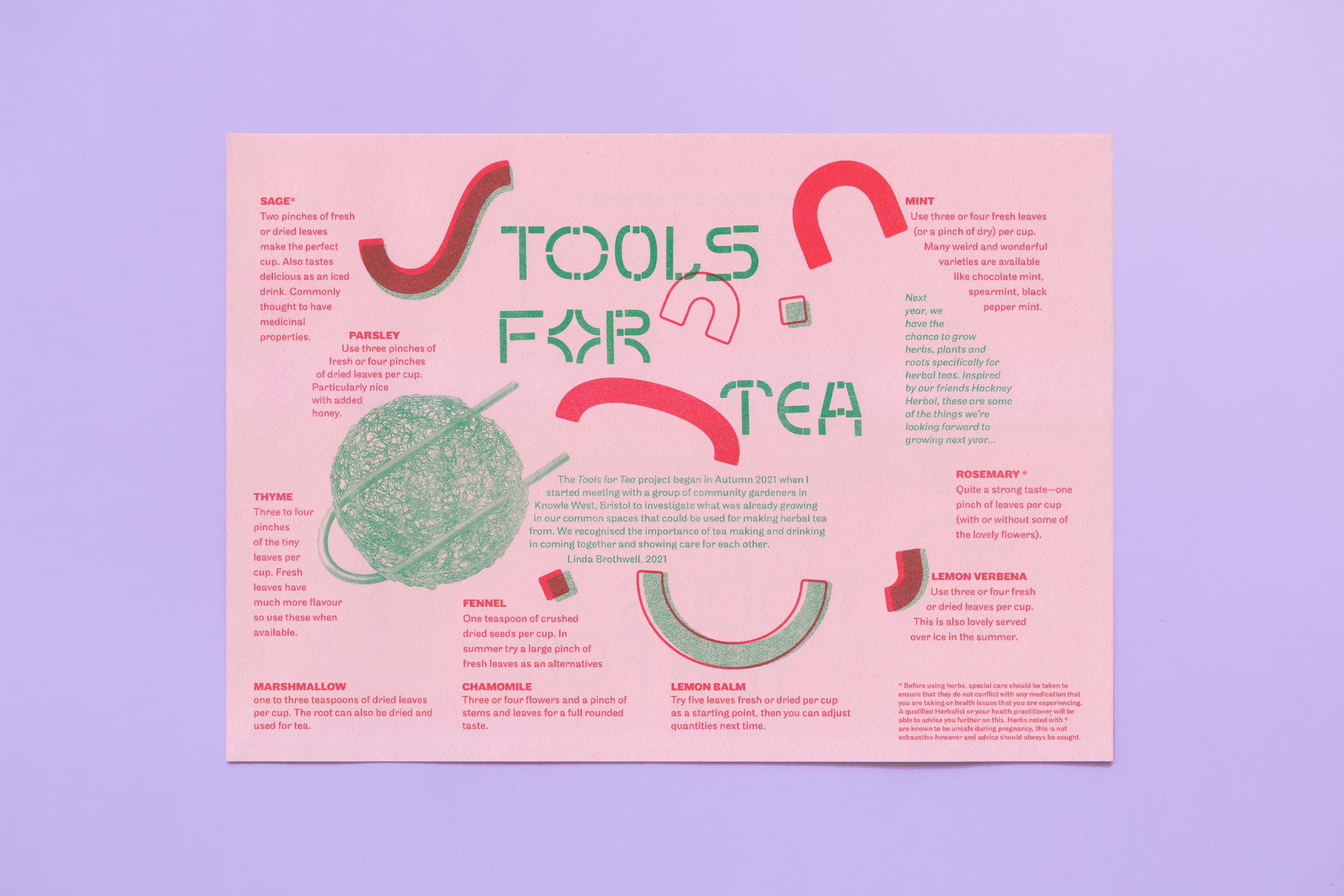Risographed leaflets for an edition by artist Linda Brothwell, part of Linda’s wider collaborative project working with community gardeners. The leaflet instructs the user how to make a tea strainer kit and use it at home.