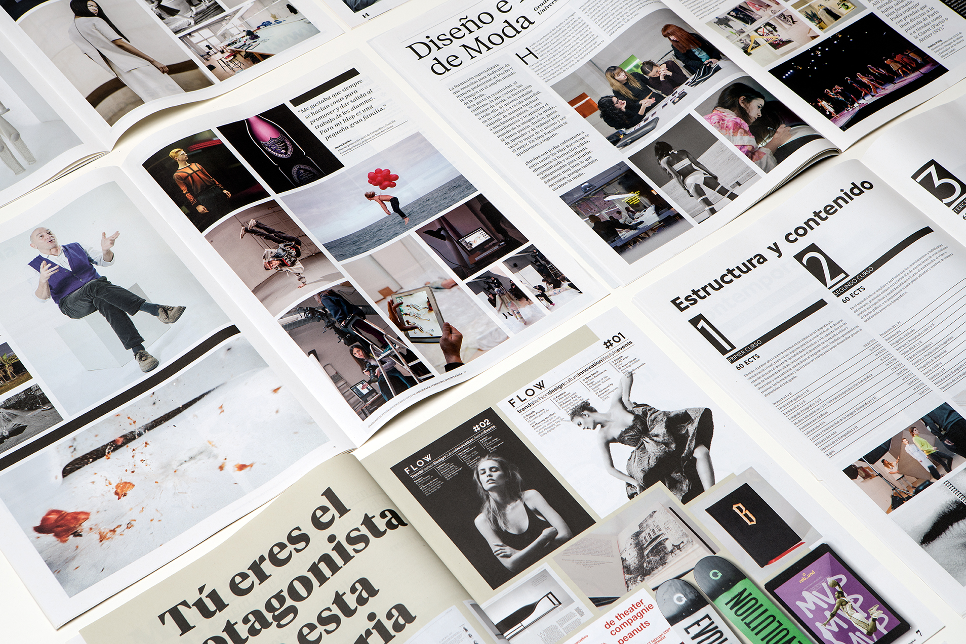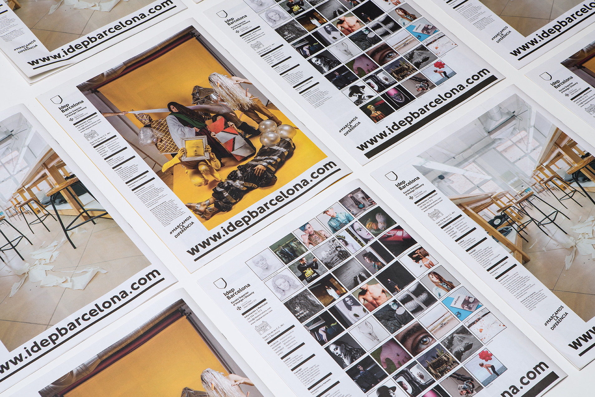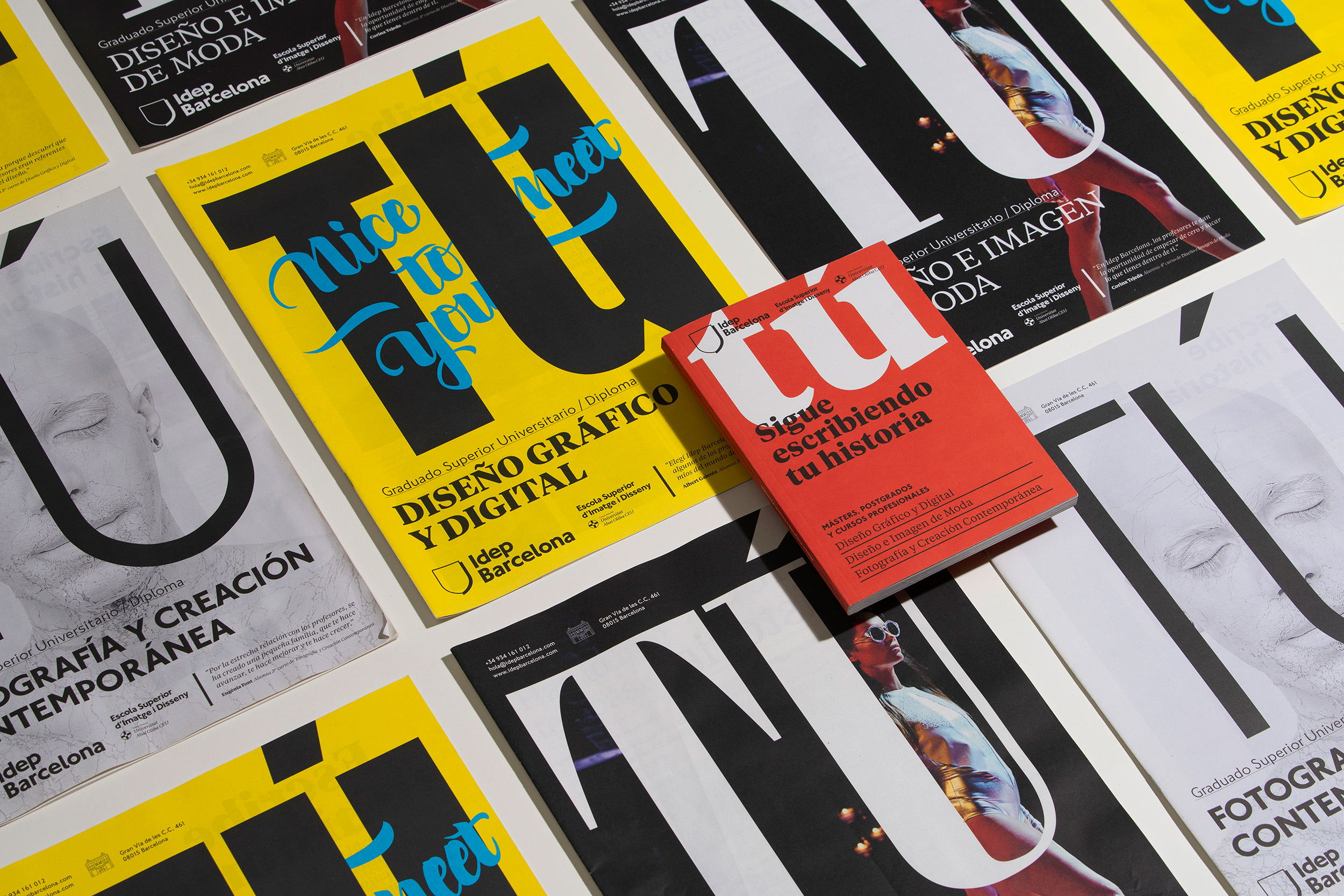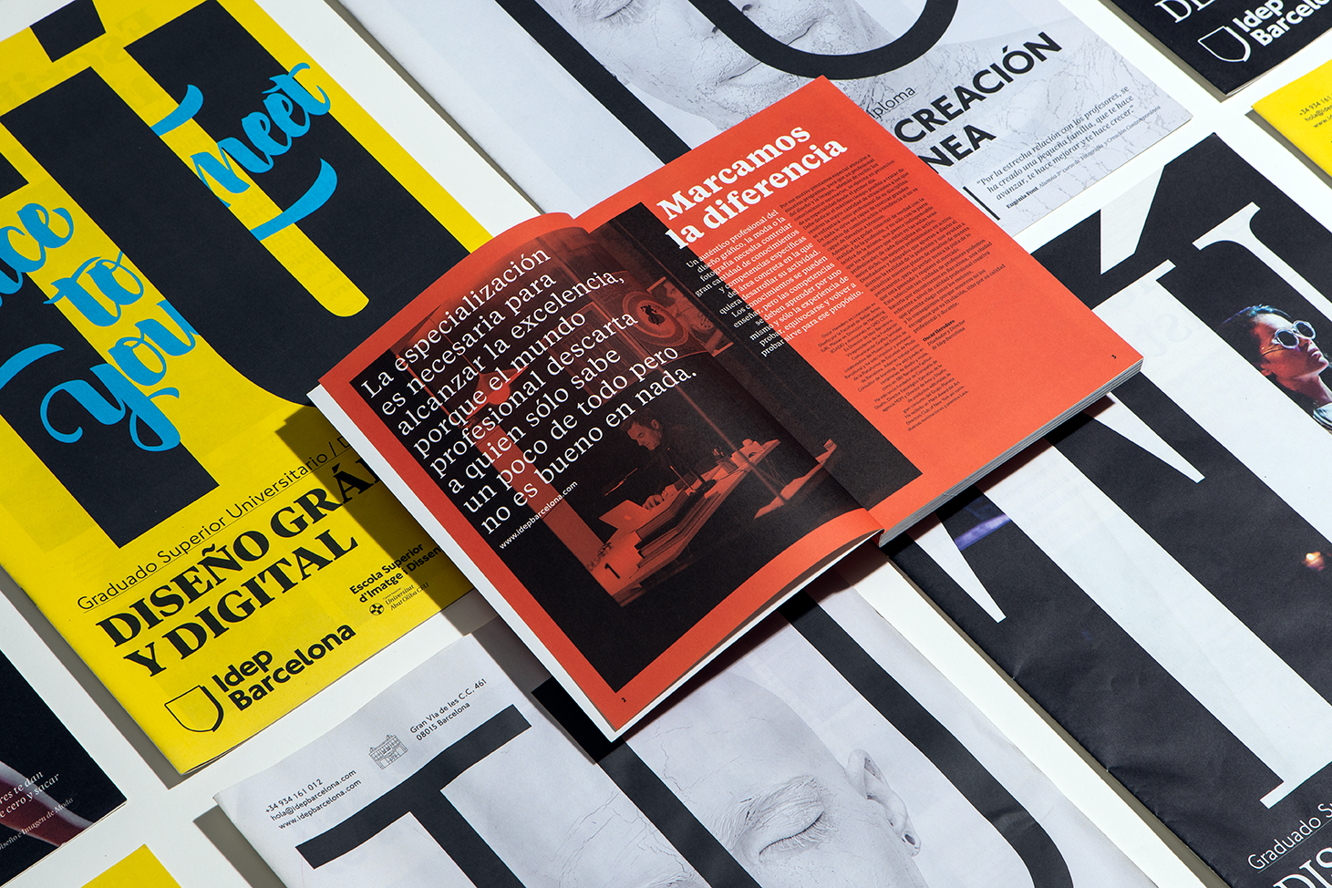 These are a set of program brochures designed for the creative school Idep Barcelona, divided into three degrees: Contemporary Photo, Graphic Design and Fashion, and Master Degrees.