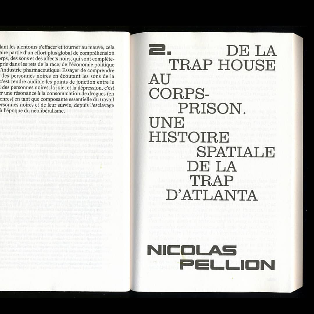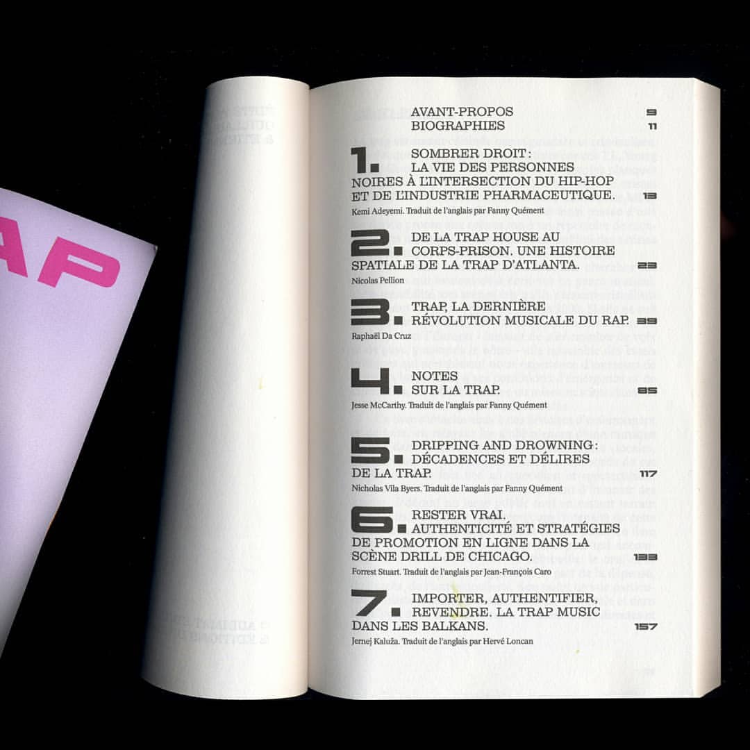 Trap brings together texts and essays by Kemi Adeyemi, Raphaël Da Cruz, Jernej Kaluza, Jesse McCarthy, Nicolas Pellion, Forrest Stuart, and Nicholas Vila Byers. This book focuses on stories of confinement and escape, through authors who listen to trap on a daily basis, and who live, write or act under his influence.