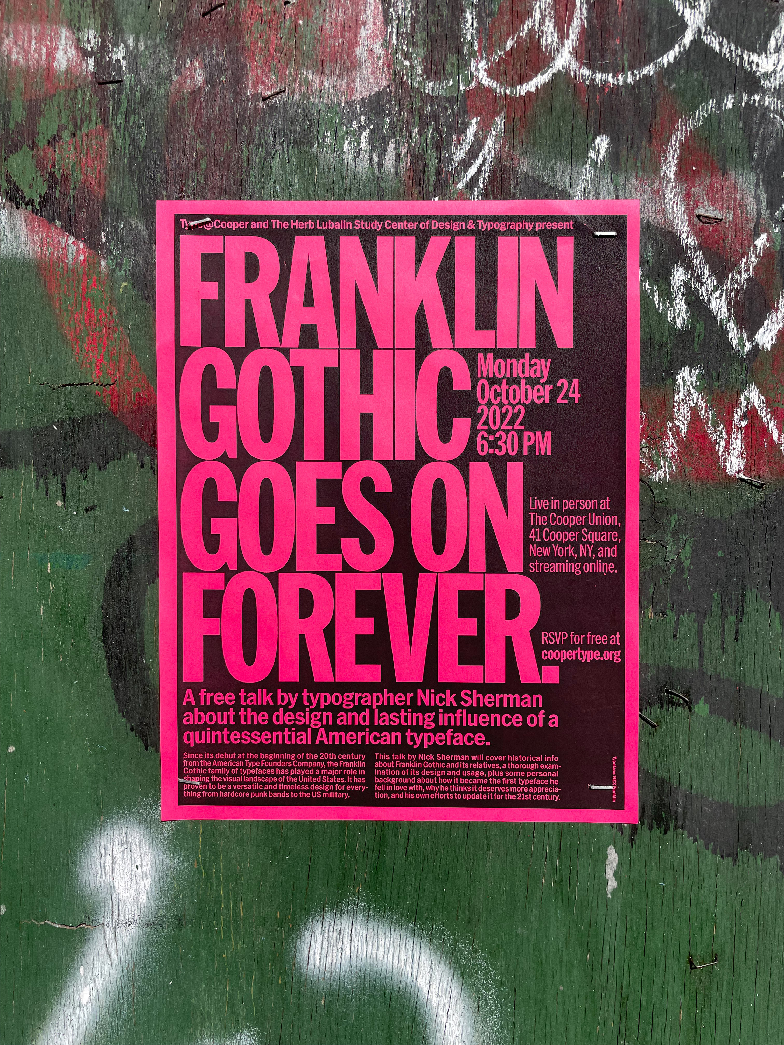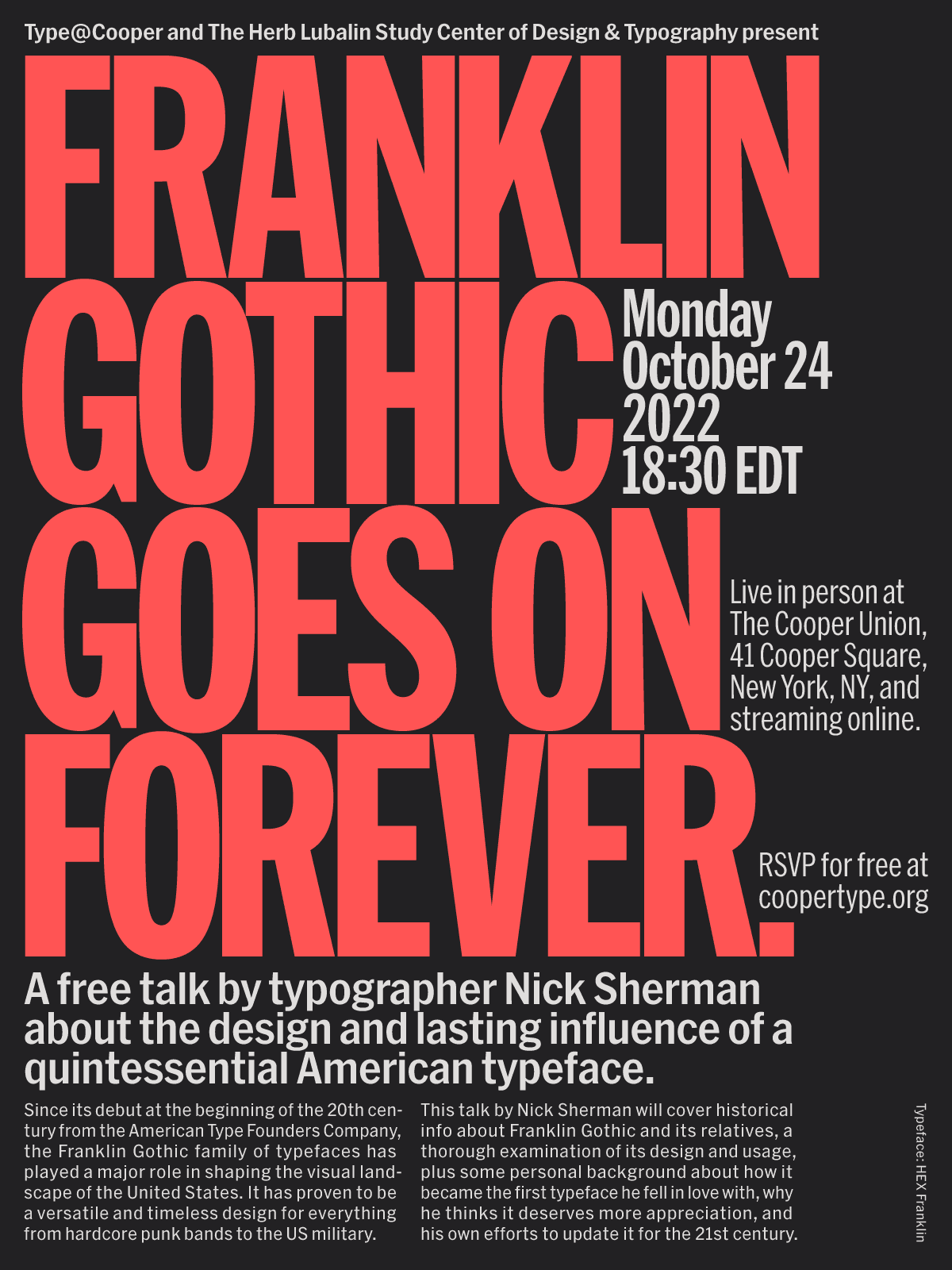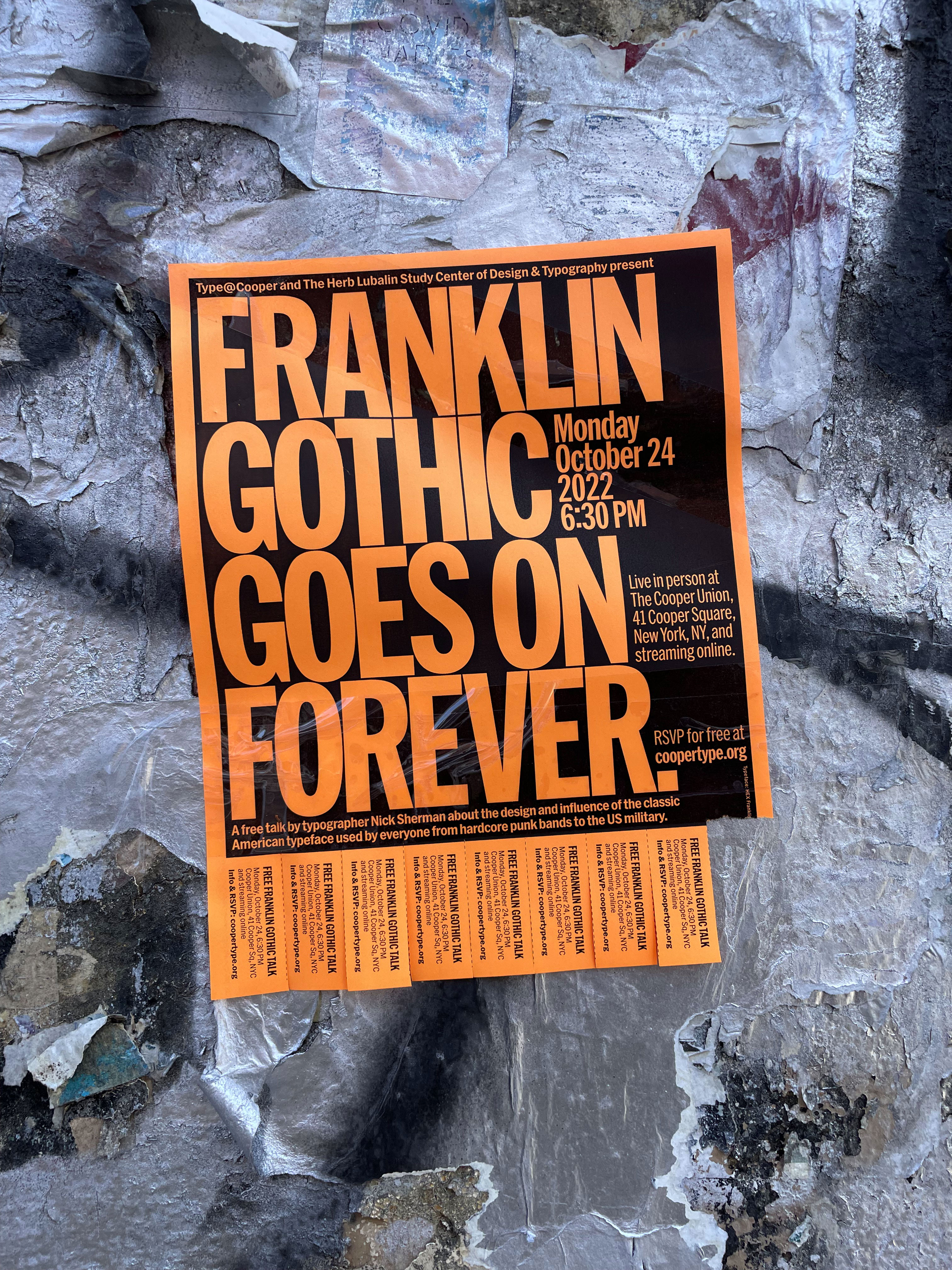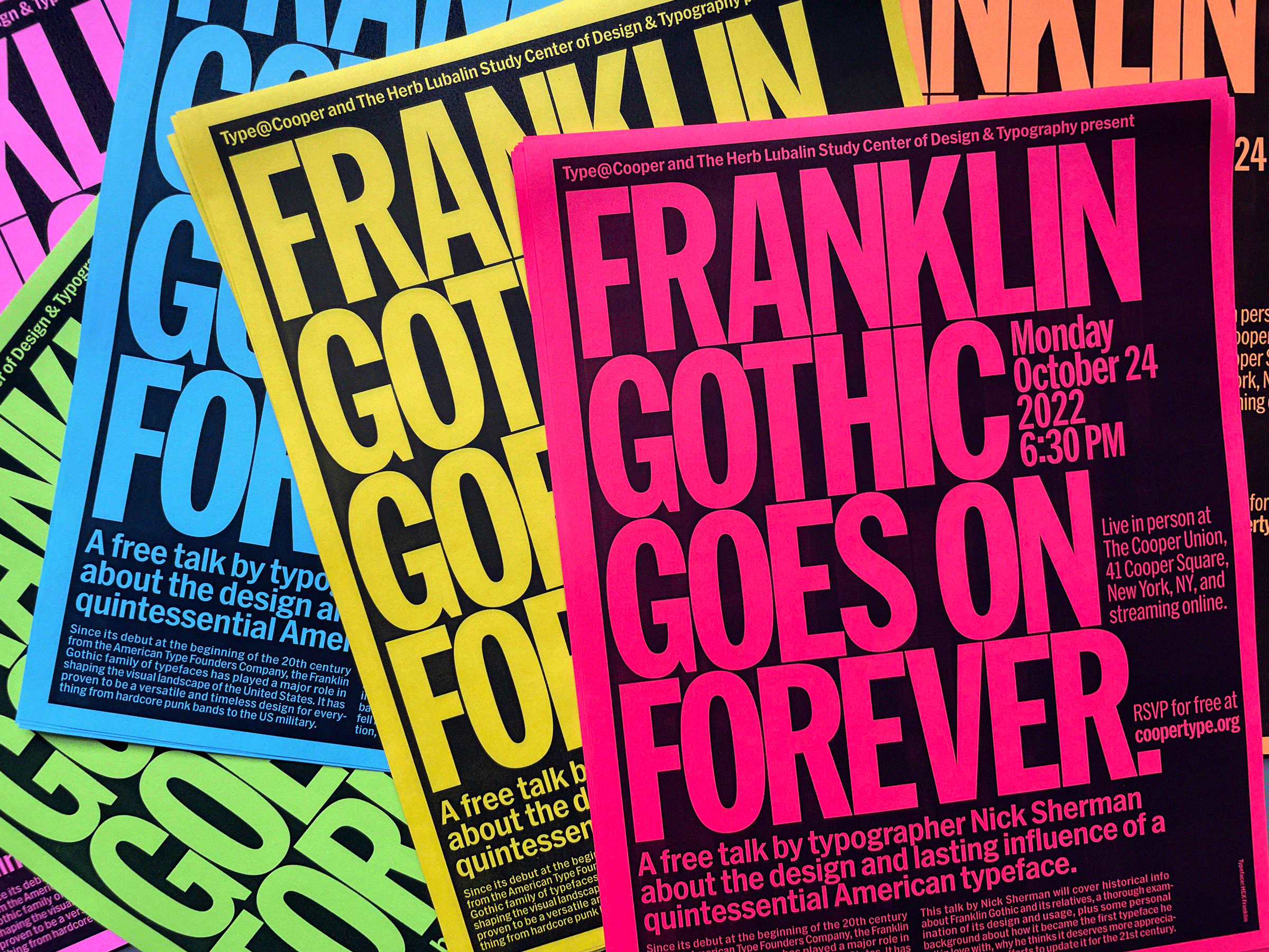 Digital and analog flyers for a free talk about Franklin Gothic on October 24, 2022, as part of Type@Cooper and The Lubalin Center’s Herb Lubalin Lecture Series at Cooper Union in New York City.