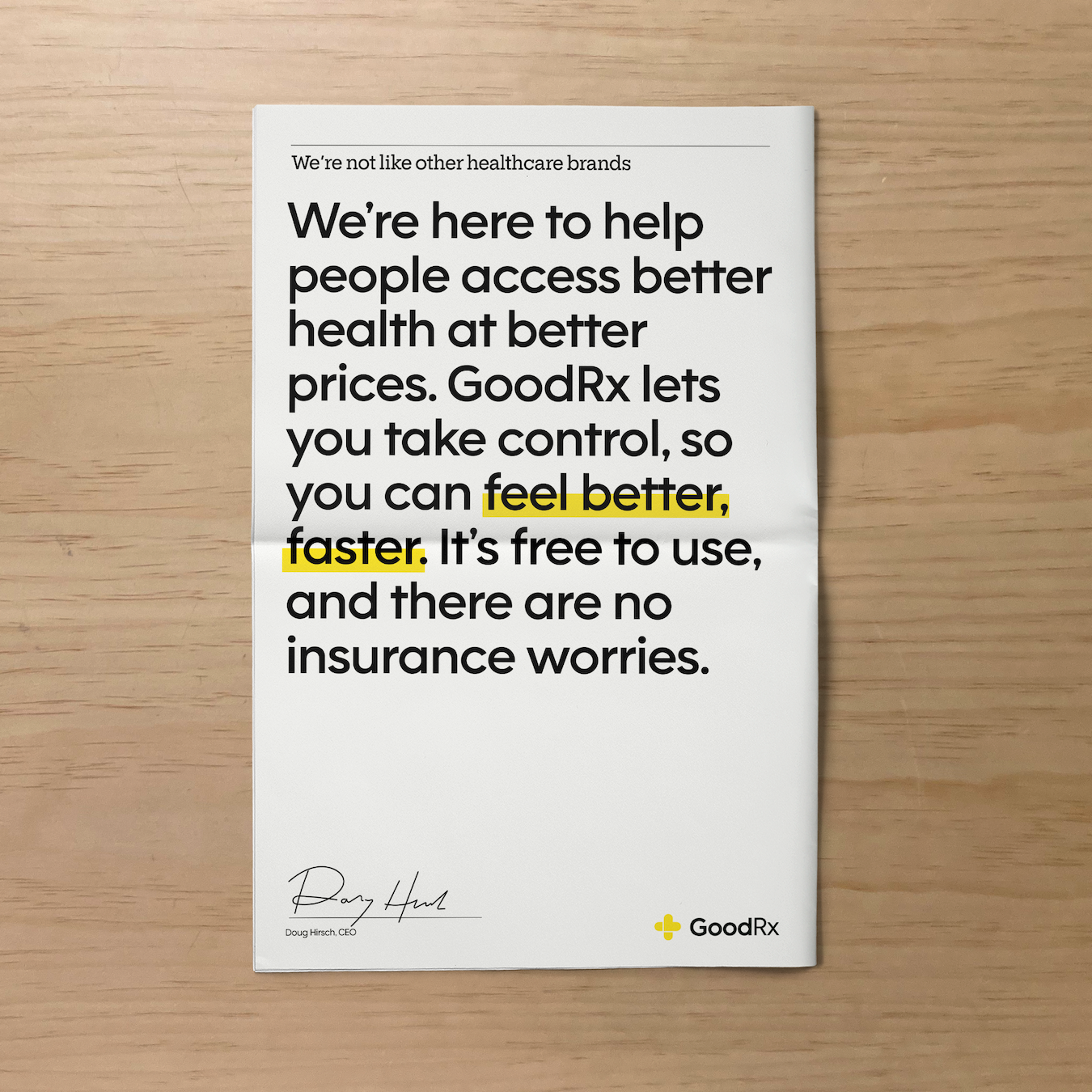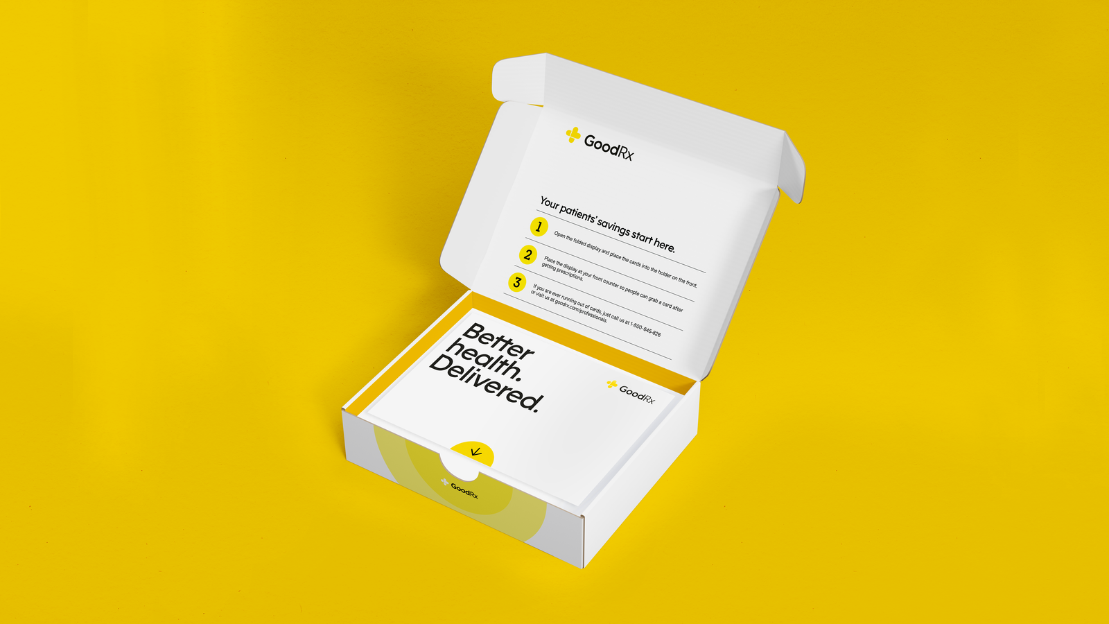 The goal of the identity was to reflect GoodRx’s position at the epicenter of better health. With a direct tone of voice and a simplified information hierarchy on the labels, the GoodRx brand humanizes the healthcare process to make the experience straightforward and painless.