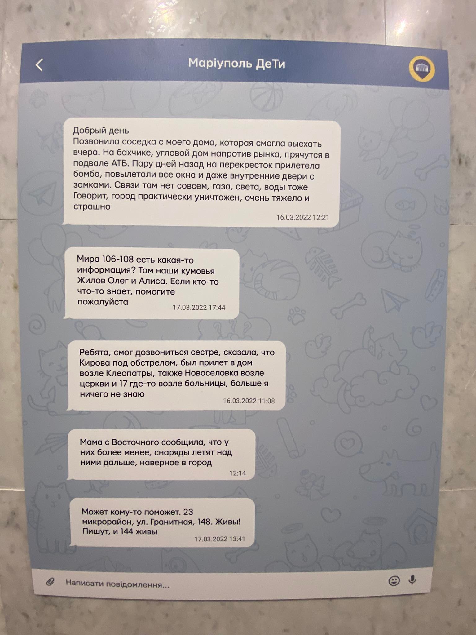 The exhibition name is a wordplay on the Ukrainian Де ти? (“Where are you?”) and the Russian Дети (“children”), written on vehicles, houses, fences and even the theater to point out the presence of kids, in hope that the Russian army will not shoot (but they did regardless).