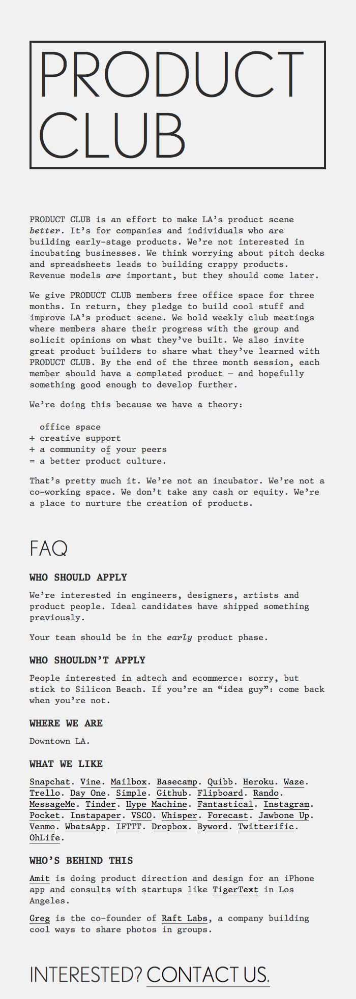 Super simple one-page website for Product Club, an LA initiative to promote the local product scene with free office space and networking. Alix FB, designed by likewise Los Angeles based Matthew Butterick, has the talent to make even the most basic text look interesting, especially the italics. Bonus points for combining it with Nobel (which seems to be a popular type combination these days, but happened entirely without knowing. :)