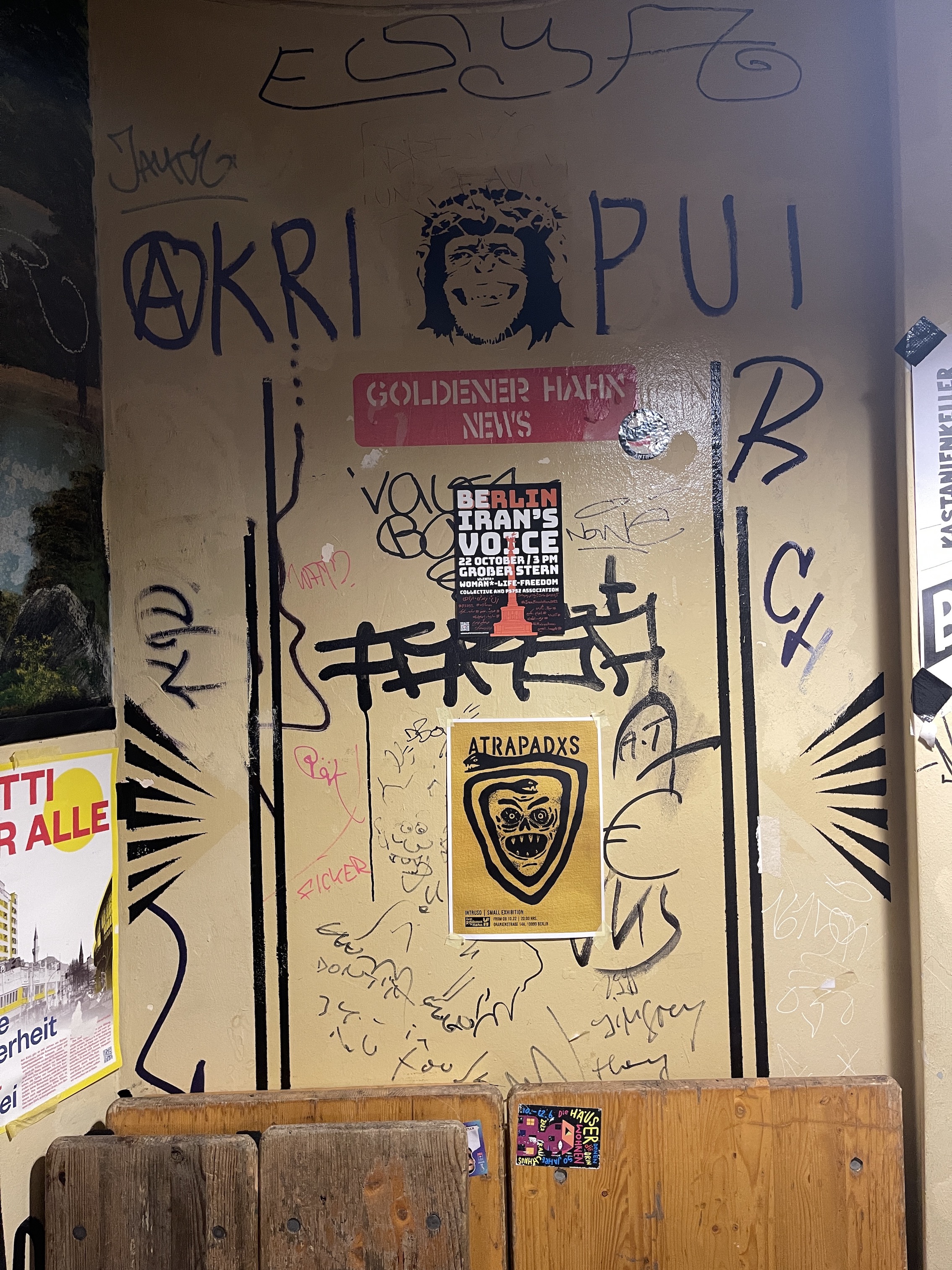 Flyer/poster for the Woman*-Life-Freedom protest of 22 October 2022, organized by the Woman* Life Freedom Kollektiv and the Association of Families of Flight PS752 Victims. Photographed in Zum Goldenen Hahn, Oranienstraße, Berlin, during a visit on the evening of 21 October 2022.