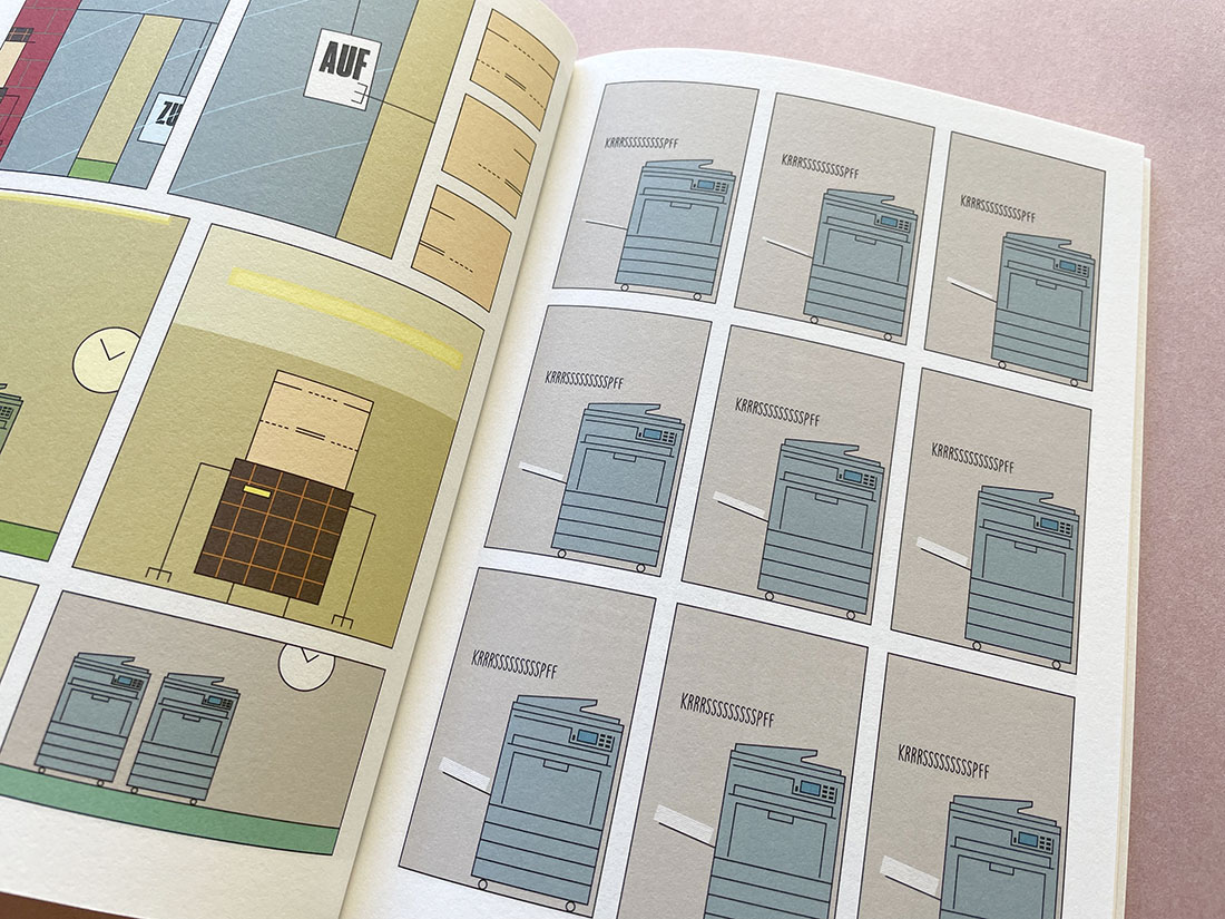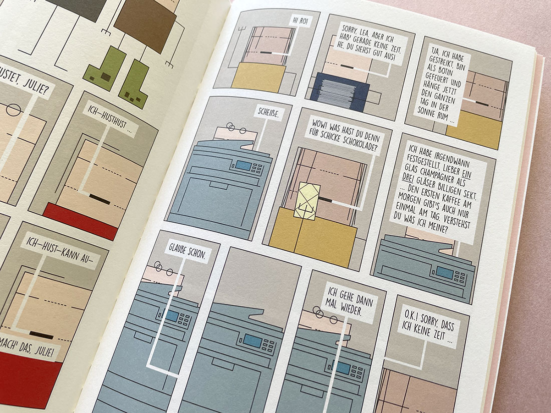 In the graphic novel Copy Shop, Julie works full time in a Berlin copy store, and she likes doing it. Her boss is unusually nice, and the pay is surprisingly okay. Ro also works here. He is a student and needs the part-time job. He can’t believe that Julie likes the store: in addition to boredom, there are fine particles in every corner. But Ro realizes that it’s not easy for him to talk to Julie.