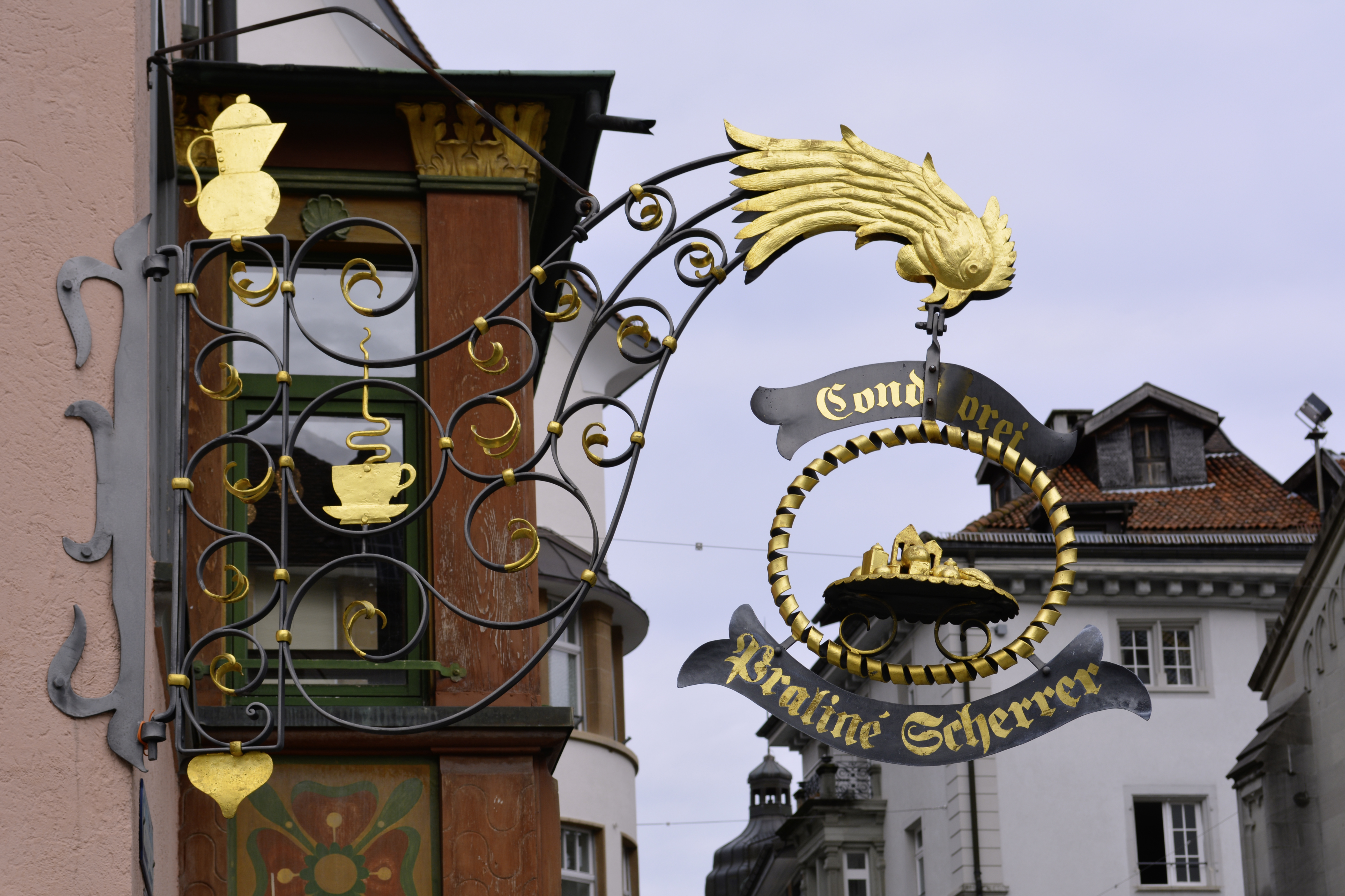 Hanging sign of Conditorei Praliné Scherrer, a confectionery in St. Gallen, Switzerland. The business was started in 1875 when Ludovico Ferrari, a chocolatier from Ticino, came to St. Gallen with a chocolate recipe from Turin. In 1939, Georg Scherrer took over. Since 2008, the business is led by Vittoria Kreis and her daughter Romina Hengartner.