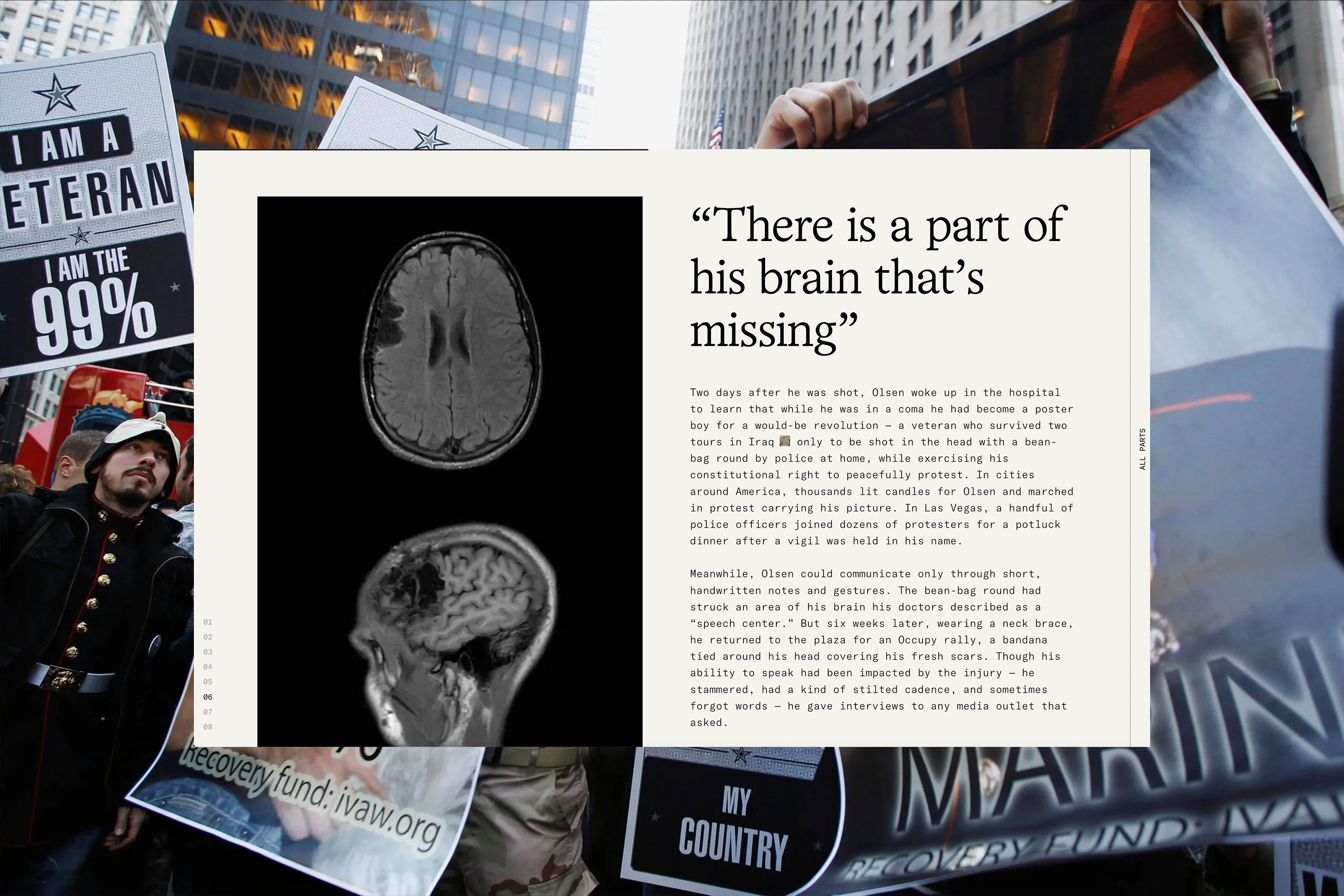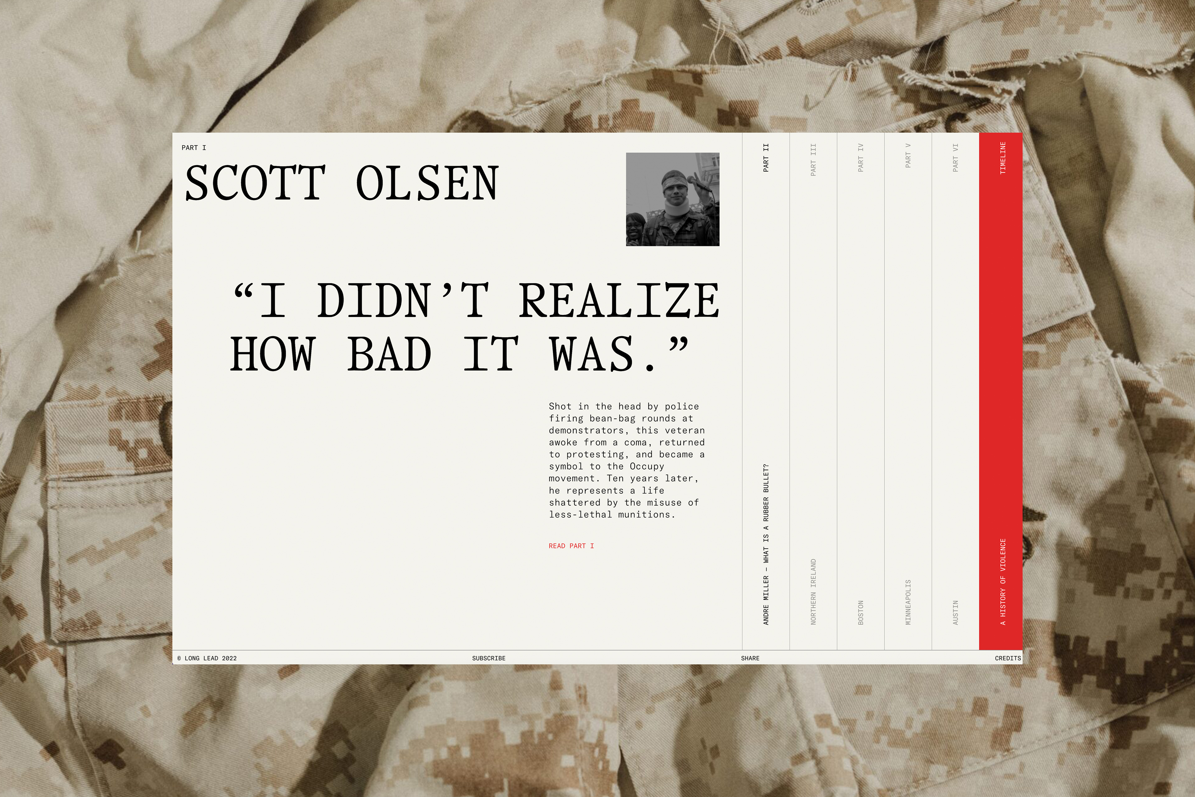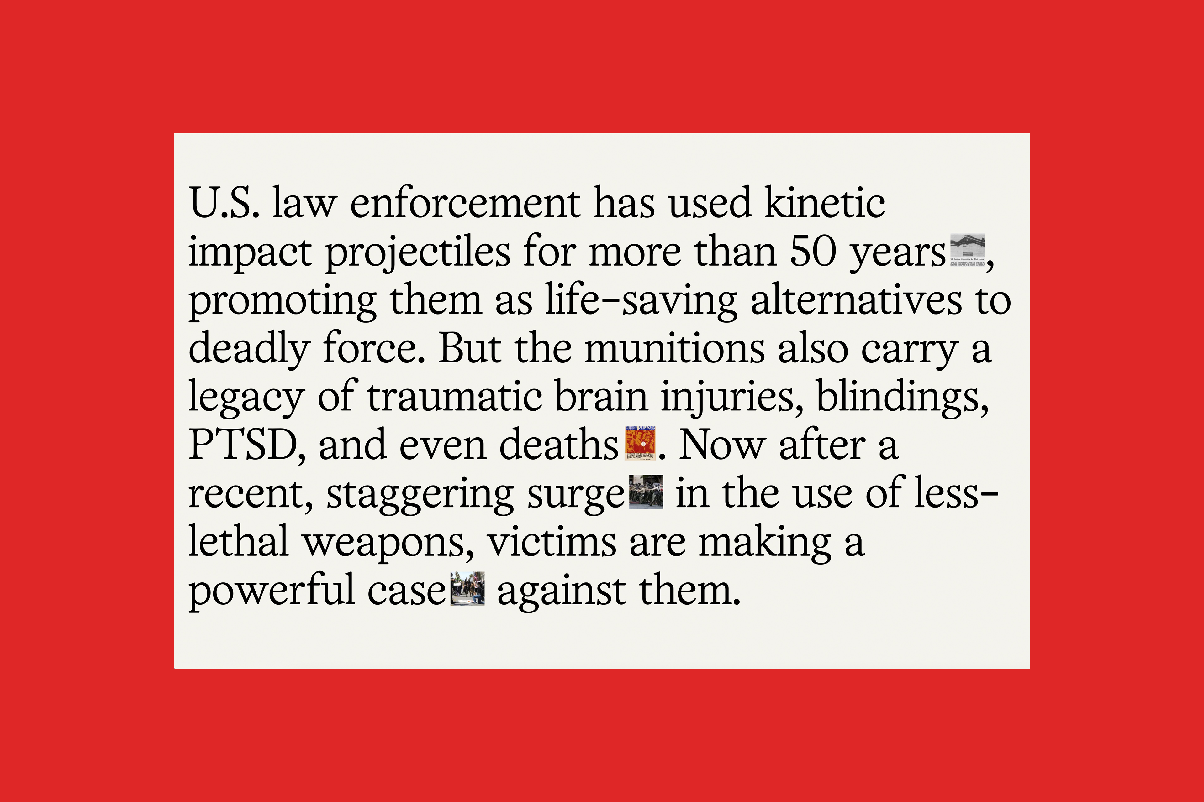 The People vs. Rubber Bullets website Contributed by Guillermo Brotons on Nov 8th, 2022. Artwork published in October 2022. Decimal Studios. License: All Rights Reserved. For more than 50 years, less-lethal munitions like rubber bullets, bean-bag rounds, pepper balls and tear gas canisters have injured, disfigured, and killed people. Don’t look away; the victims have built a powerful case against these weapons. The website pairs Office Times Round and its fixed-pitch companion Office Times Mono with GT America Mono. Decimal Studios. License: All Rights Reserved. Decimal Studios. License: All Rights Reserved. Decimal Studios. License: All Rights Reserved. Decimal Studios. License: All Rights Reserved. Decimal Studios. License: All Rights Reserved. Typefaces More about Office TimesGet Office TimesMore about Office Times MonoGet Office Times MonoMore about GT America MonoGet GT America Mono Formats Web (5623) Mobile/Tablet (1022) Topics Activism (1110) Politics (855) Designers/Agencies Decimal Studios (4) Tagged withwebsites (3566)self-initiated projects (435)police (28)violence (10)weapons (13)rubber bullets (1)protest (120)inline images (115)quotes (528)tabs (24)rotated type (2224)reversed type on an image (1222)monospaced (1237)mobile (595)all caps (7608)Nouveau Rebus (26)type series: proportional+mono (303) Artwork location United States (9922) New York City (2914) In SetsWeb (Lucas Bevilaqua) (361)Serif (Lucas Bevilaqua) (241)2 Serifs (Lucas Bevilaqua) (42)Dearly (Sonia Koehler) (19)bb (Leonardo de la Fuente) (1331) Post a comment Name Email – will not be published Website Your response Submit Comment More in Politics Azimuts 422015Timothée DeloireESADSEContributed by Deloire Timothée The New York Times ad campaign: The Truth Is Hard2017Droga5Contributed by Love Lagerkvist Staff Pick everybodyisgreece.com2015Sergio GarciaAntonio GuerraContributed by Sergio Garcia Sponsor More in Web Juridika logo and websitec. 2018unknownContributed by Felix Braden #ParaLosValientes2018DoubleYouContributed by Emtype Foundry dublab.comc. 2019Folder StudioContributed by Edgar Walthert Wholesome rebrand2023Universal FavouriteContributed by Universal Favourite More Fonts In Use Roland TR-909 Rhythm Composer1983Tadao KikumotounknownContributed by Patrick Concannon Staff Pick Gorditas y Quesadillas standc. 2018unknownContributed by Florian Hardwig Staff Pick Flormat magazine #22017Greg LindyContributed by Love Lagerkvist Staff Pick Wor(l)ding: A Harvested Glossary for Social Justice in Arts Education and Beyondc. 2024Wibke BramesfeldContributed by HAL Typefaces Staff Pick Francisco José de Goya. Richter und Gerichteter1970Hans-Rudolf LutzContributed by Philipp Messner Staff Pick Wonka Nerdsc. 2000Contributed by Gareth Hague Staff Pick Plainsong concert poster2015John Sellards DesignContributed by John Sellards Staff Pick Unknowing2019Sophia BrinkgerdContributed by WELTKERN® Typefaces Staff Pick