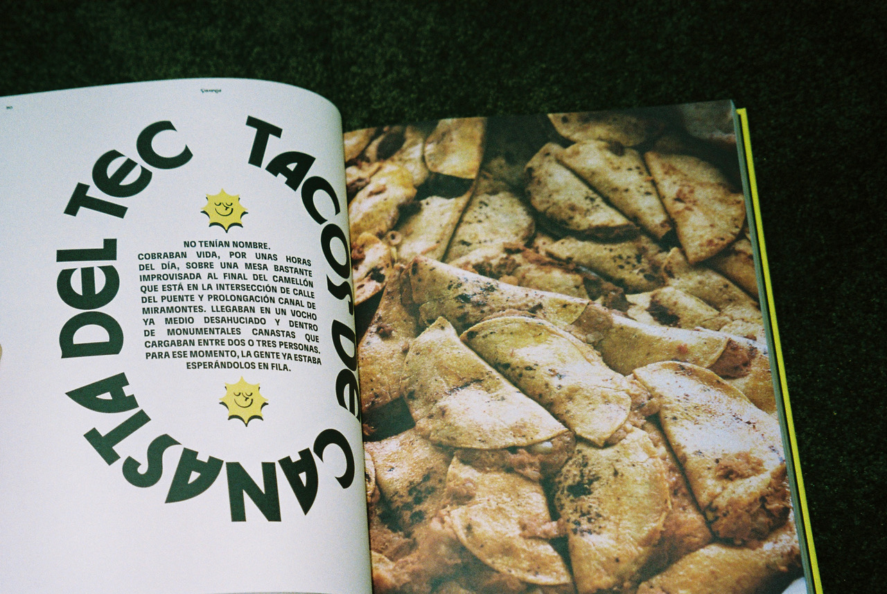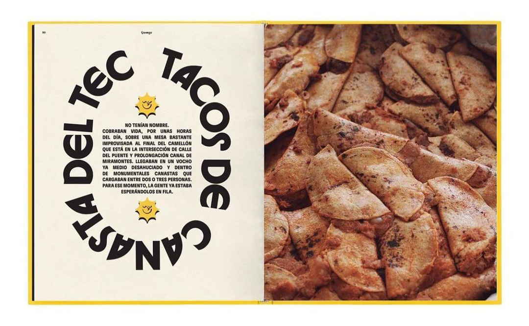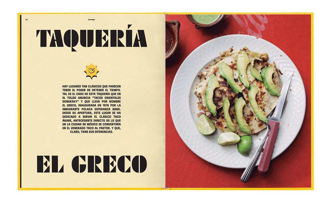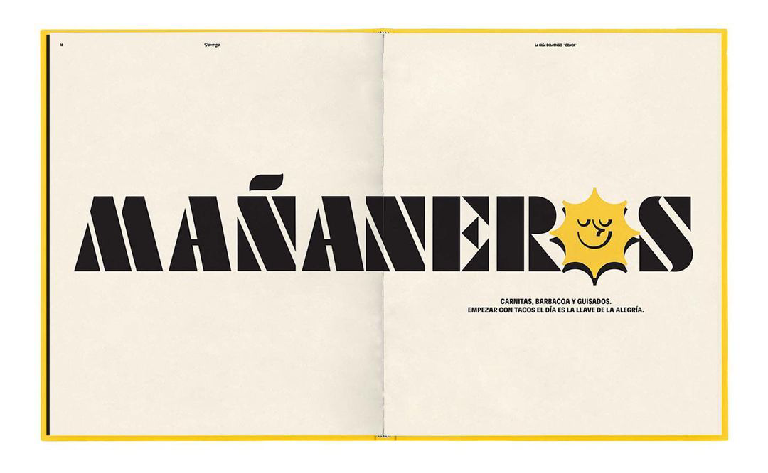 Tacos CDMX was designed by Rik Bracho in 2022. The typeface used for the cover is Herbus Bold. It’s also one of the recurring headline typefaces on the interior pages, alongside Futura Black, Brush Script, and Hobo. See more images on the Guía Domingo website and their Instagram account.