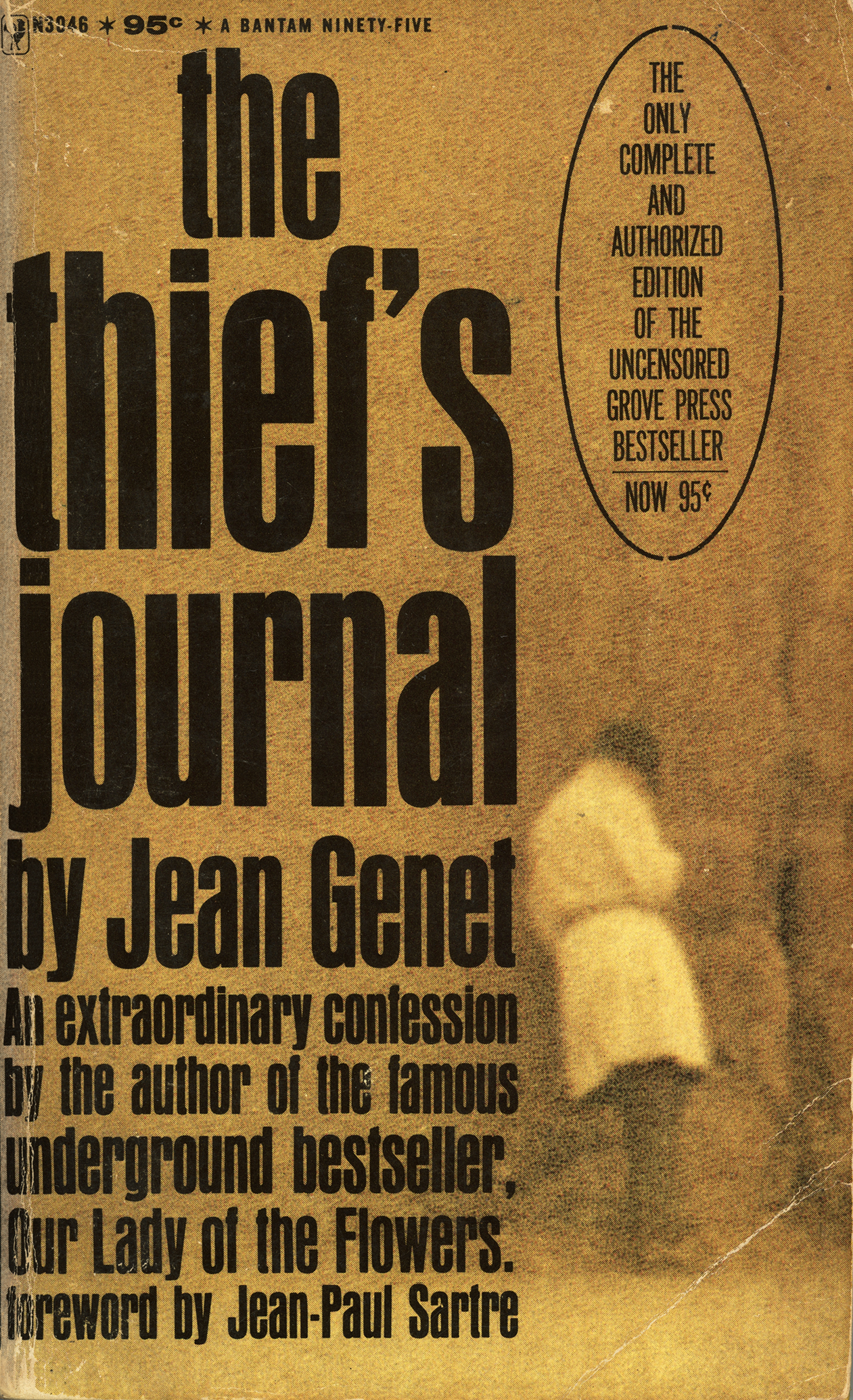 Cover of Bantam’s paperback edition The Thief’s Journal, published in 1965 with a foreword by Jean-Paul Sartre and advertised as “the only complete and authorized edition of the uncensored Grove Press bestseller” which was translated from the French by Bernard Frechtman.