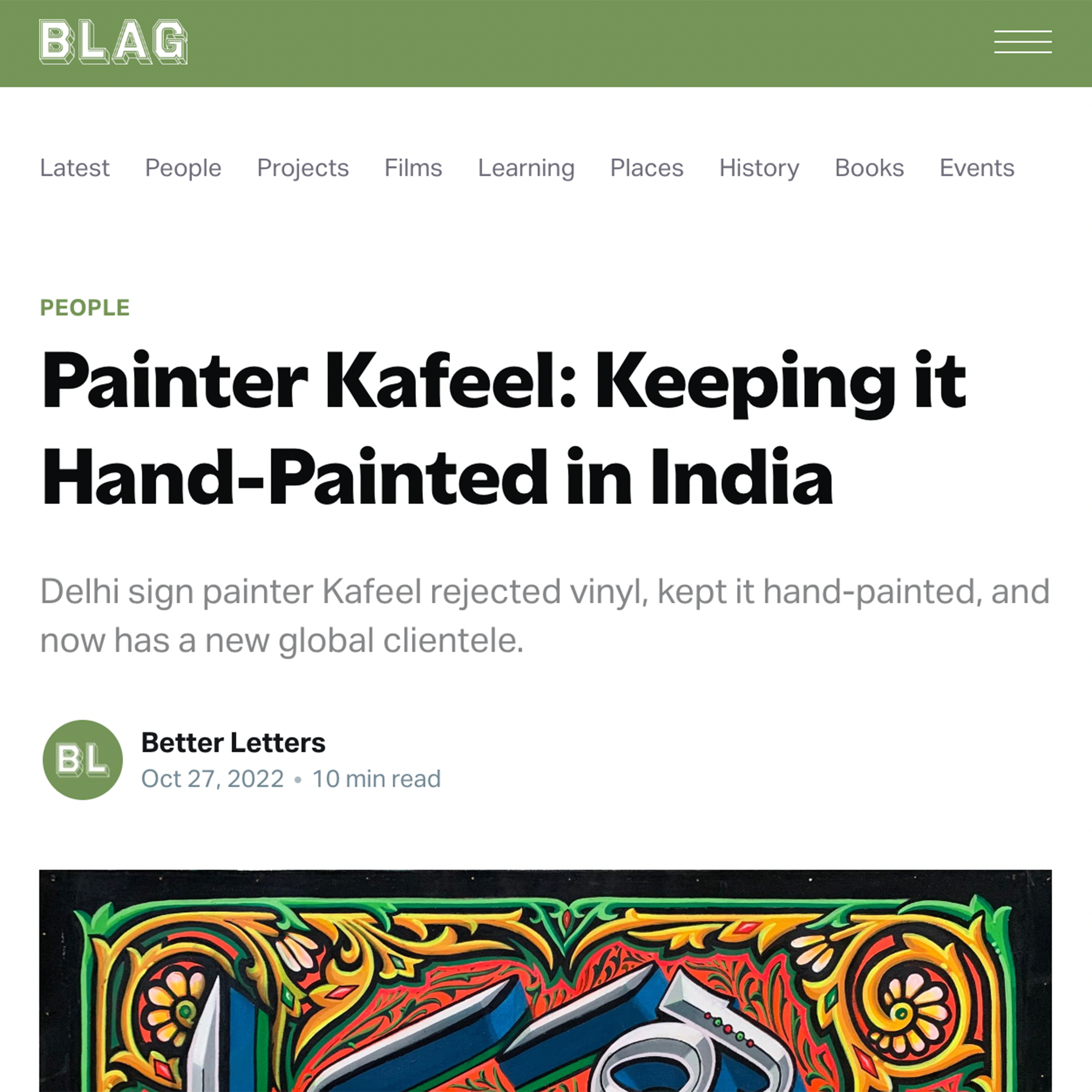 BLAG (Better Letters Magazine) is “the world’s only print and online publication dedicated to sign painting. BLAG exists to inspire and inform the international sign painting community by celebrating exciting work and sharing knowledge and resources”. The publication was initiated by Sam Roberts.