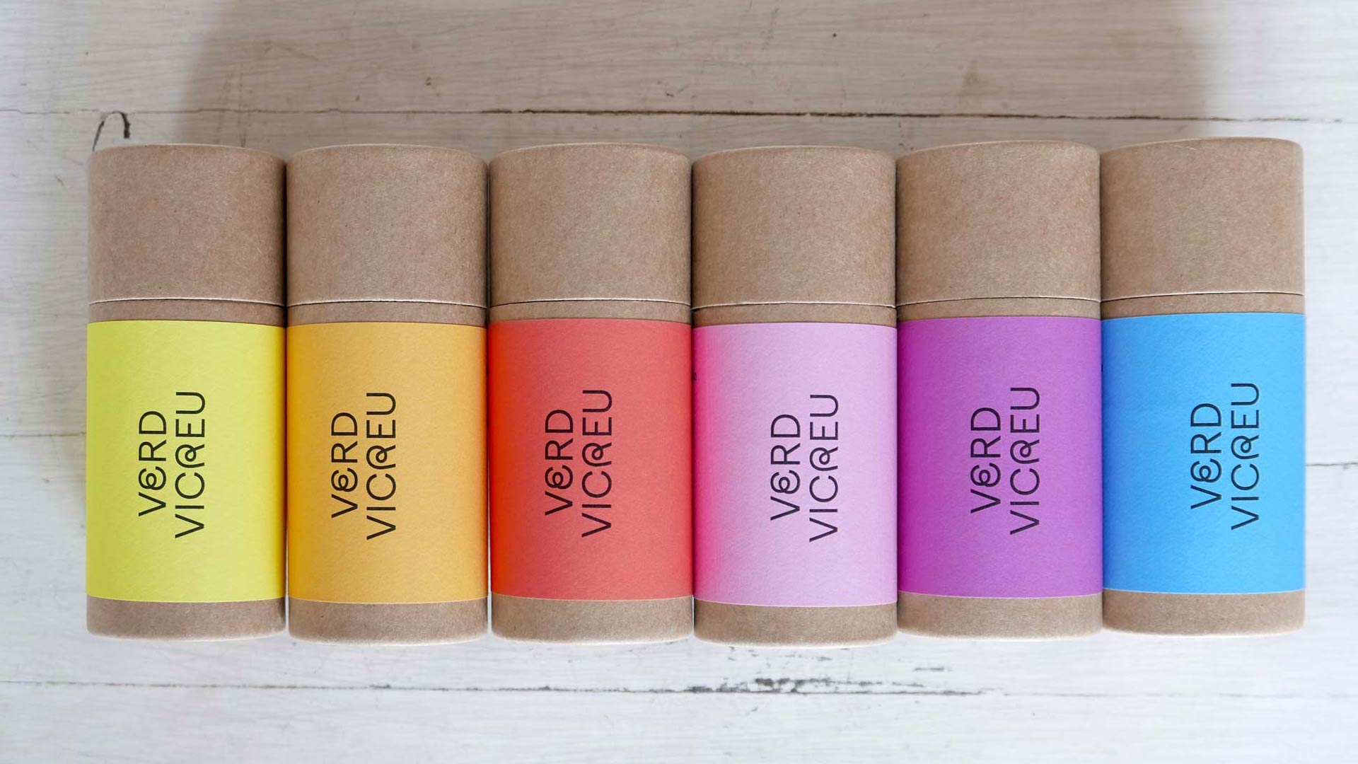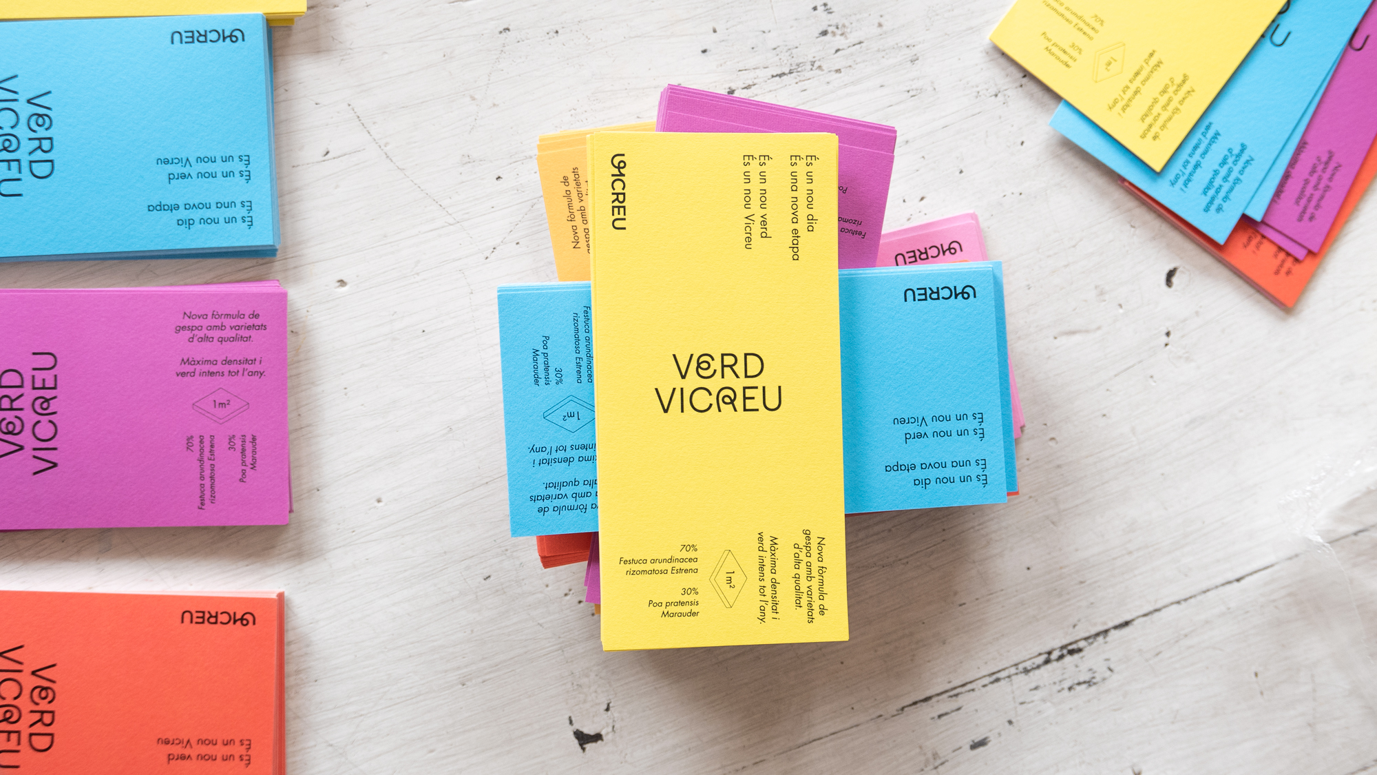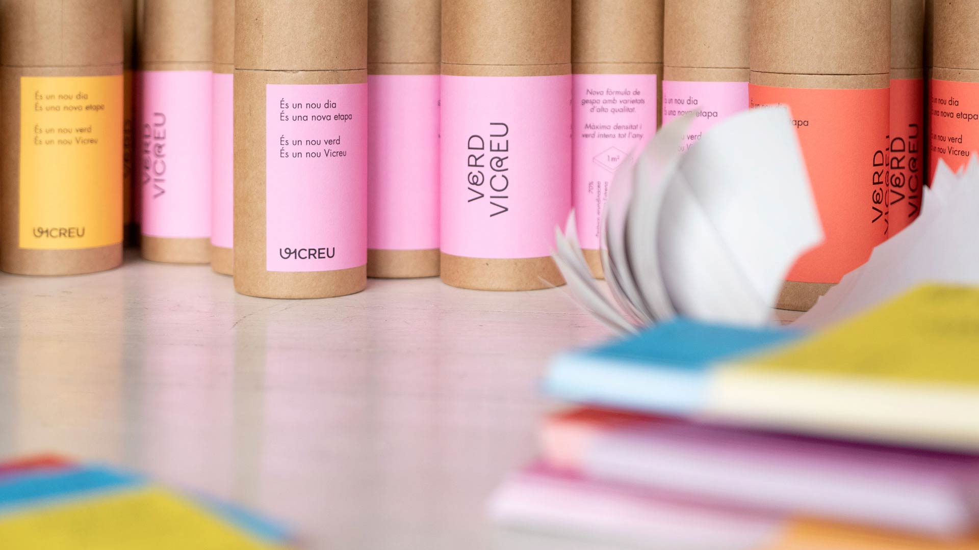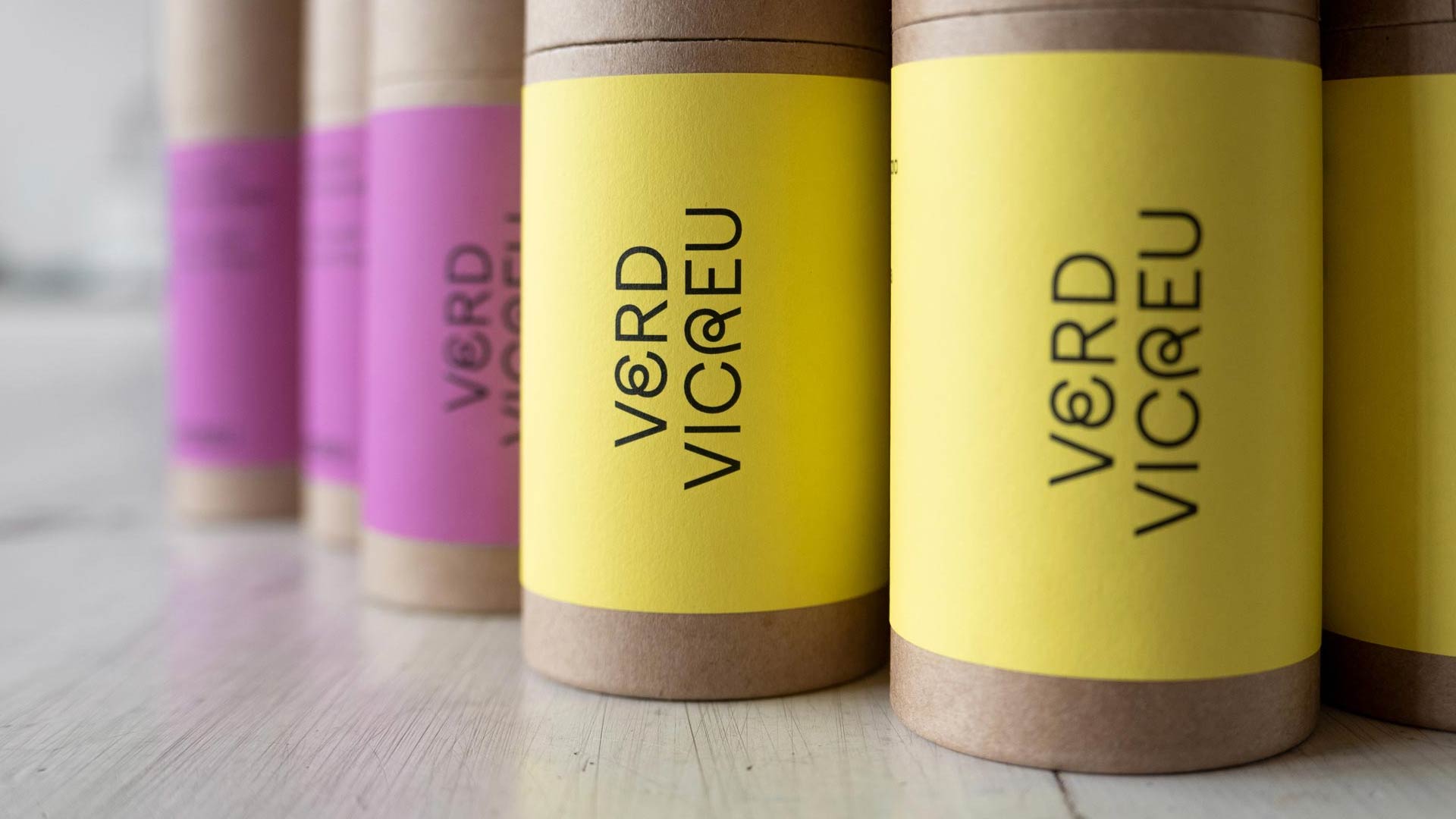 Verd Vicreu (“Green Vicreu”) is their new grass formula. Together with Alda Studio who worked on the interior design, Alucina was tasked to promote this product on the opening day of Vicreu’s new premises in March 2022. Alucina prioritized working with sustainable materials and hence discarded any plastic in favor of cardboard tubes. The labels play with the absence of green in the color range. Each tube contains seeds for 1 m² of green grass. Produced in a limited edition of 300 units.