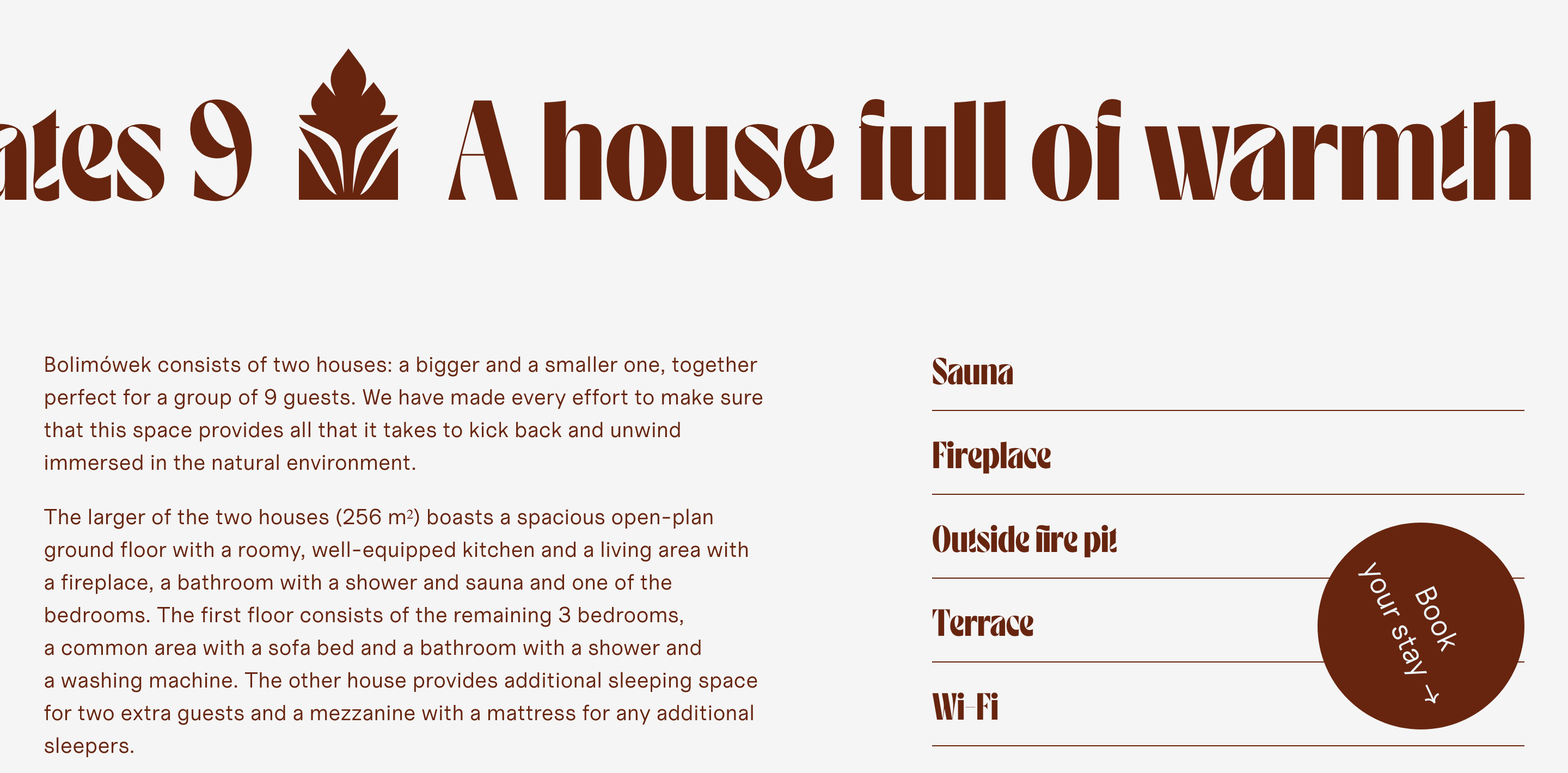 The house has a cozy vibe throughout: all-wood interiors and warm-tone fabrics compliment the sight of woodland critters frolicking just outside the windows. Translating the property’s distinctly offline qualities into the online sphere, we’ve decided on an organic, woodsy shade of brown as the dominant colour in the website, animated logo and all graphic design, making a bold – if quiet – statement.