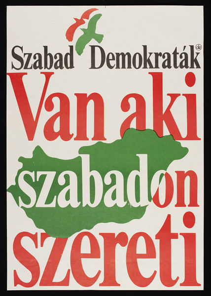 “This poster was issued by the Alliance of Free Democrats on the occasion of the first free elections in Hungary in 1990. Together, the slogan and image assert the claim for an independent Hungary. The title of the film 'Some like it hot’ was well known in Hungary and everybody understood the witty reference to it in this poster. Here 'It’ stands for Hungary which is signified on the poster through the contours of the country’s map. The map and the party logo (three birds in the national colours) form a backdrop.” — V&A Museum
