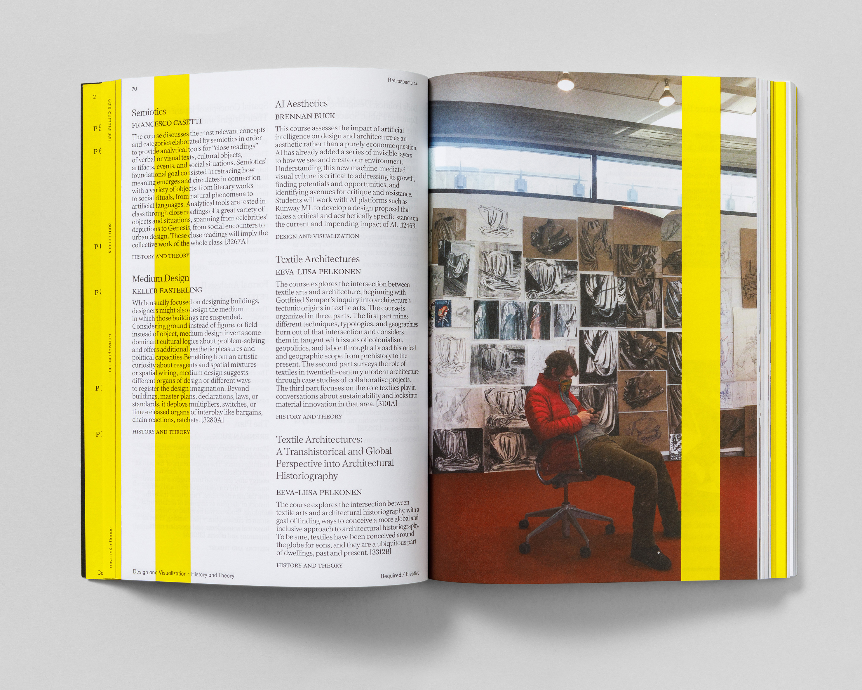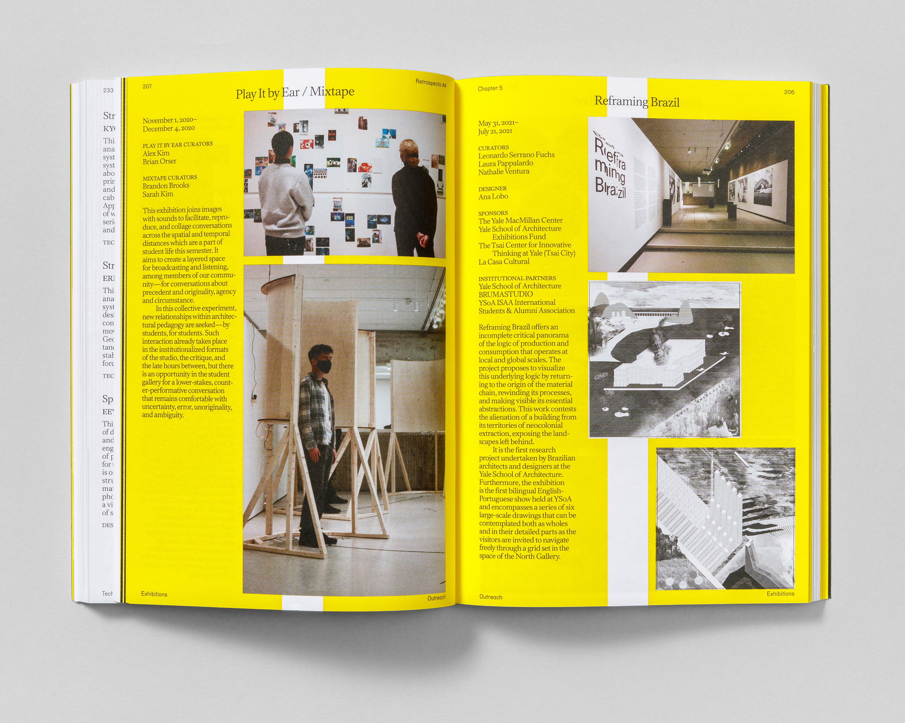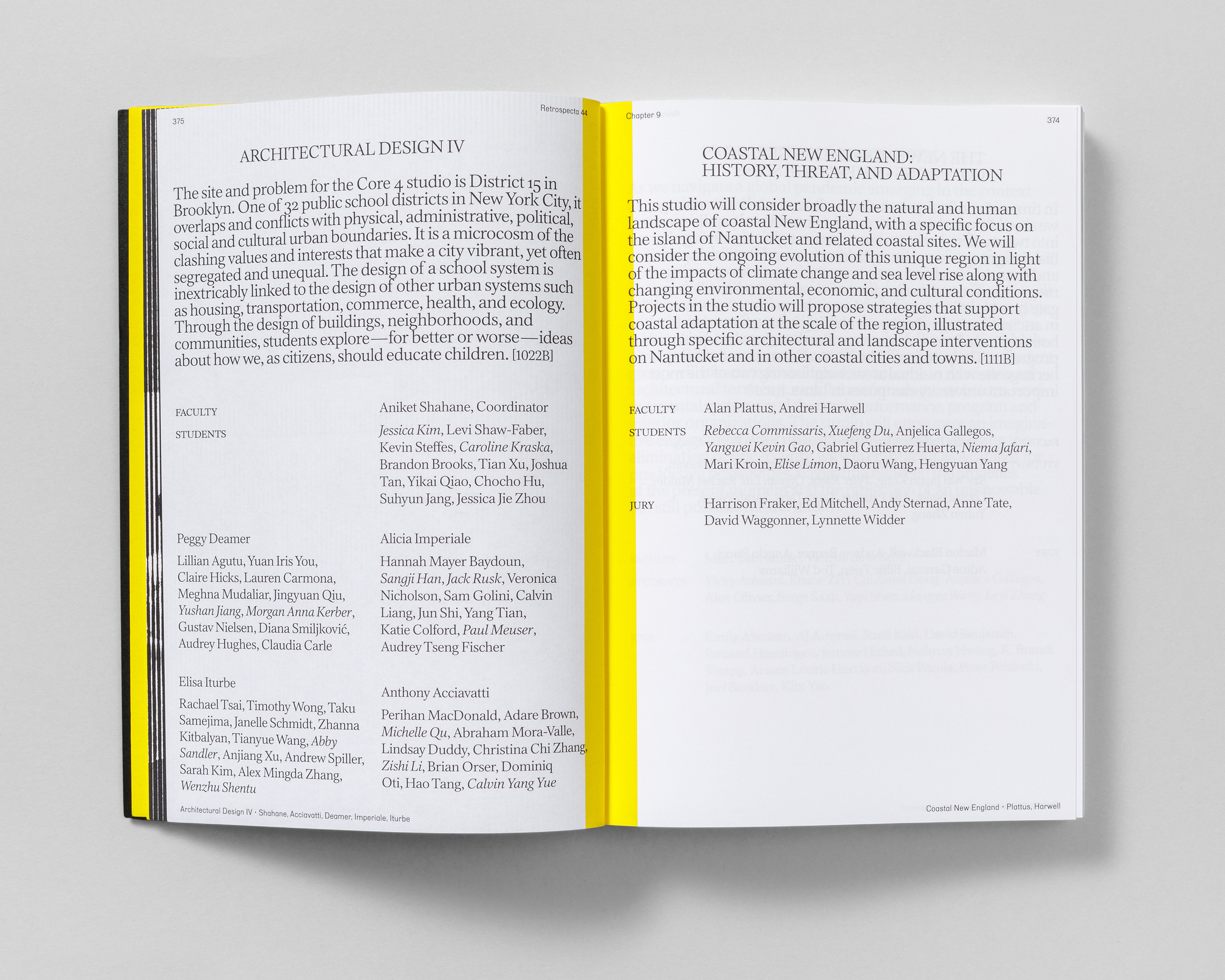 Retrospecta is the annual journal of student work at the Yale School of Architecture. Part historical record, part monograph, Retrospecta seeks to capture and record the current life of the school. Documenting one academic year, each issue contains exemplary work from both the design studios and support courses. The daily activities of the school, including lectures, symposia, exhibitions, and studio reviews, are also highlighted through numerous candid photographs and quotations. The journal is edited by students and published by the school.