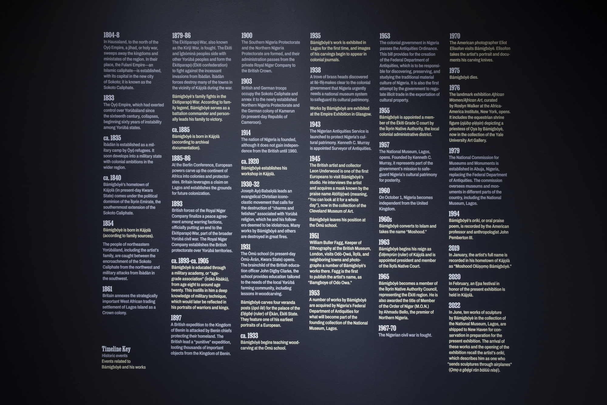 Bámigbóyè: A Master Sculptor of the Yorùbá Tradition is an exhibition curated by James Green at the Yale University Art Gallery, which celebrates Nigerian artist Moshood Olúṣọmọ Bámigbóyè (ca. 1885–1975), a Yorùbá woodcarver regarded for his intricately crafted sculptures and ceremonial masks. Exhibition graphics designed by Chris Chew.