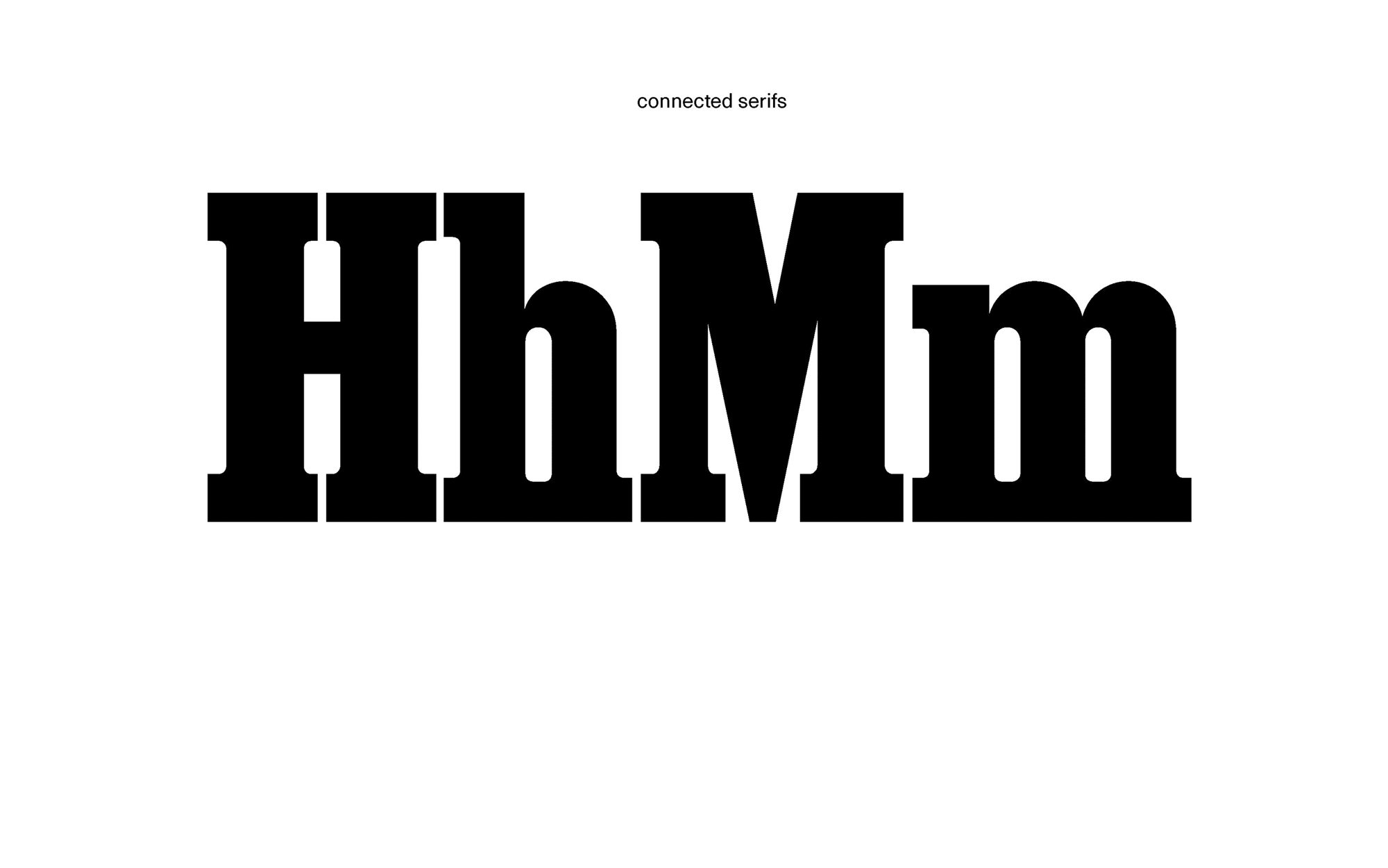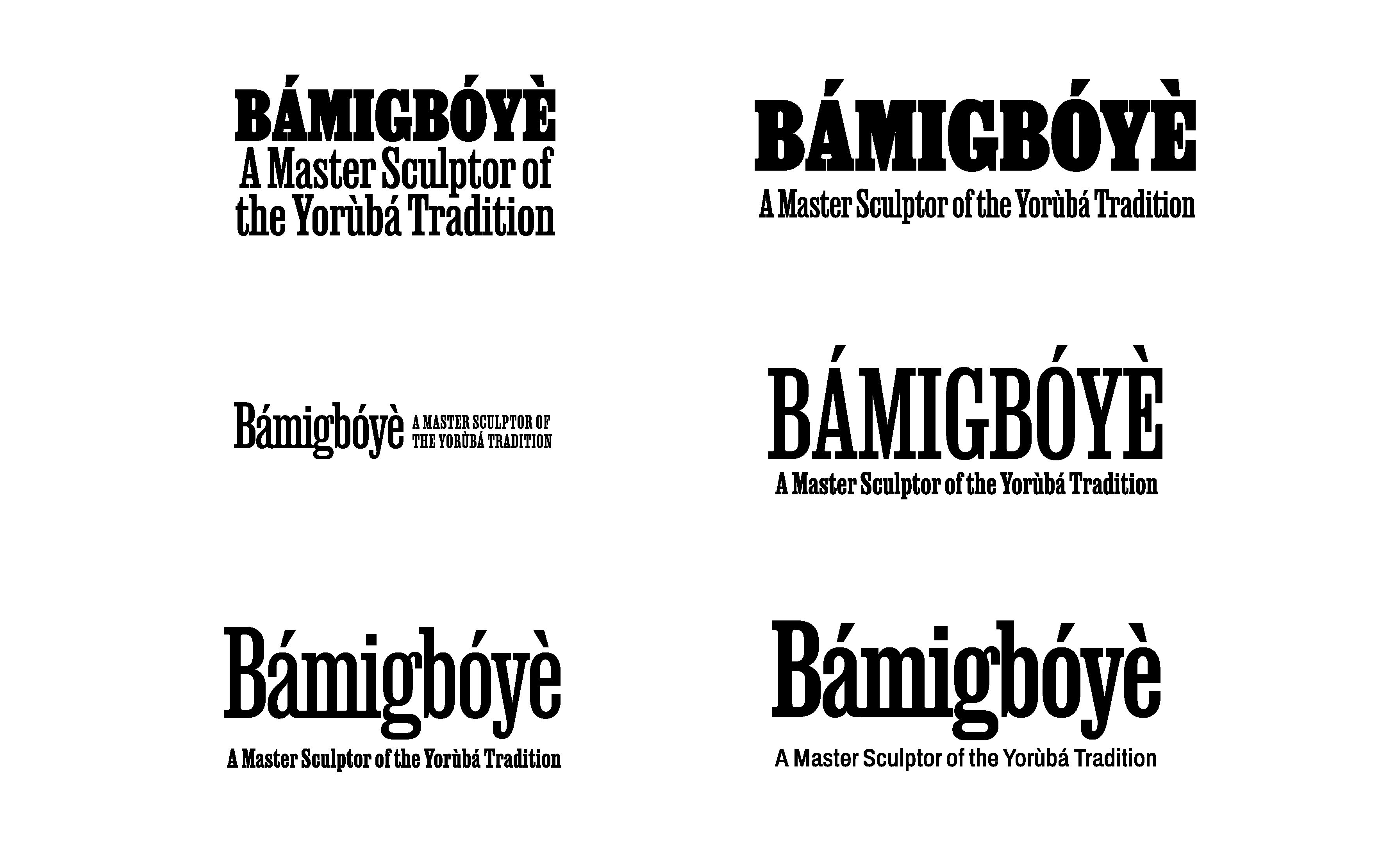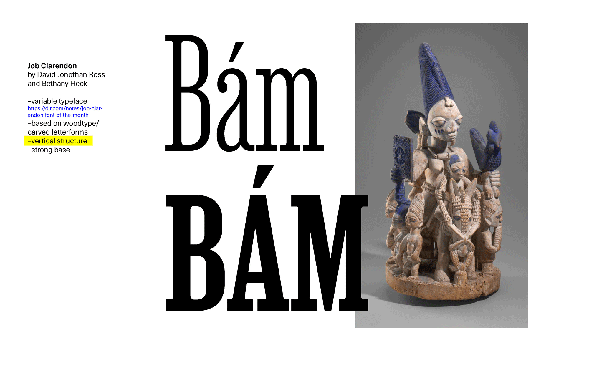 The medium-to-heavy weight range of the variable typeface Job Clarendon by David Jonathan Ross and Bethany Heck echoes formal elements of prominent works in the exhibition. Similarities can be drawn between Bámigbóyè’s sculptures depicting multiple figures connected by a sturdy, flat base and the letterforms composed of strokes grounded by sturdy slab-serifs, particularly when the “connected serifs” stylistic set is employed. Job Clarendon’s woodtype origins also link the typeface to the artist’s craft.
