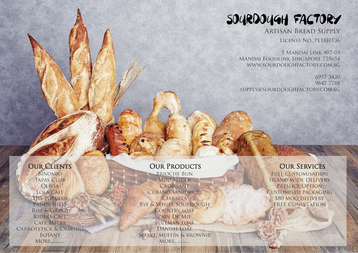 The Sourdough Factory was conceived by Henry Ng. It is a bakery wholesaler of different kinds of bread for use in various food & beverage outlets and ship chandlers. Ng also owns a bakery cafe, Bread & Hearth, that sells entrées, pastries and desserts for dine-in and delivery.