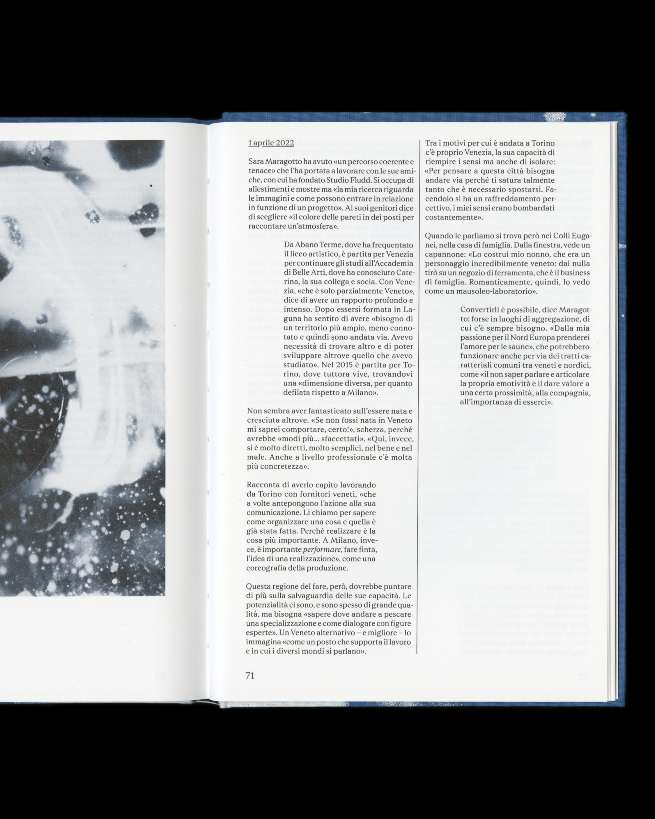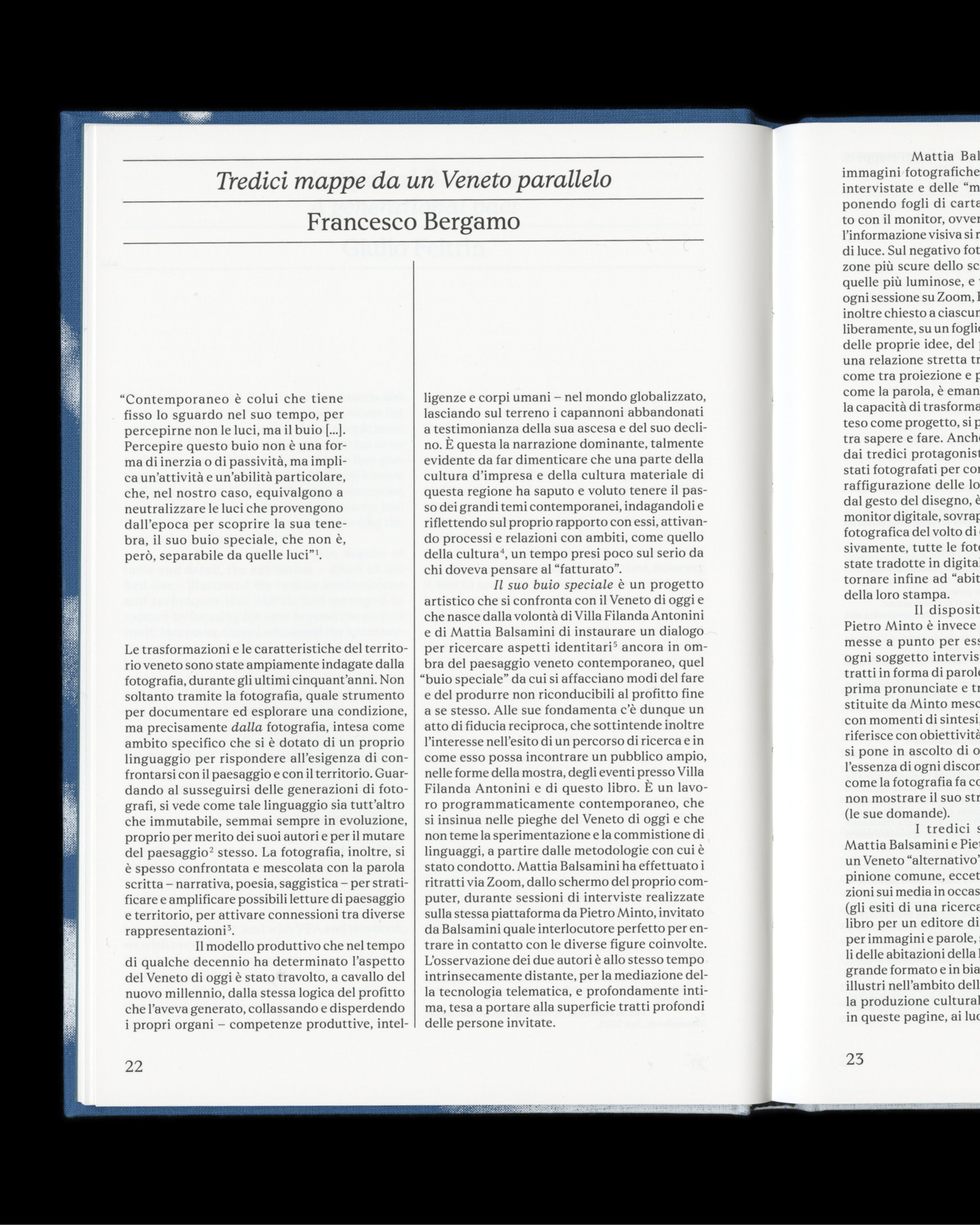 Il suo buio speciale is a collaborative project: born during the residency at Villa Filanda Antonini, the book maps an anthropogeographical landscape through images, faces and words of thirteen distinguished Venetians who have distinguished themselves in the arts and sciences. The portraits and landscapes photographed by Balsamini become, alongside Minto’s words, a tool through which to enter into dialogue with the territory and tell the story of a place that has always been characterized by the competitive logic of making, of producing, and that today, having exhausted the possibilities of exploiting only material resources, must transform sweated labor into another kind of commitment, giving new and legitimate dignity to “thinking.”