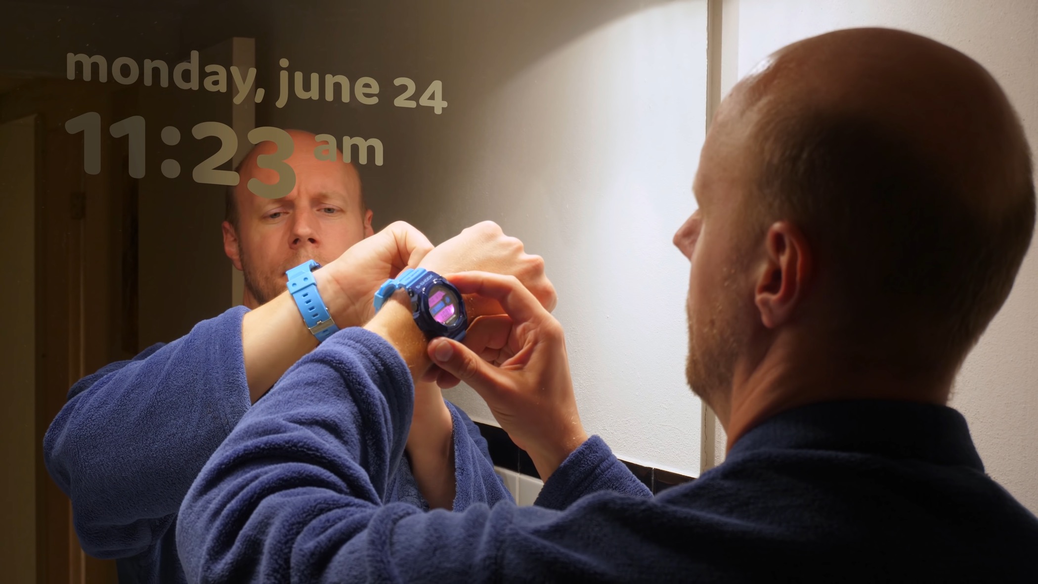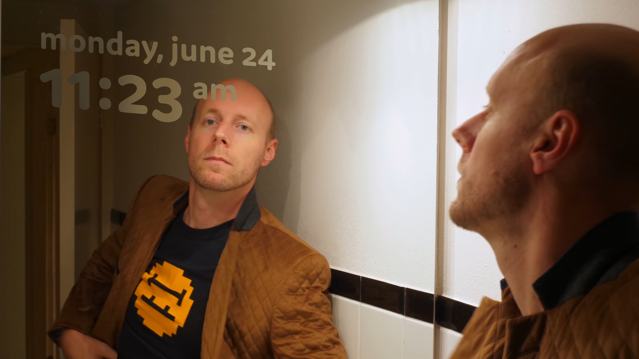 In his brilliant documentary on the history of LCD technology, YouTuber Michiel de Boer (Posy) imagines a mirror with a built-in DSM LCD clock. To demonstrate that such displays aren’t required to have the straight-sided, segmented forms we’re accustomed to seeing in old calculators and watches, he uses a totally different style of letterform: the rounded JAF Domus with lowercase letters and oldstyle/text figures.