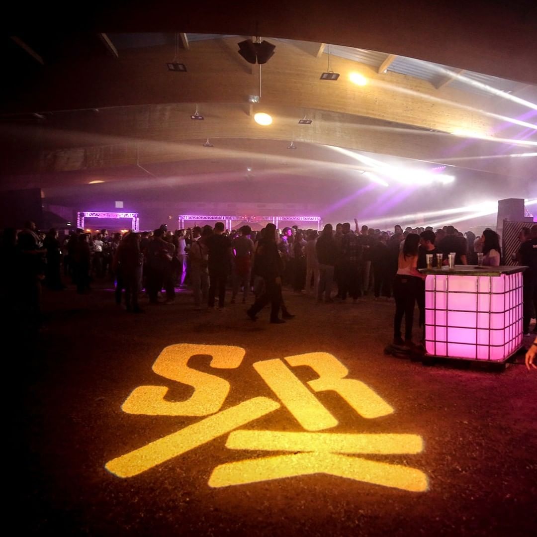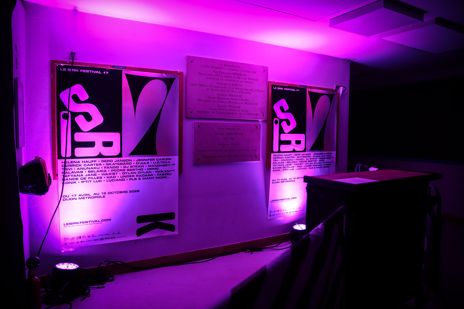 The Sirk logo in jumbled letters from Tempel Softland, projected onto the floor of Dijon’s Boulodrome