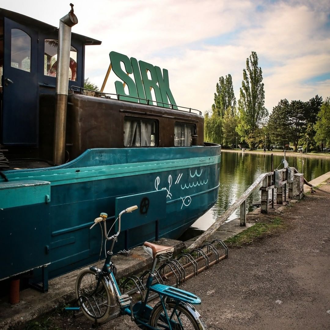 The Sirk logo in wooden letters welcome the visitors of the Péniche Cancale, a moored barge in Dijon’s Port du Canal