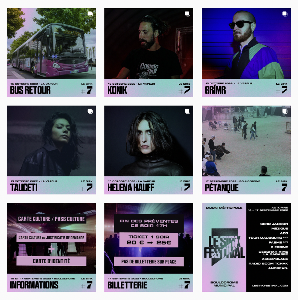 Superscript² from Lyon used a beta version for the visual identity of Sirk Festival. Since 2016, this annual celebration of electronic music takes place in Dijon, the center of the Bourgogne-Franche-Comté region in eastern France. The seventh edition was divided into three series of events, in spring, summer, and fall of 2022, featuring a roster of around forty artists. Venues ranged from a cosy houseboat (the Péniche Cancale) and a roofed sports ground (the Boulodrome Municipal Couvert) to a former military base at Aéroport Dijon-Bourgogne: once the home to Mirage fighter jets, the hangars now serve as peaceful dancefloors, with the walls shaking from the techno and house beats.