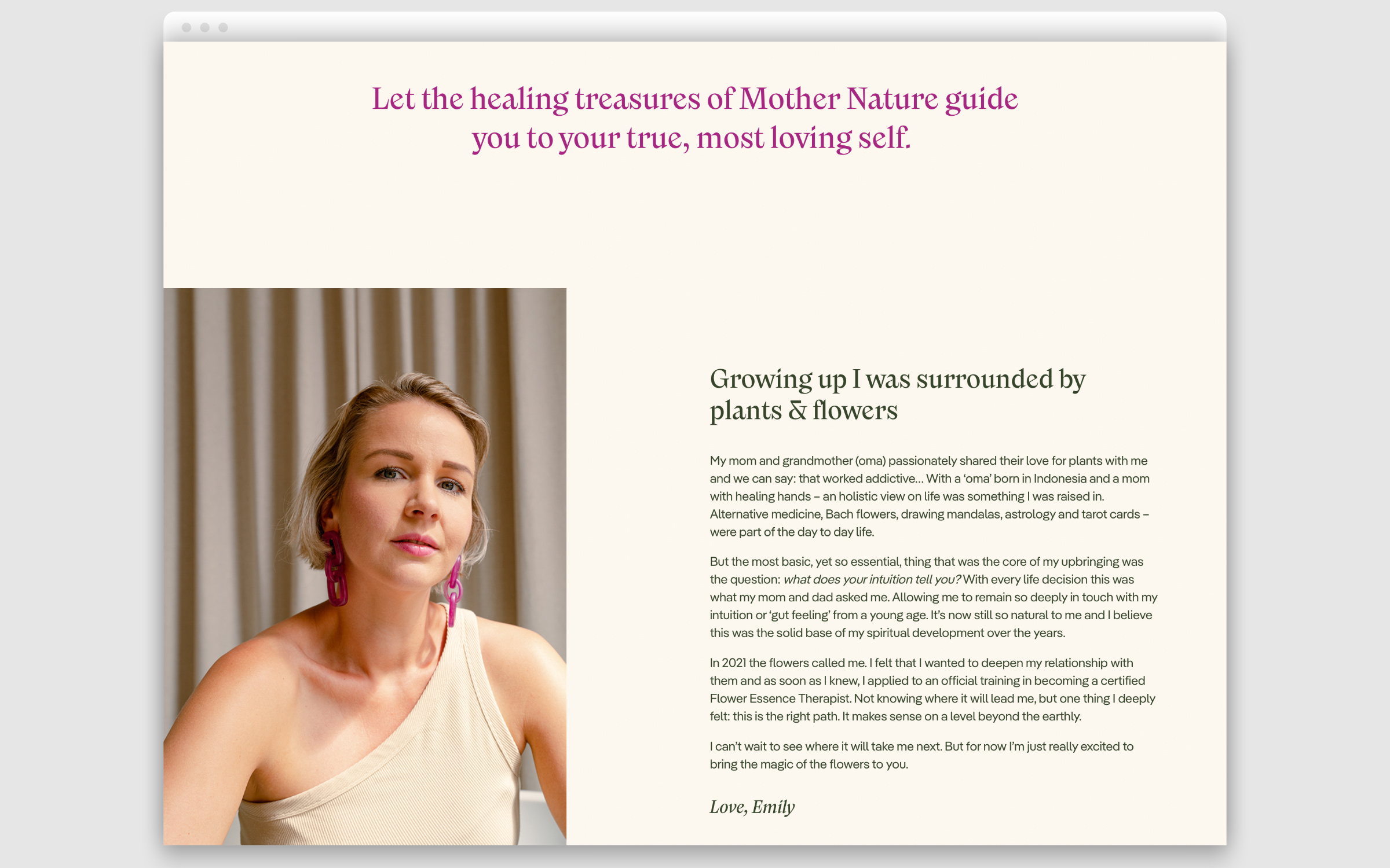 “What I like about Pangea is not only its appearance and legibility, but also the story behind the typeface. A quarter of the designer’s royalties go to climate protection, which for me closes the loop to my natural products.” explains Emily on her choice of Pangea. Whereas “the quirky Nikolai brings an edgy twist to my brand. She’s feisty, bold and quite far from the visual clichés in mental health or holistic medicine marketing.”