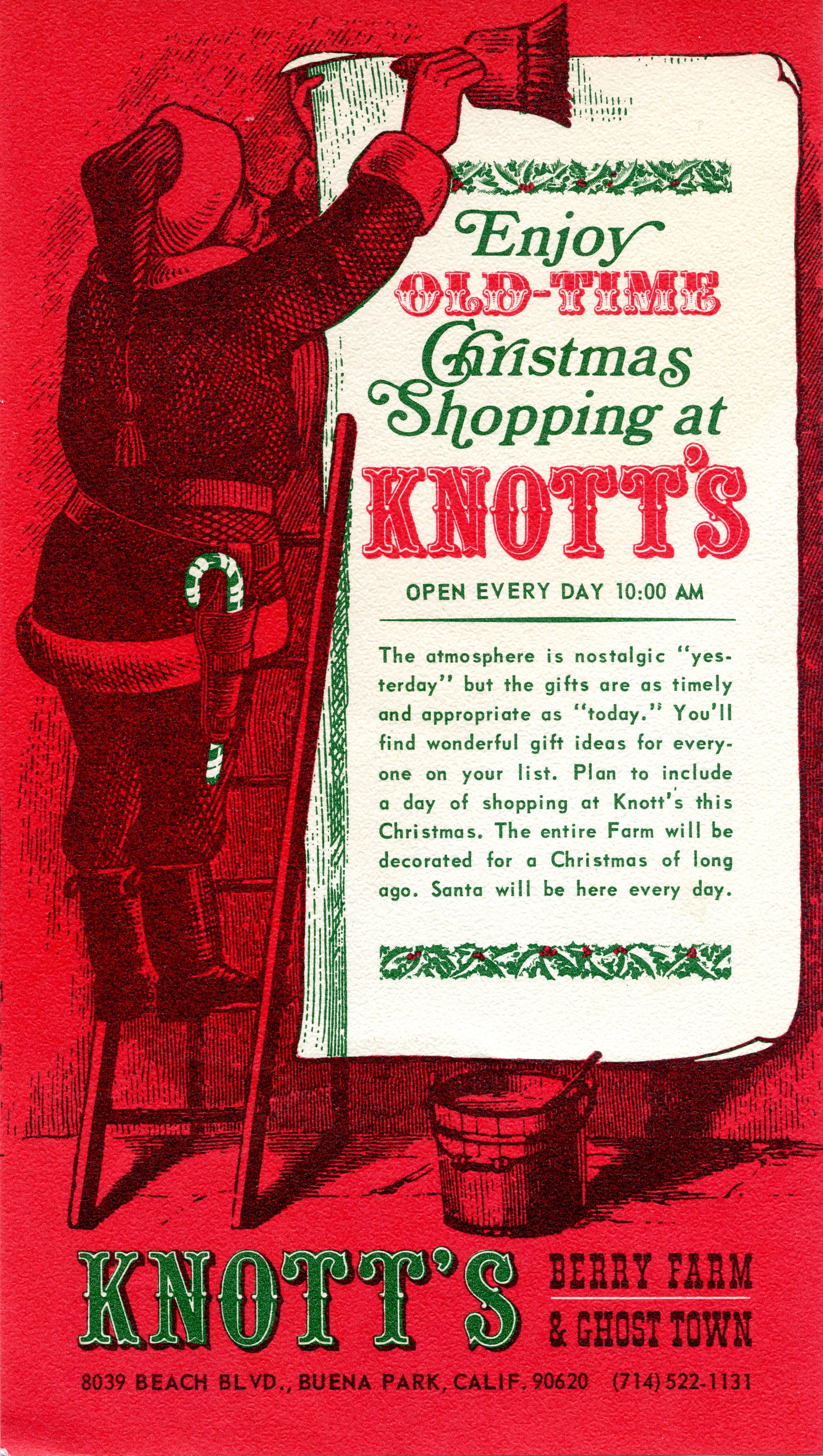 Santa Claus caught flyposting! Undated ad (late 1960s/early 1970s?) for the Christmas events at Knott’s Berry Farm & Ghost Town, a theme park located in Buena Park, California.
