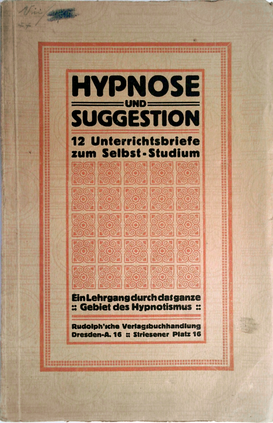Erwin Le Mang’s Hypnosis and Suggestion offers “a course through the whole field of hypnotism”, in “12 teaching letters for self-study”. The booklet was printed in a number of editions, many of which show distinct cover designs. The general layout is similar: the title is set in all caps, stacked and justified, with the word “und” framed by lines or ornaments; and the whole text block is enclosed in decorative border elements. The fonts in use are different for each of the designs.