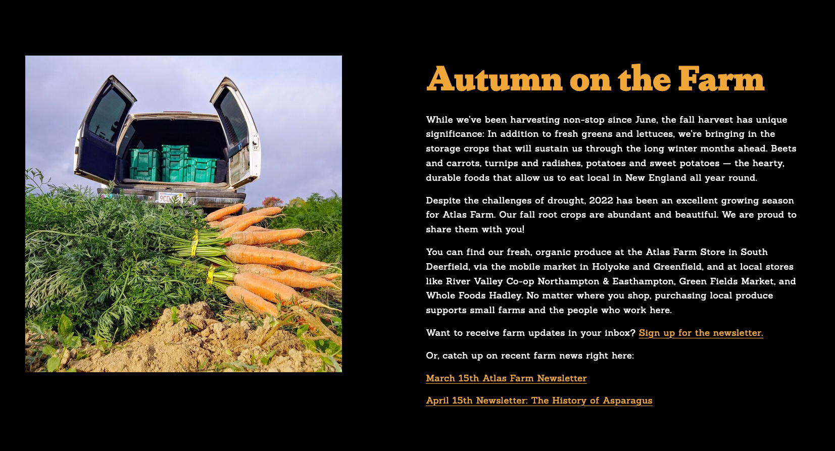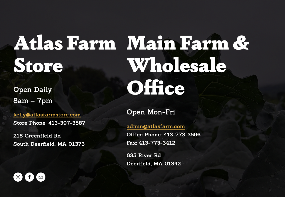 Founded in 2004, Atlas Farm is a family business in Deerfield, Massachussetts, selling its certified organic produce throughout New England. The website is designed using two sturdy slab-serif typefaces.