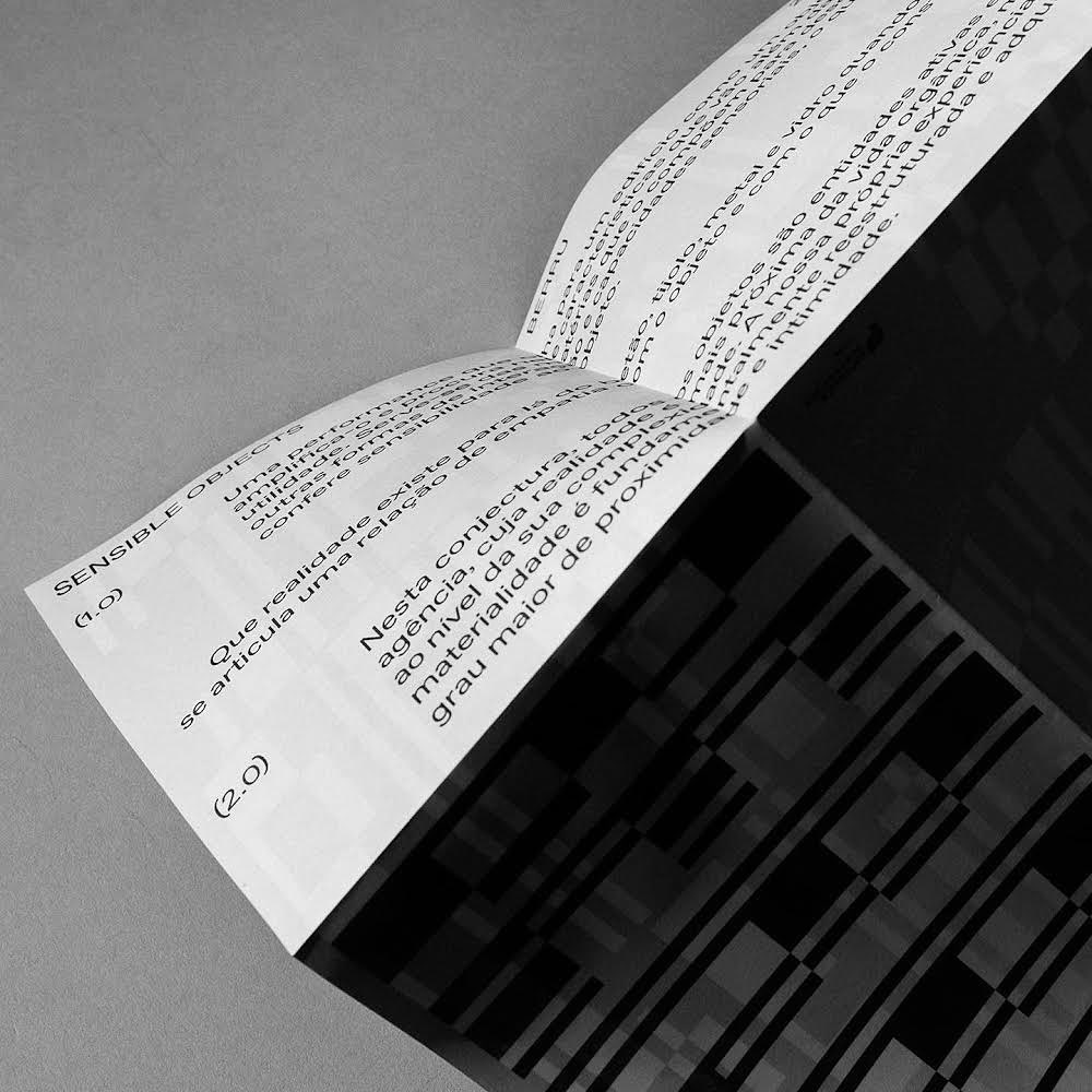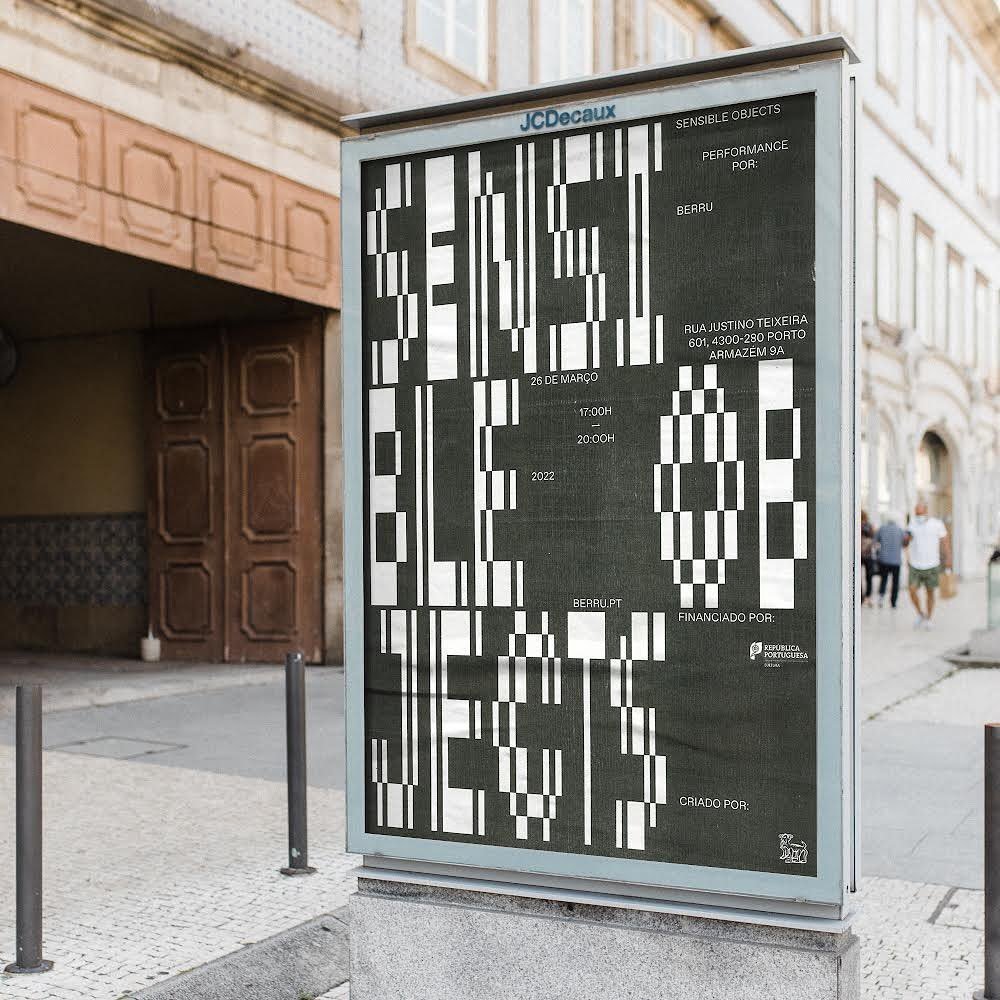 It appears that designer Miguel Mesquita is being slightly ironic about the statement of the artists – the Quattrocode typeface used for the performance’s identity grew out of the PDF417 barcode that helped fully automate the goods accounting process at warehouses. The grotesk used for additional information appears to be ABC Favorit.