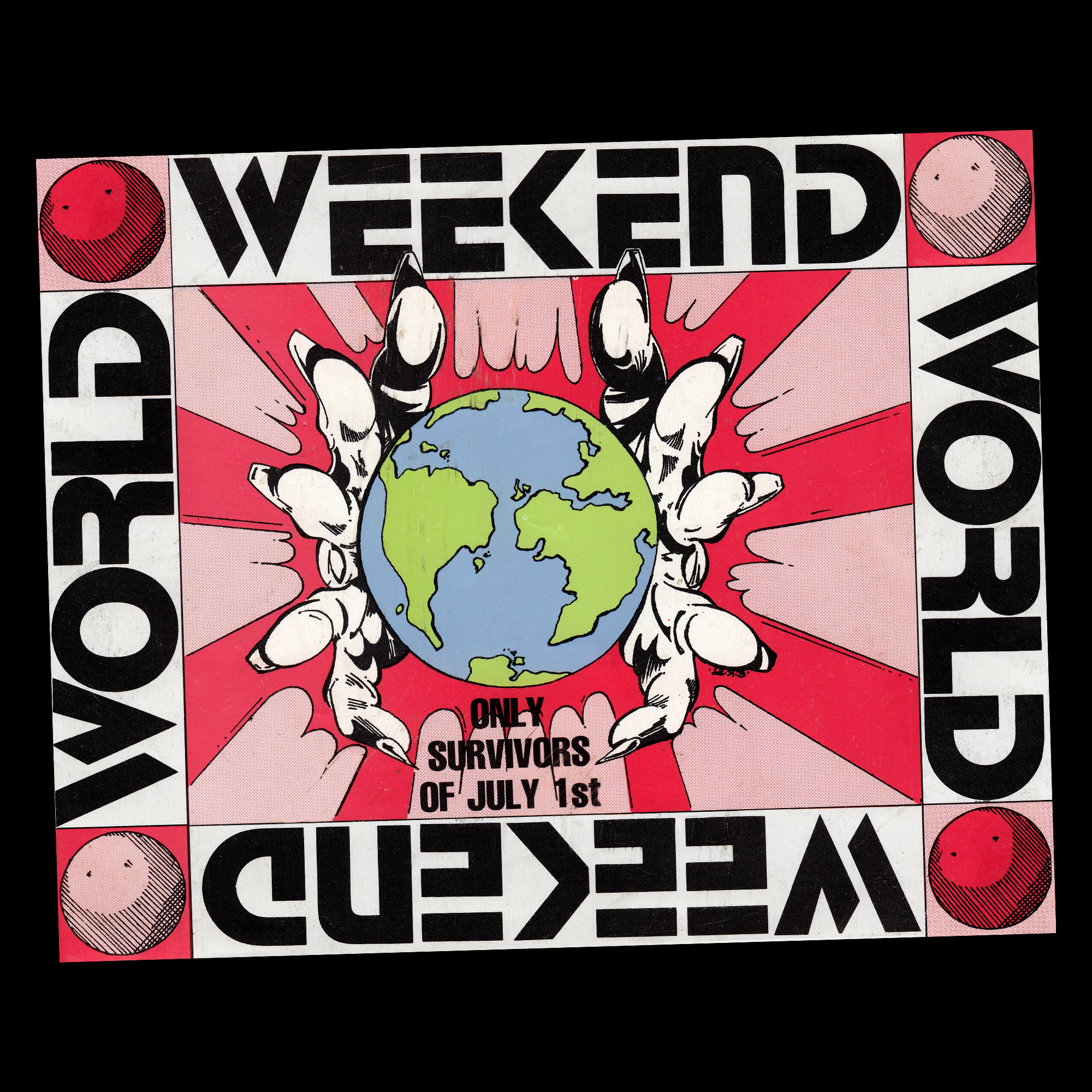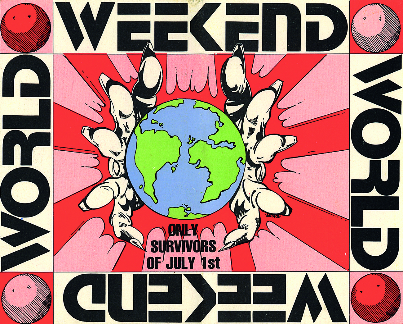 Weekend World is a group of organizers of events in the 1990s in the rave party movement. This flyer was designed for Weekend World 1989 Part II, held at M25 Orbit on August 5, 1989.
