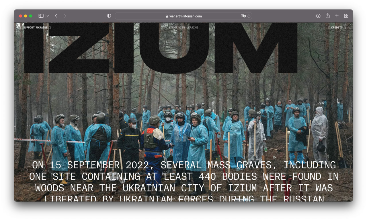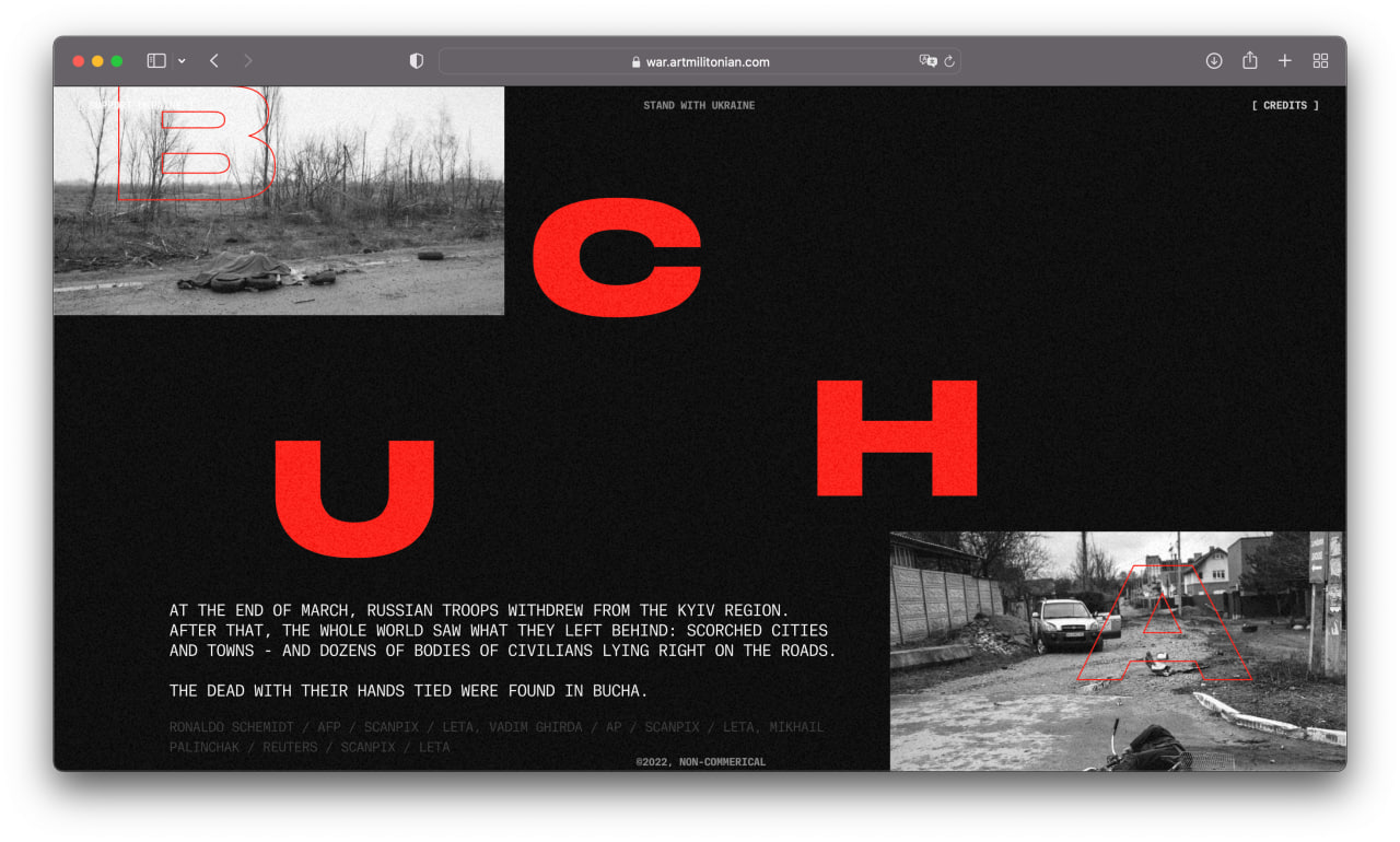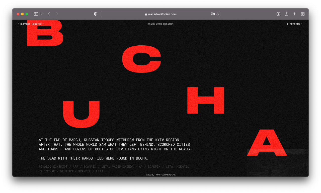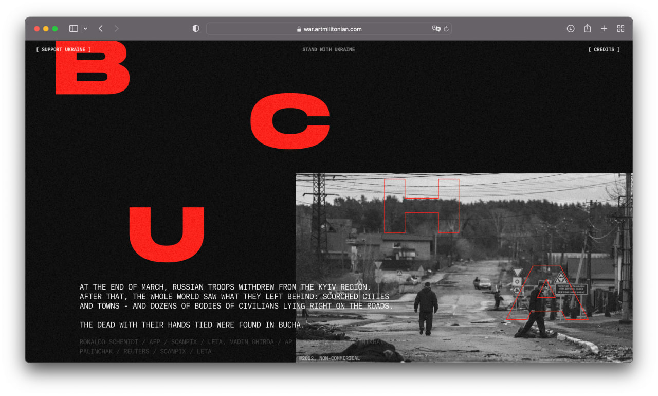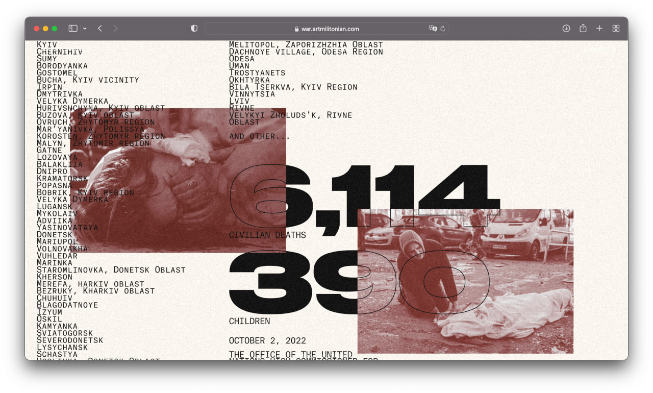 I am a product designer, but sometimes I create non-commercial long reads with Readymag. First I brought together a project about Armenian genocide, and later, in late October 2022, a project about the war. These two projects received more than 40 design awards and mentions, including Awwwards and The FWA.