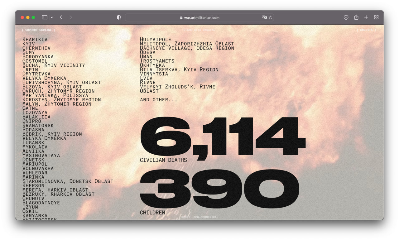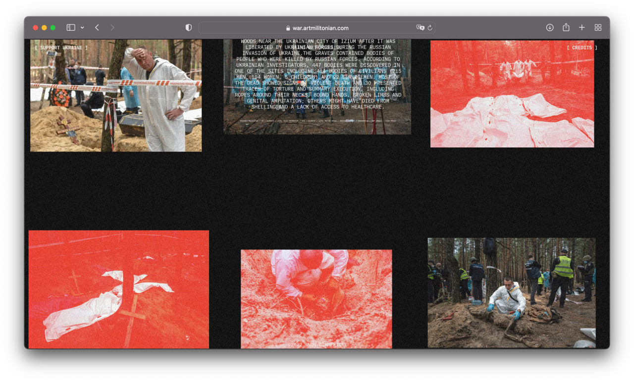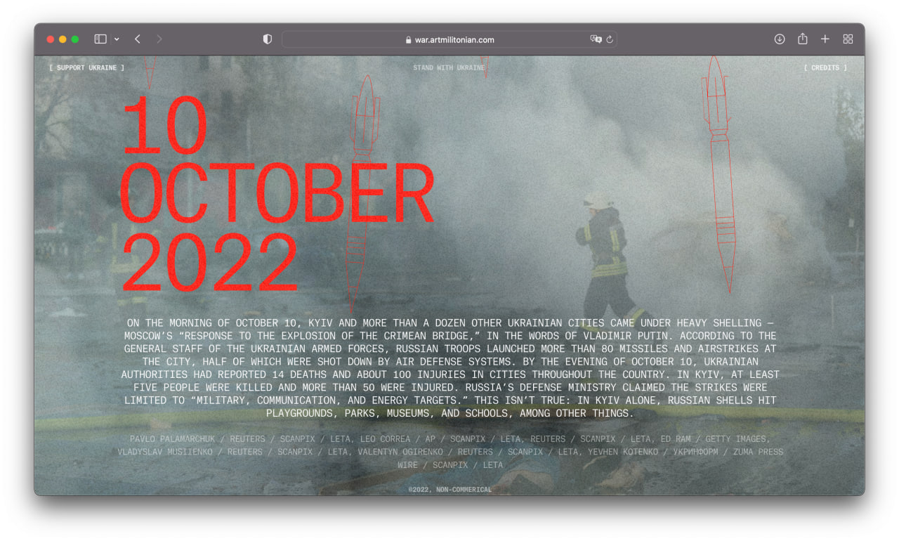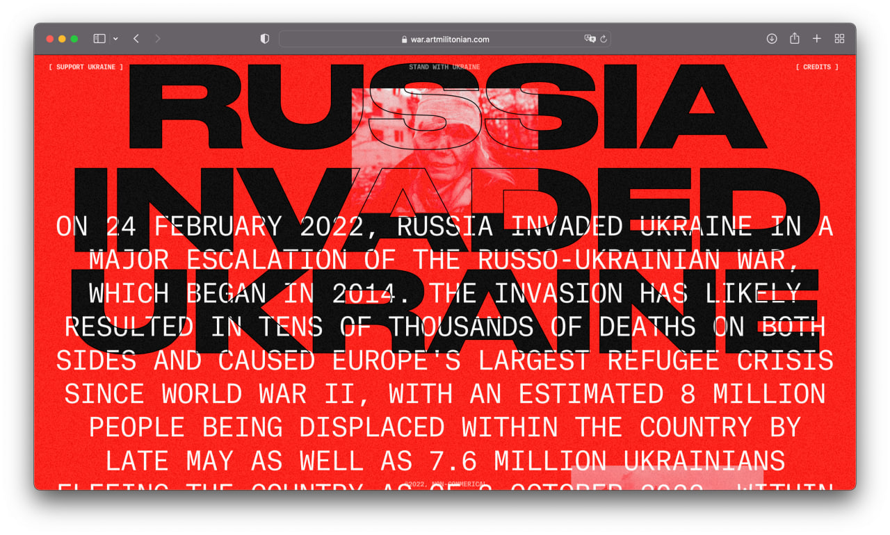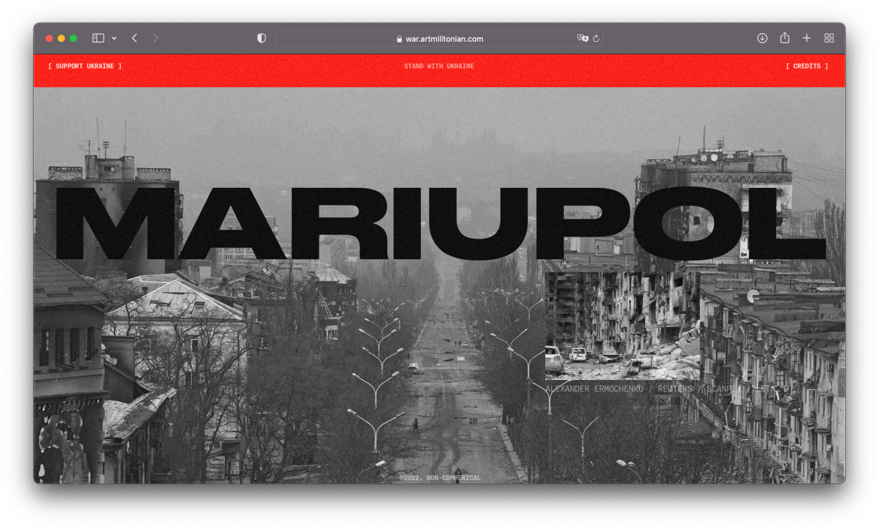 I am a product designer, but sometimes I create non-commercial long reads with Readymag. First I brought together a project about Armenian genocide, and later, in late October 2022, a project about the war. These two projects received more than 40 design awards and mentions, including Awwwards and The FWA.