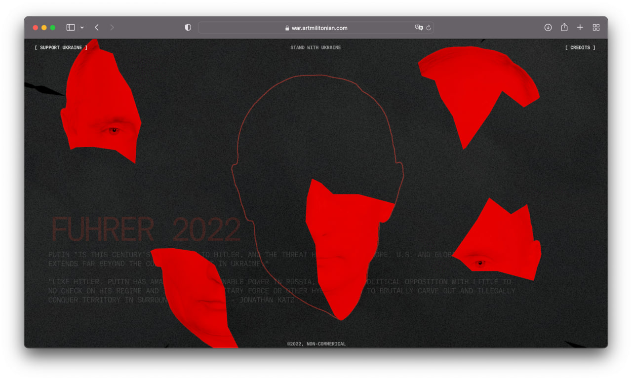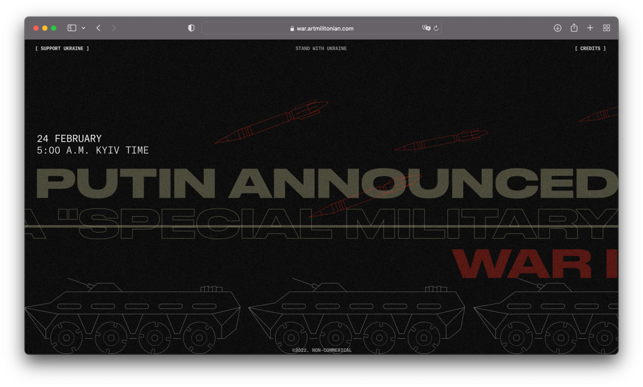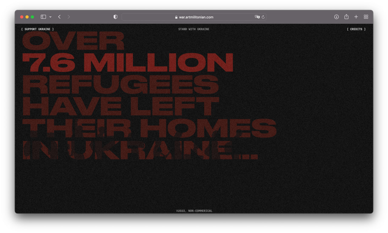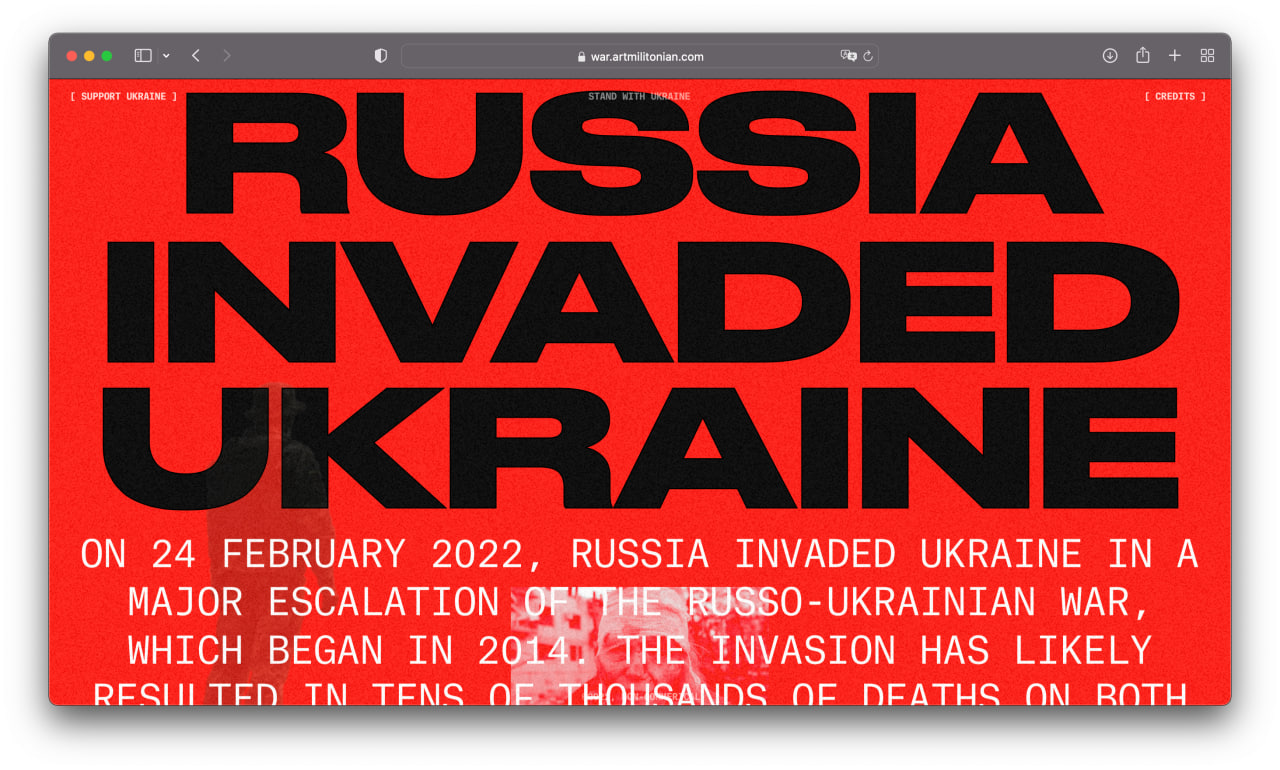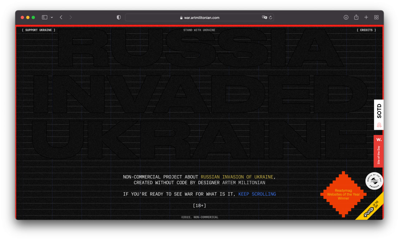 I am a product designer, but sometimes I create non-commercial long reads with Readymag. First I brought together a project about Armenian genocide, and later, in late October 2022, a project about the war. These two projects received more than 40 design awards and mentions, including Awwwards and The FWA.