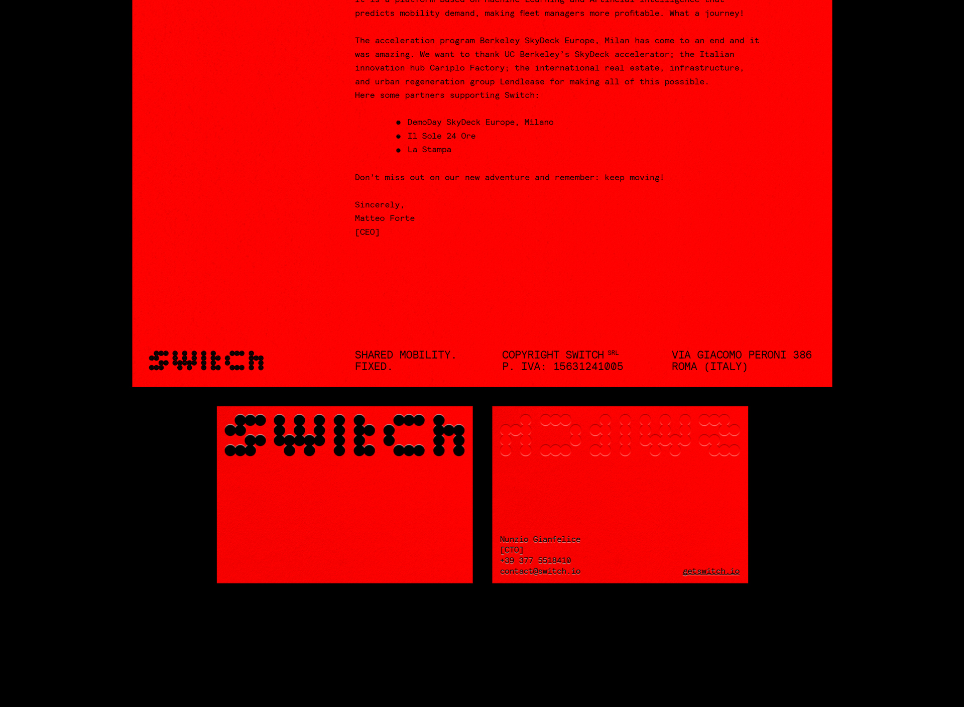 The logo takes inspiration from the circular areas that the company uses to delimit portions of the city, according to various and specific parameters. The use of circles is the recurring mantra of Switch’s brand identity, starting from the logo: a custom lettering drawn on a 4 units tall grid.