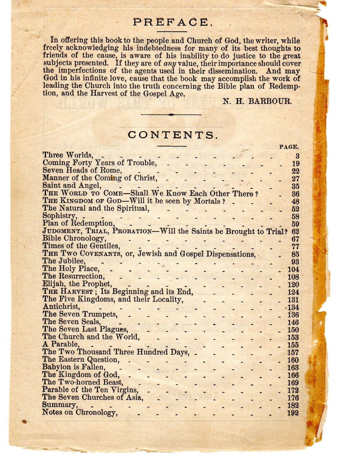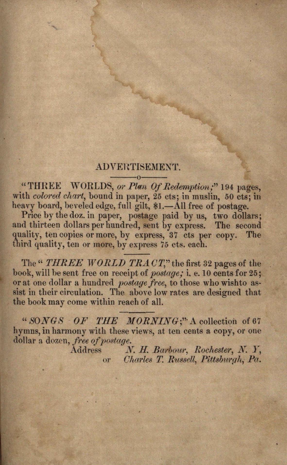 Three Worlds; or, Plan of Redemption (a.k.a. Three Worlds, and the Harvest of This World) was the first book written by Charles Taze Russell co-authored with Nelson Barbour in 1877