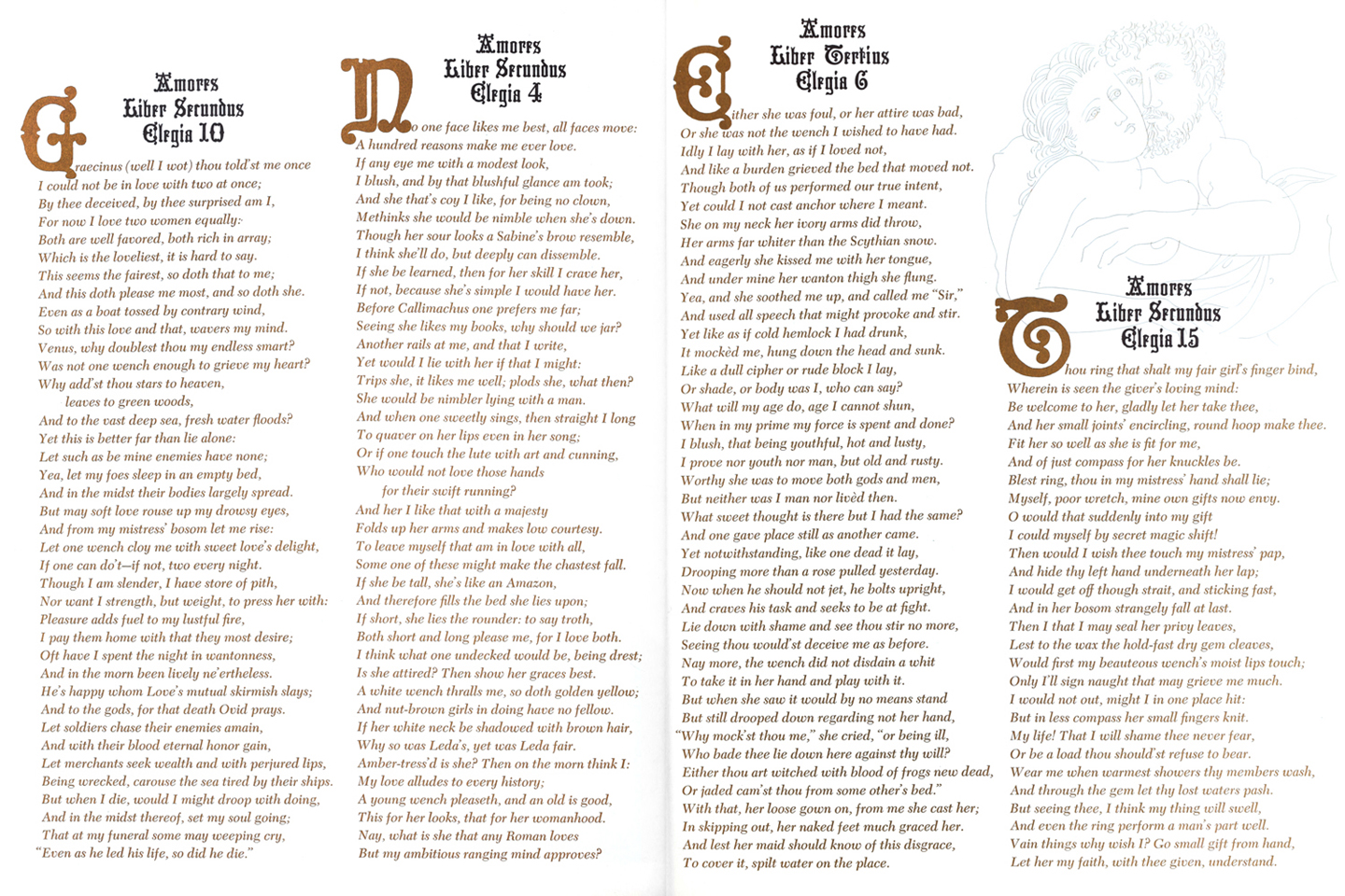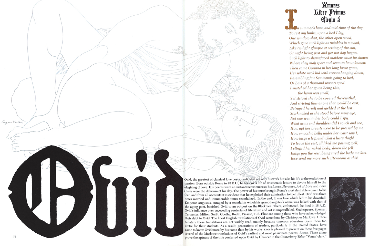 Ovid, the greatest of classical love poets, dedicated not only his work but also his life to the exaltation of passion. Born outside Rome in 43 B.C., he forsook a life of aristocratic leisure to devote himself to the elegizing of love. His poems were an instantaneous success; his Loves, Heroines, Art of Love and Love Cures were the delirium of his day. The power of his muse brought Rome’s most desirable women to his feet, and from all accounts it is evident that he exploited their admiration to the fullest. Ovid was three times married and innumerable times scandalized. In the end, it was love which led to his downfall. Emperor Augustus, enraged by a scandal in which his granddaughter’s name was linked with that of the aging poet, banished Ovid to an outpost on the Black Sea. There, embittered, he died in 18 A.D. Ovid’s influence over succeeding centuries of literature and art is unparalleled. Shakespeare, Spenser, Cervantes, Milton, Swift, Goethe, Rodin, Picasso, T.S. Eliot are among those who have acknowledged their debt to Ovid. The finest English translations of Ovid were done by Christopher Marlowe. Unfortunately these translations are not widely read, mainly because timorous educators deem them too erotic for their students. As a result, generations of readers. particularly in the United States, have come to know Ovid more by his name than by his works. EROS is pleased to present on these five pages several of the Marlowe translations of Ovid’s earliest and most passionate poems, Loves. These alone prove the aptness of the title conferred upon Ovid by Chaucer in the Canterbury Tales: “Venus’ clerk.”
