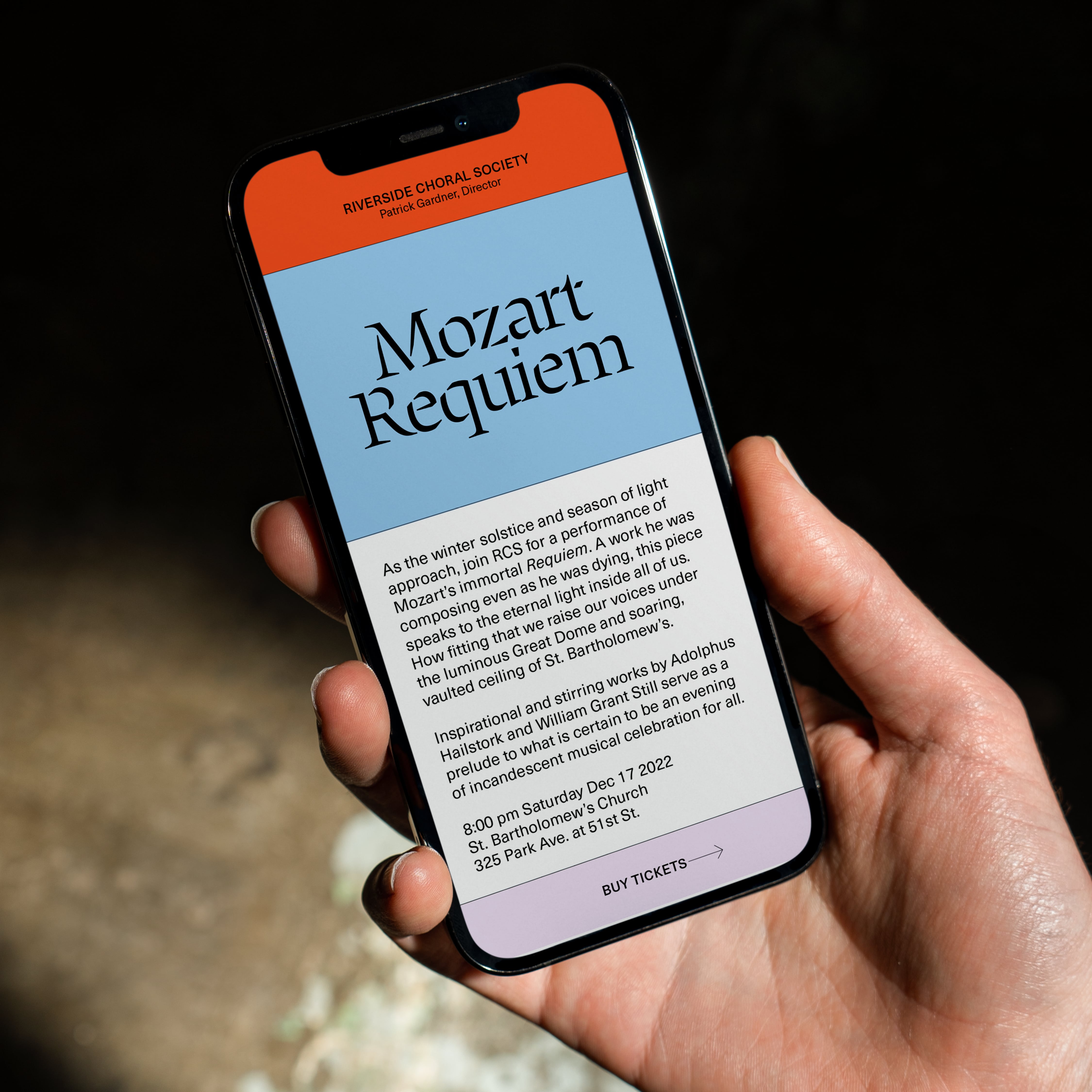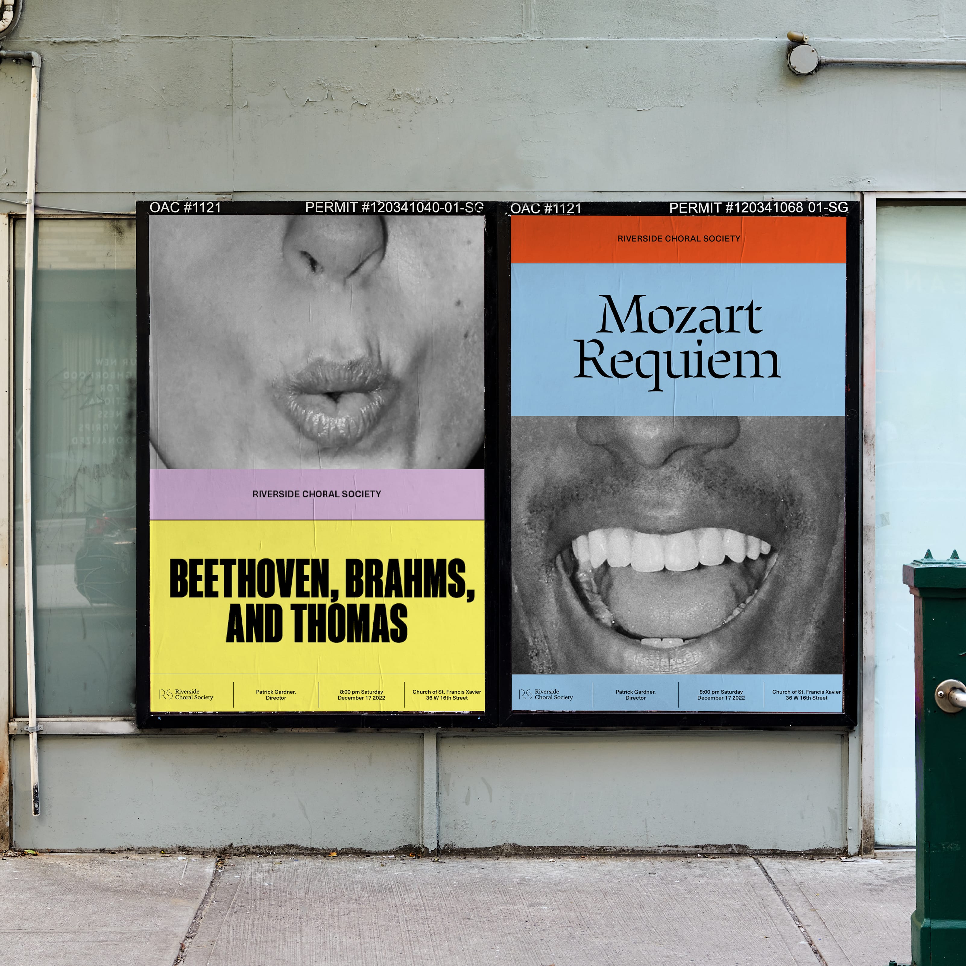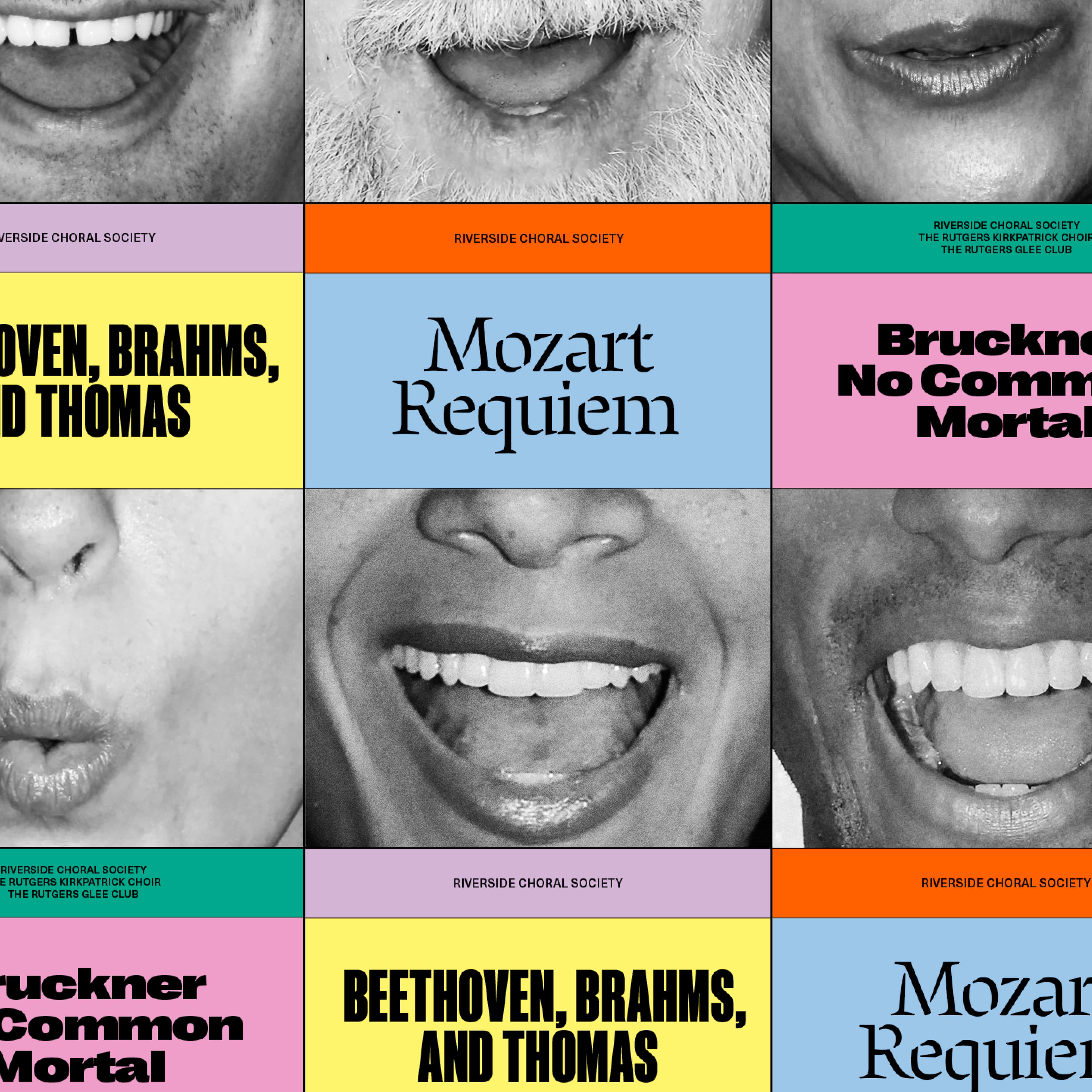 New York-based designer Hannah Nathans works with an everchanging selection of typefaces to promote performances from the Riverside Choral Society. Etude by Emily Atwood is used as the typographic voice for Mozart’s Requiem. The one for Bruckner’s No Common Mortal is Right Grotesk by Alex Slobzheninov. The bold condensed sans used for “Beethoven, Brahms, and Thomas” is yet unidentified. All designs are supported by Neue Haas Unica.