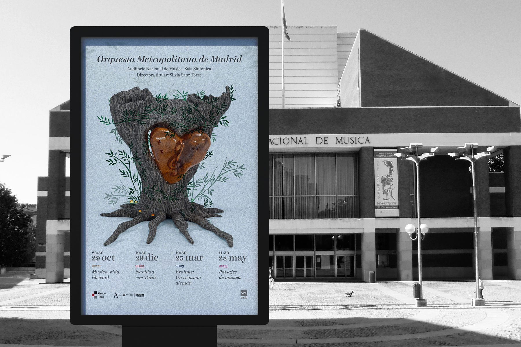 They commissioned NehNah Studio for the posters, hand programs and promotional videos for their 2022–23 season concerts, with Schotis accompanying their 3D illustrations. The typeface family by Manufacturas Gráficas Madrileñas is used in both optical sizes, Display and Text.