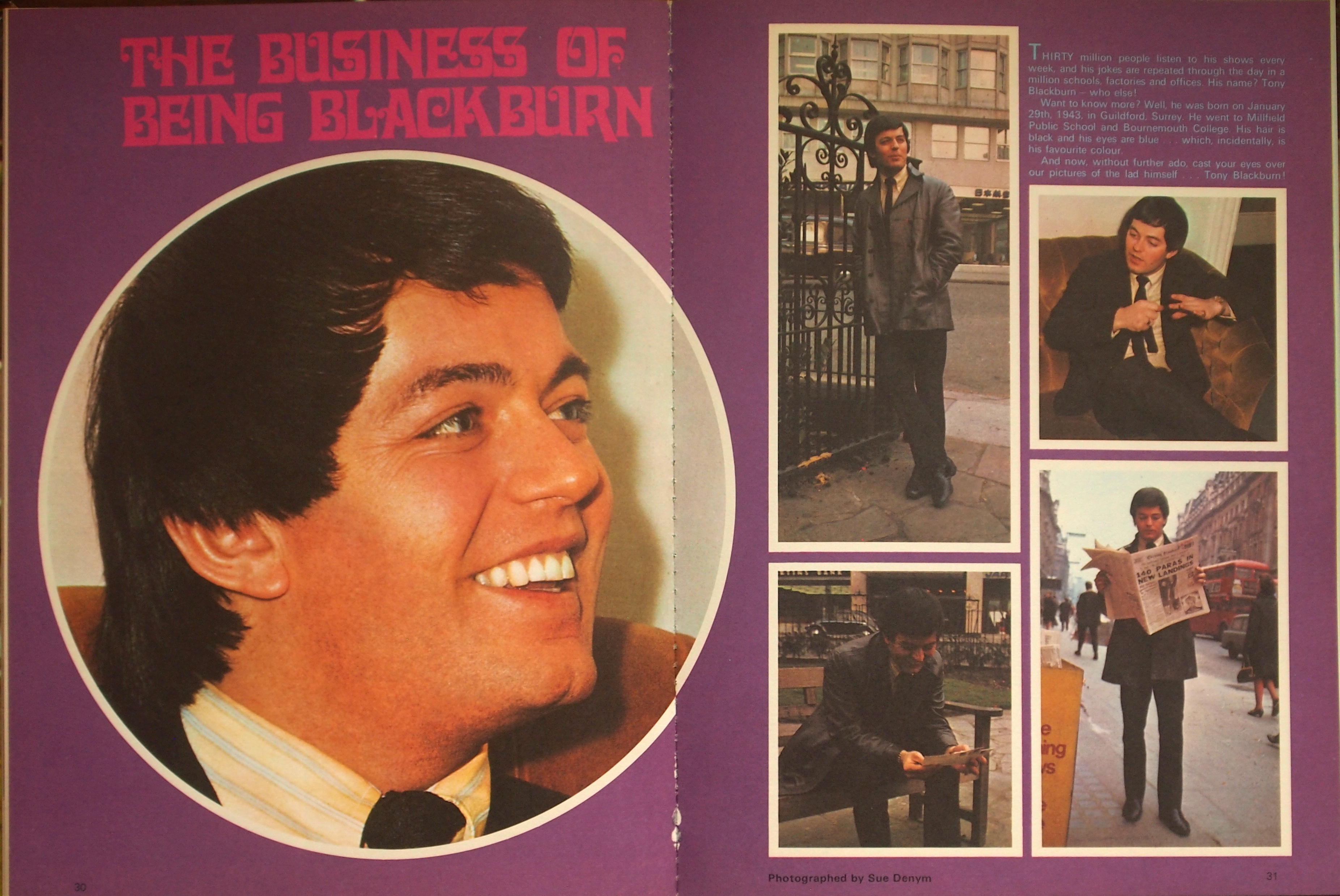 This two-page spread (pp. 30/31), entitled “The business of being Blackburn” appeared in the Daily Mirror Book for Girls 1972, published by the Hamlyn Publishing Group Limited in 1971 and printed by Litografia A. Romero S.A., Santa Cruz de Tenerife, Canary Islands, with photographs by Sue Denym. Davida is set in pink on a purple background, which seems typical of its age. The body text in sky blue is set in Univers.