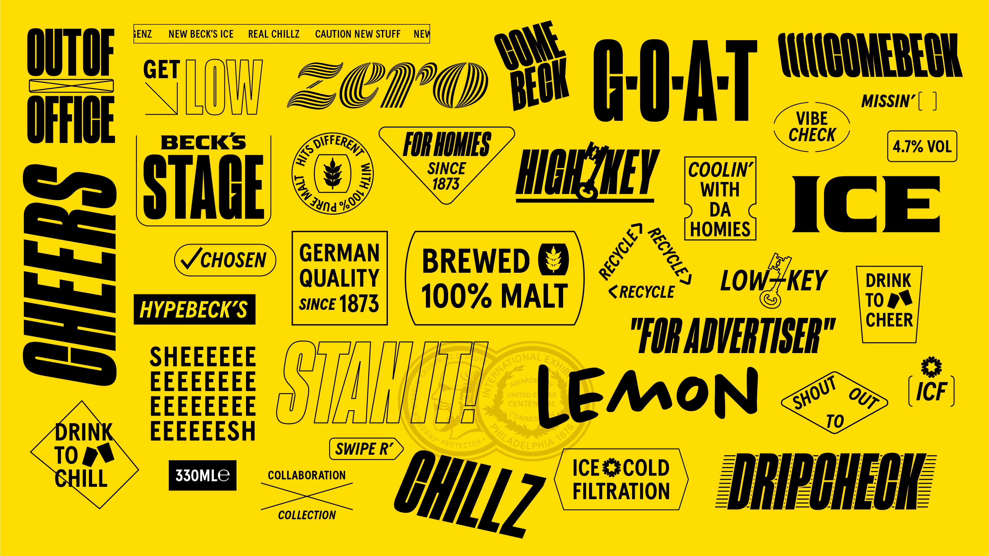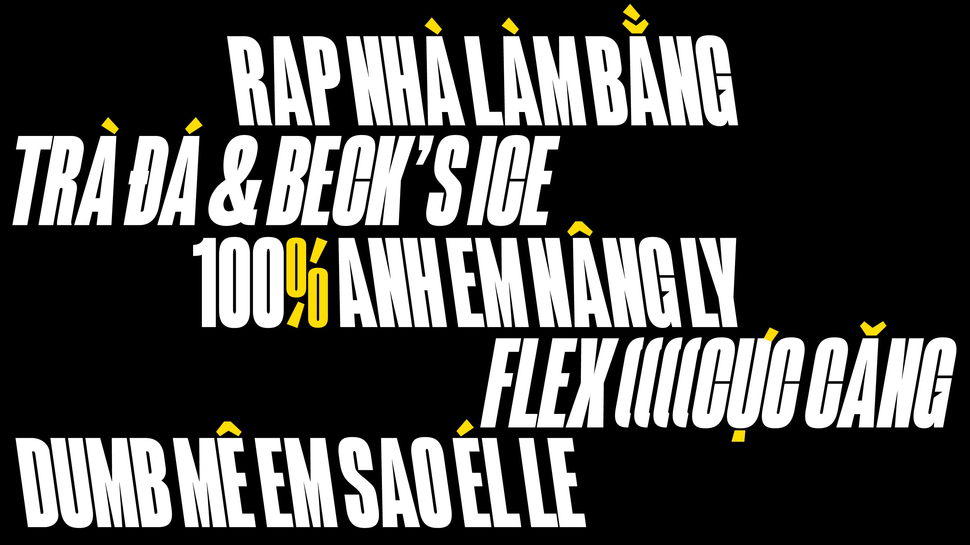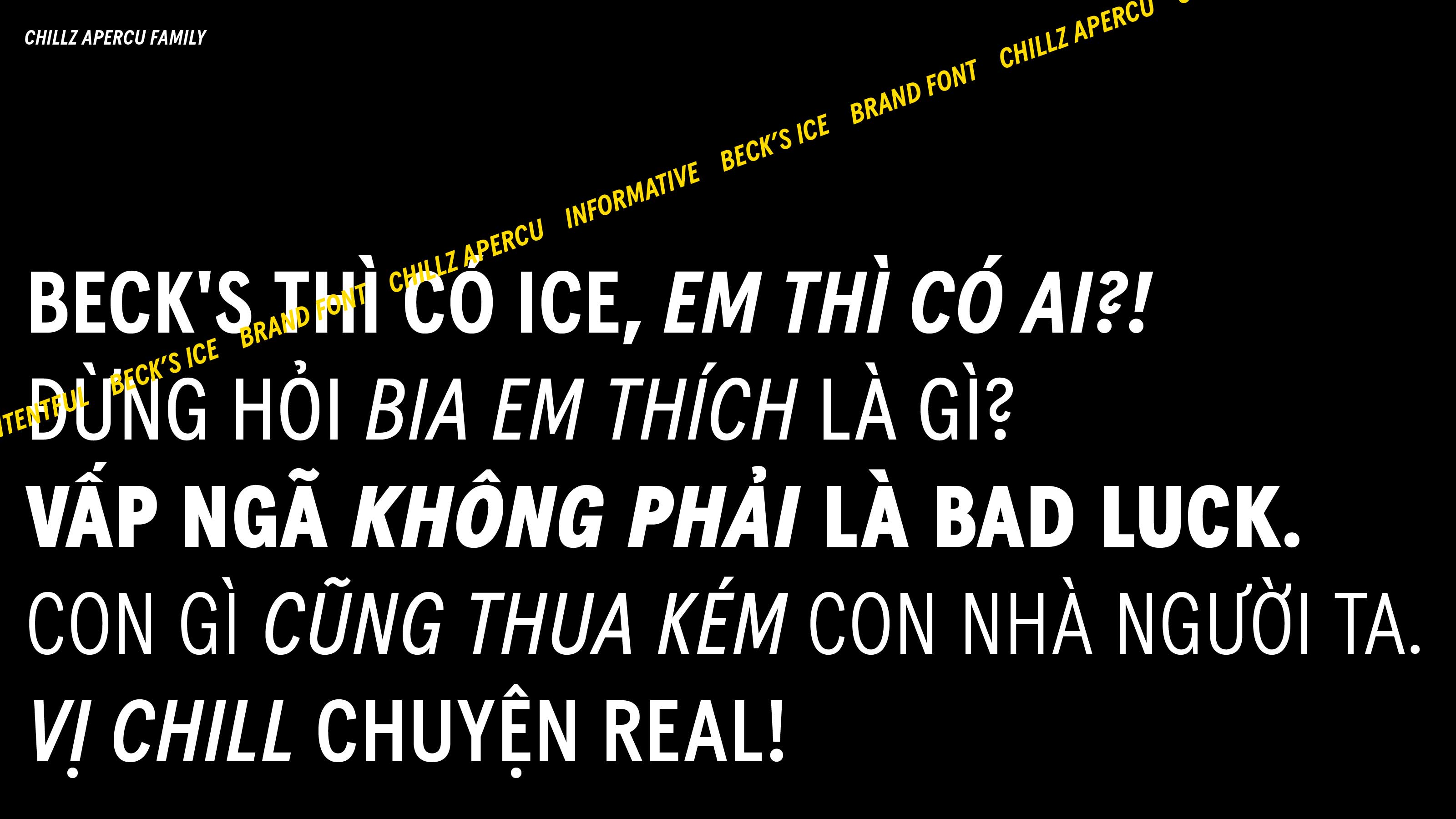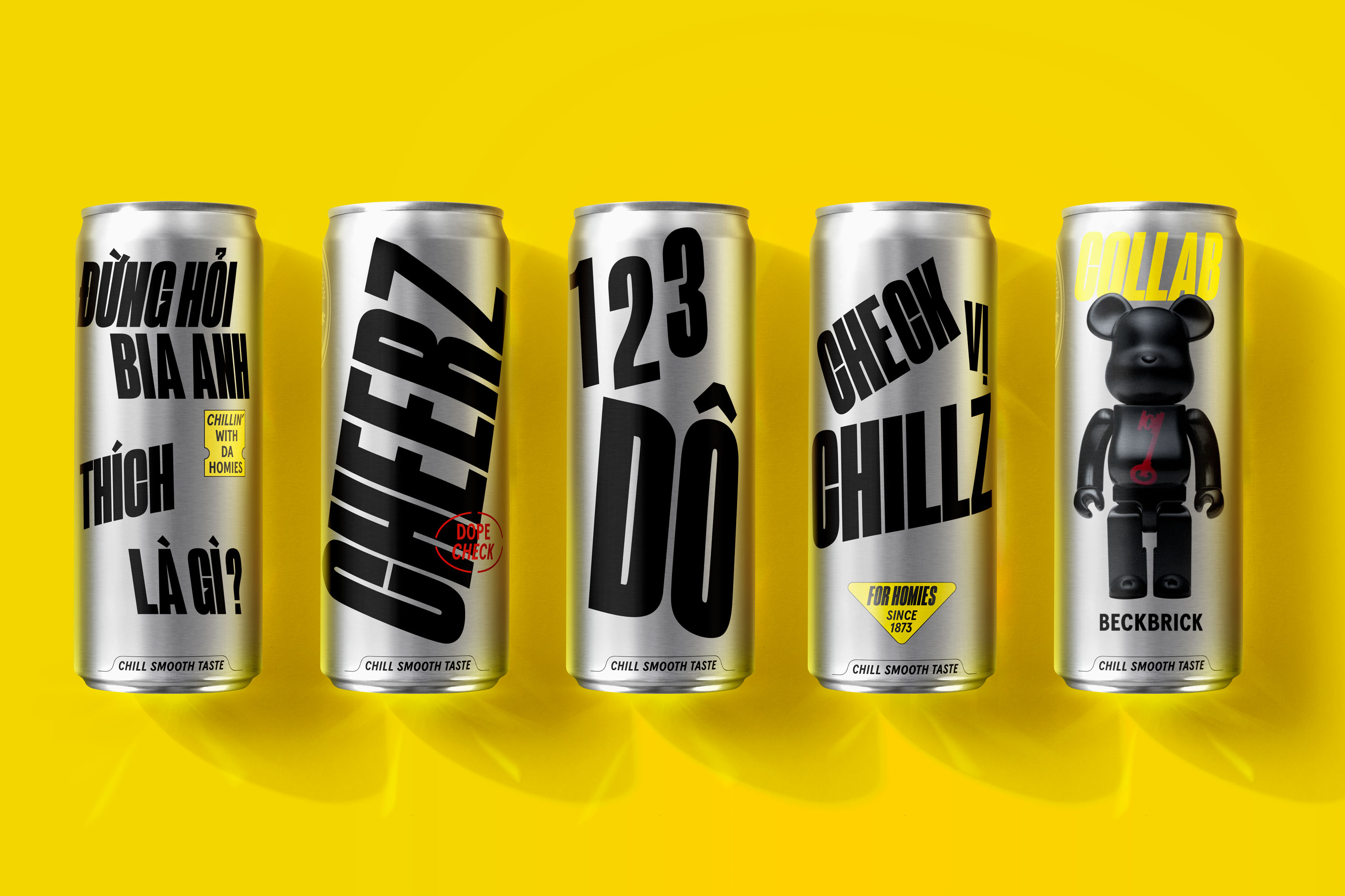 Through its Beck’Stage festival, the brand focuses deeply on verbal communication such as rap, musical lyrics and trending verbal sayings. Therefore, typography naturally becomes brand key elements to visualize and design their messages. Vietnamese support was added to the two brand typefaces: Arges (Blaze Type) and Aperçu Condensed (Colophon). The custom version of Arges was rebranded as Chillz Display with “cheering diacritics” inspired by pouring and clinking moments when drinking; a new Beckslant (backslant) style supports the typographical expression. Chillz Aperçu is used in multiple weights as supportive “hypebeast” typeface for body copy.