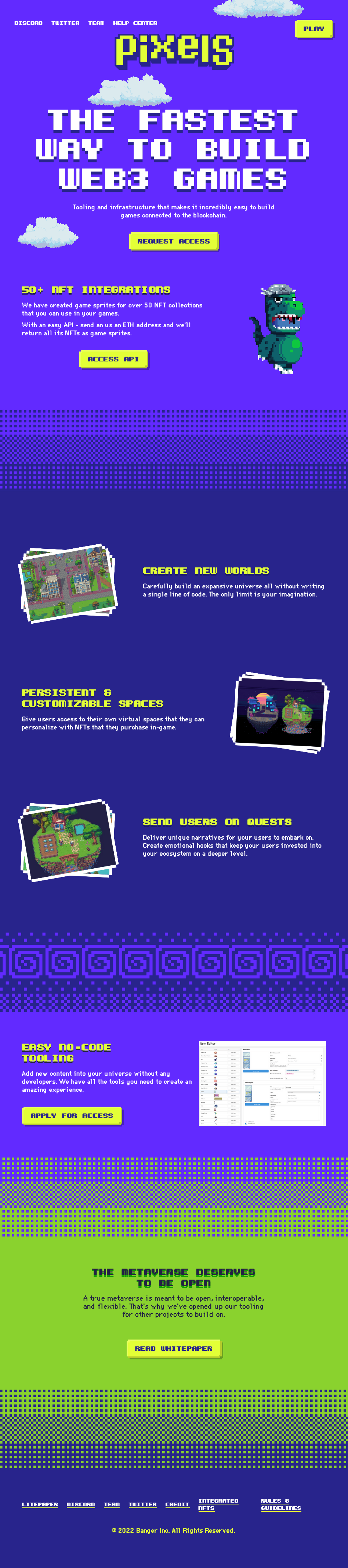 Pixels is a Web3 platform where players can manage land, grow plants and raise animals, as well as build communities and explore an endlessly evolving world.