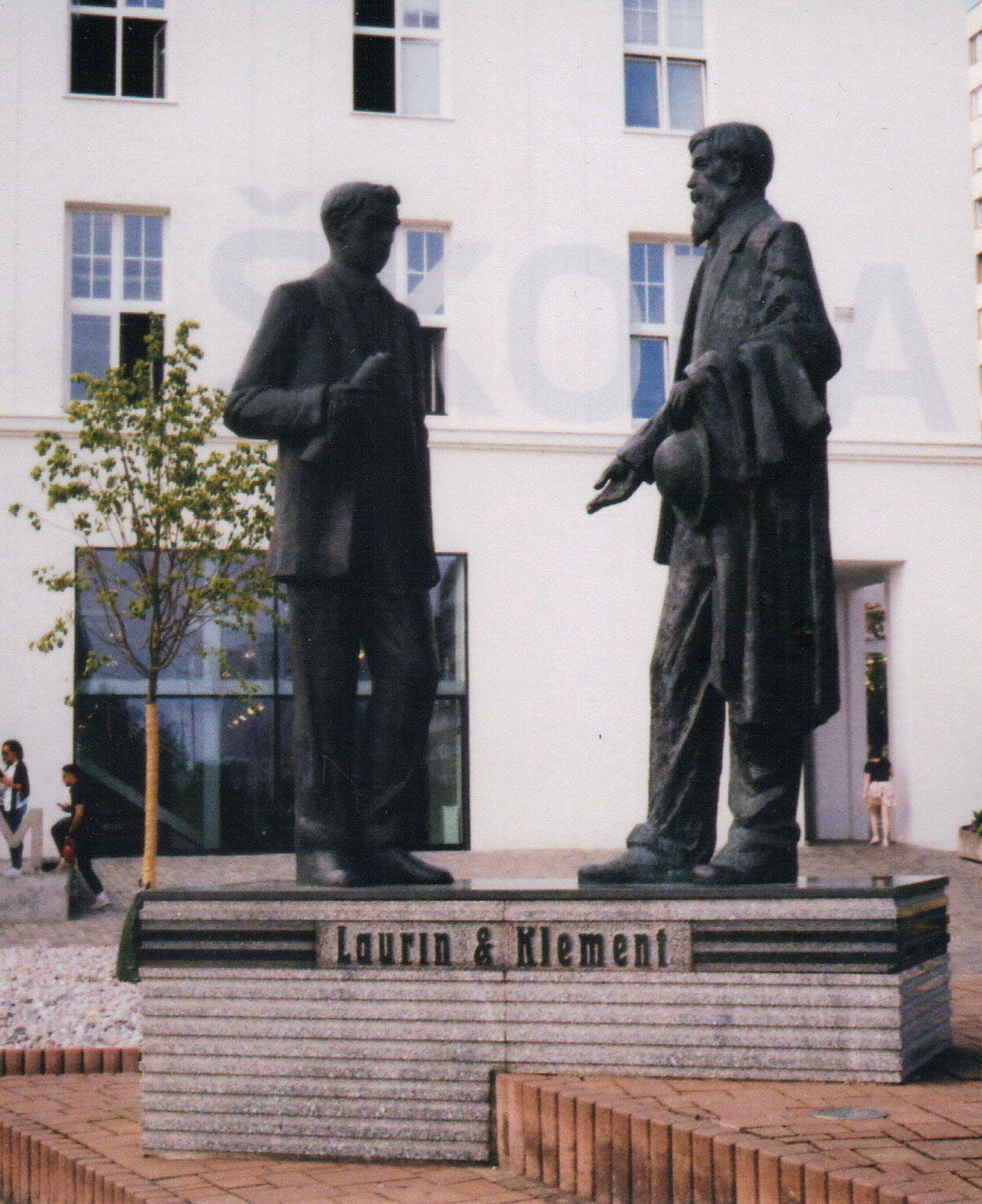 The statues, in honour of the co-founders of Laurin & Klement, the predecessor to Škoda Auto, Václav Laurin and Václav Klement, were created by Michal Moravec (b. 1951) and installed in 2005. The sign with their names uses Reklameschrift Herold. This display typeface by the Berthold foundry was first cast in 1901, six years after the two automotive pioneers founded their company, and four years before they started producing cars.