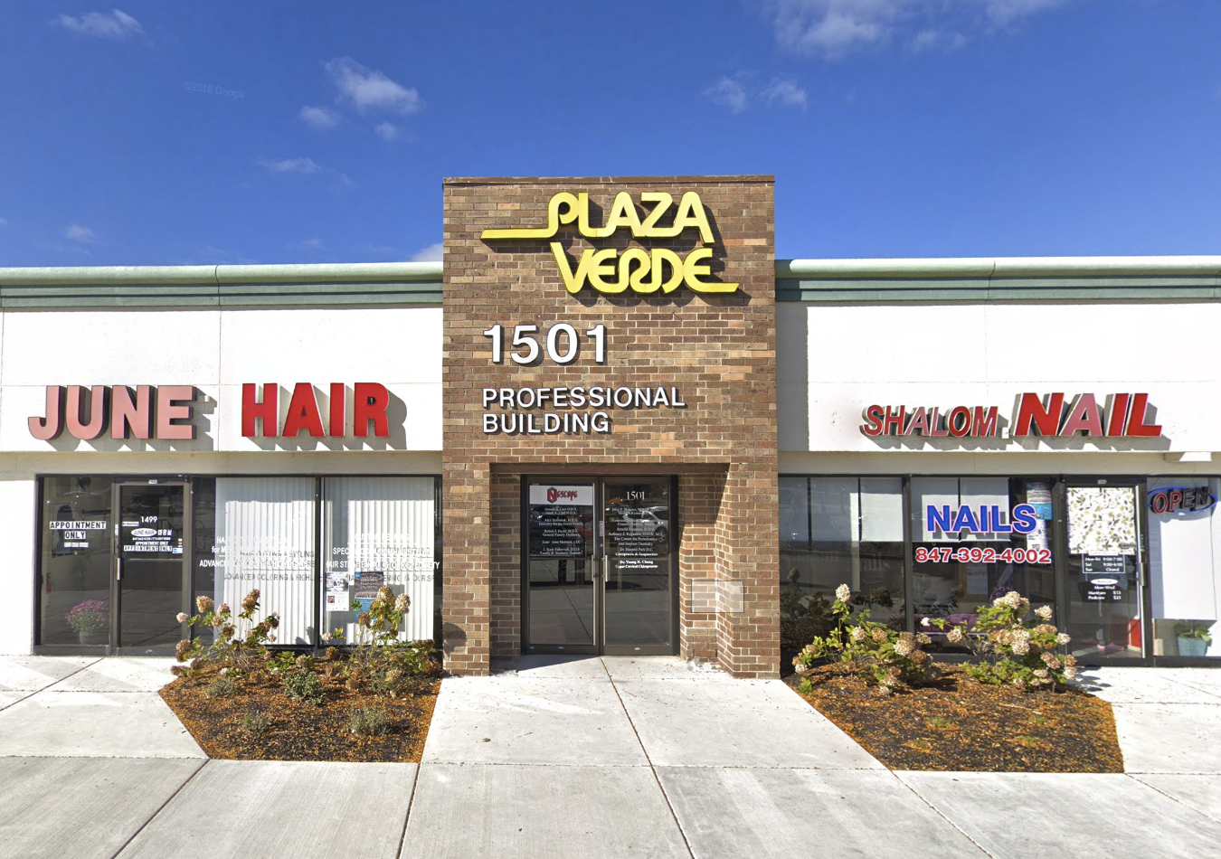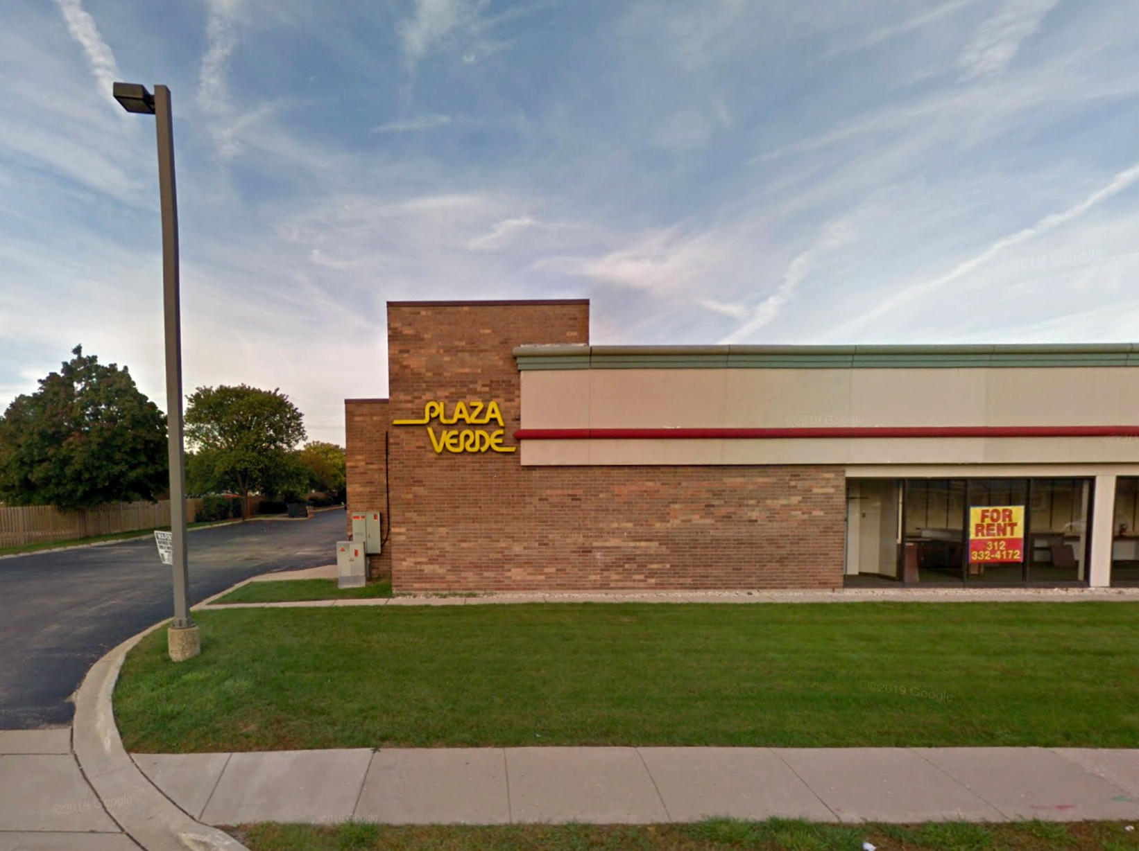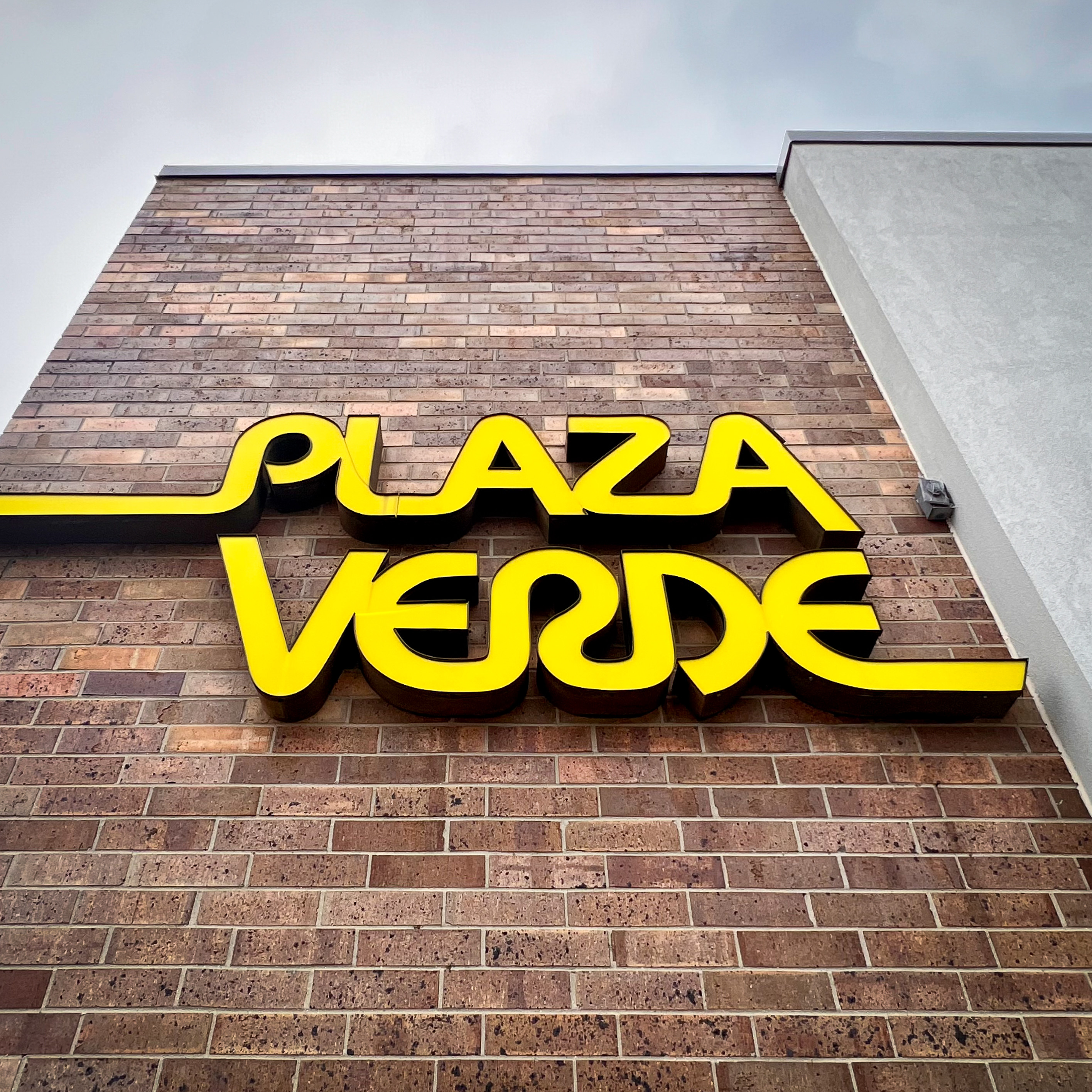 Plaza Verde is a shopping center on Illinois Route 68 in Arlington Heights, a municipality in Cook County and a suburb of Chicago. The yellow signs with the name use Yagi Universal.