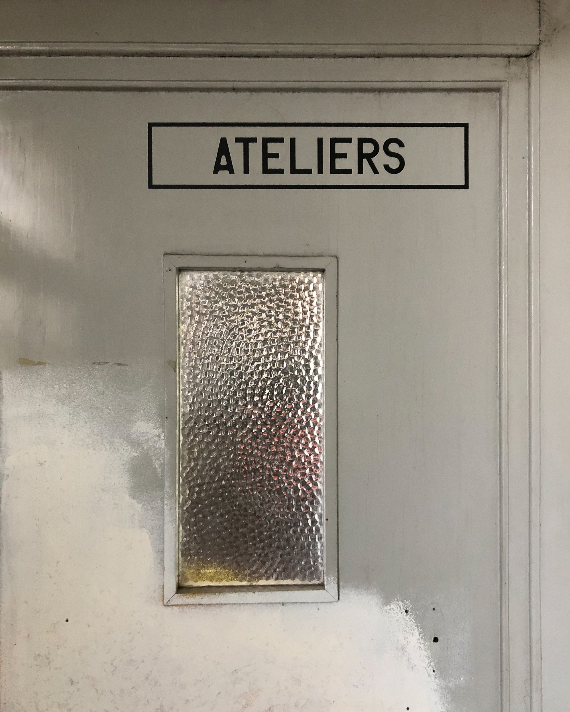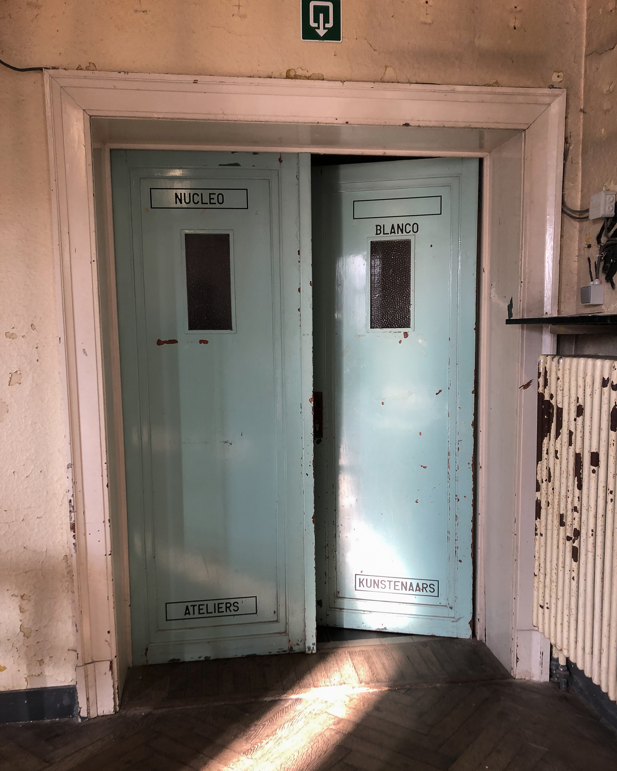 Signage in the Veeartsenij, a former school for veterinarians in downtown Ghent, Belgium. Since 2015, a wing of the building has been under management by Nucleo, an organization that “tackles vacancy with art”. At this location, one of 14 addresses maintained by the artist association, some 30 artists have found a place to work.